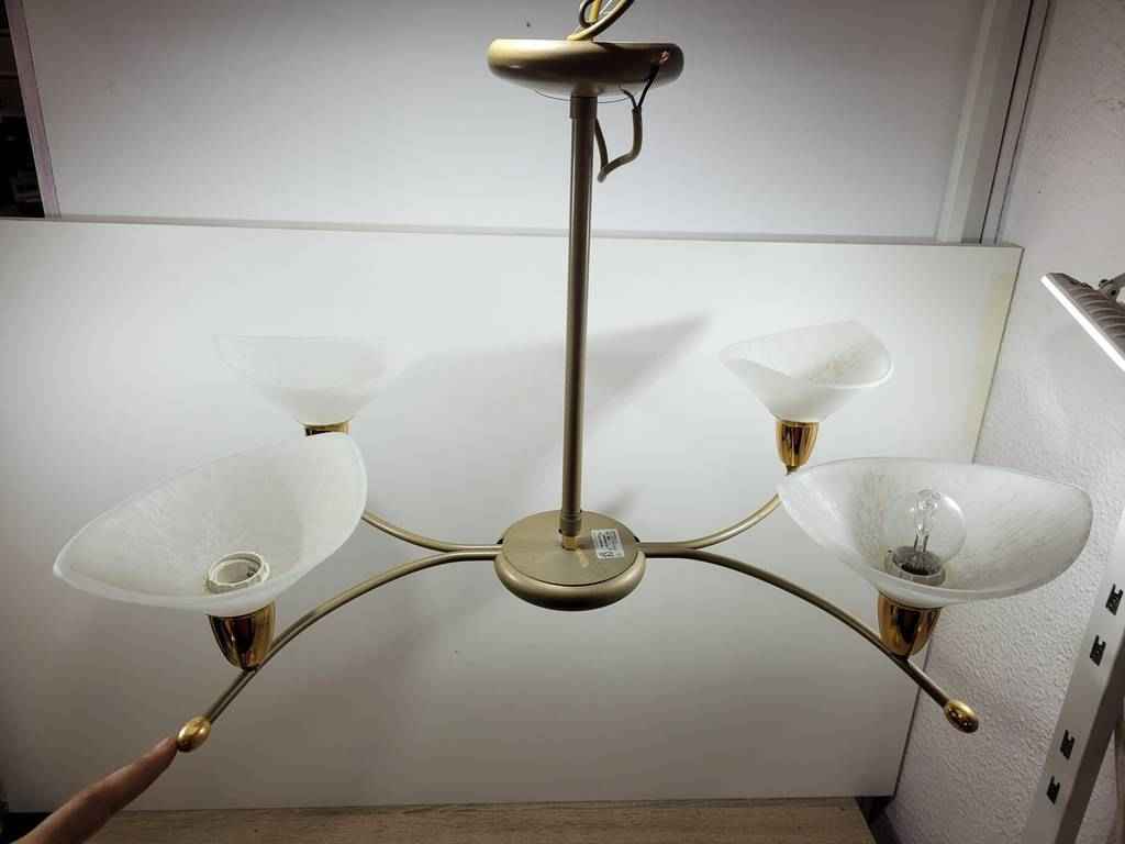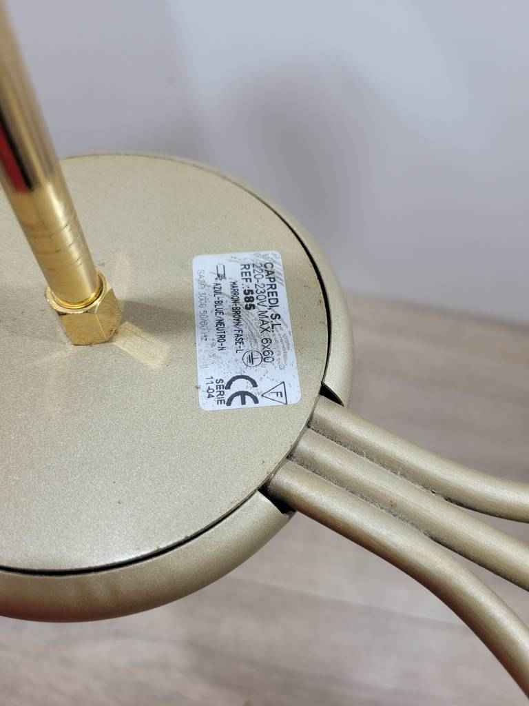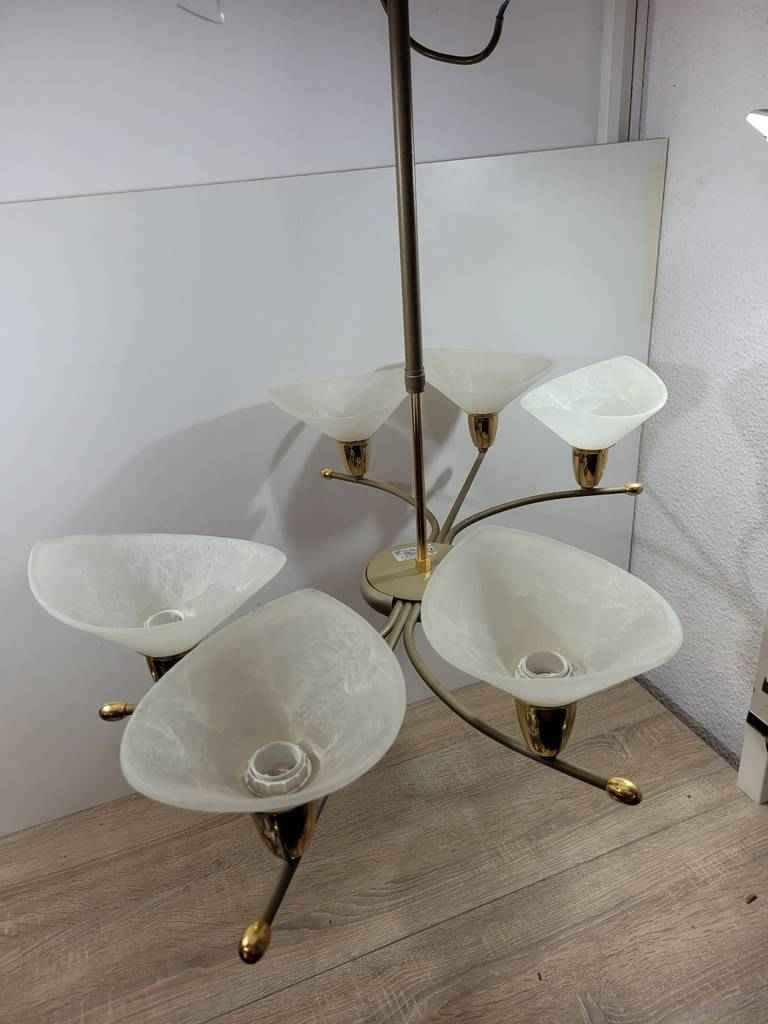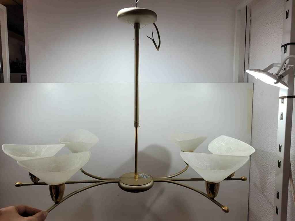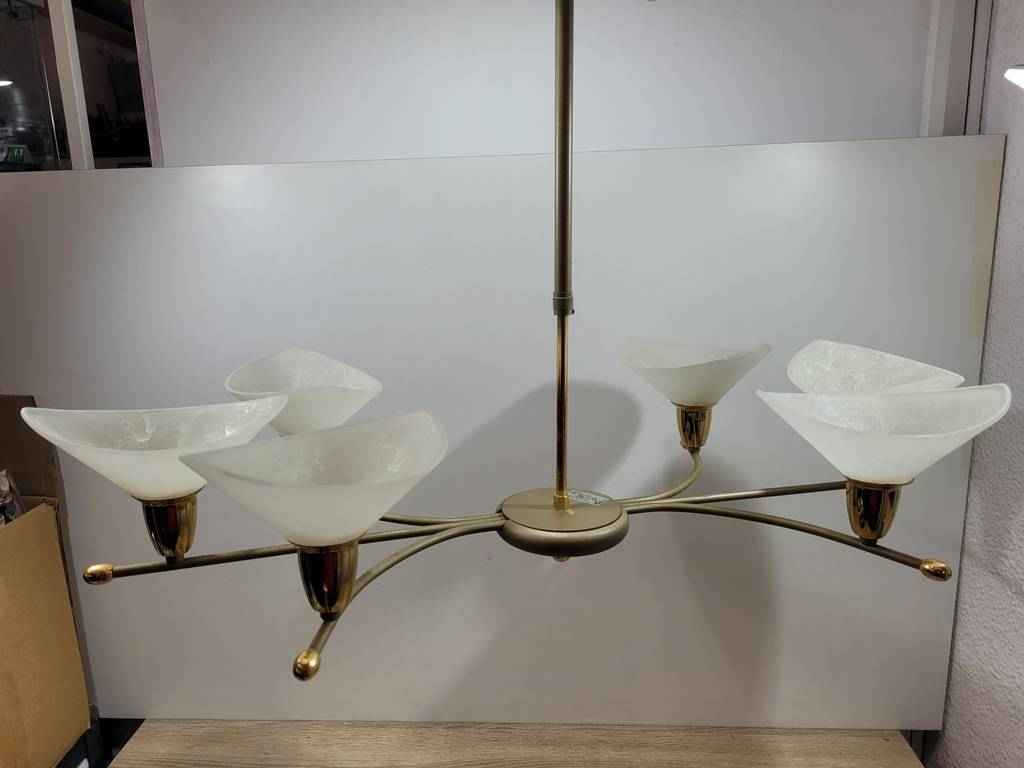 Lámpara de techo muy bonita y original que dispone de una estructura central en color dorado que la hace resaltar. Dispone de seis brazos que terminan en seis puntos de luz y con unas tulipas en forma de flor abierta de cristal opaco. Es ideal para colocar en un pasillo o en un salón comedor. Como podemos observar en las fotografías se encuentra en buenas condiciones.