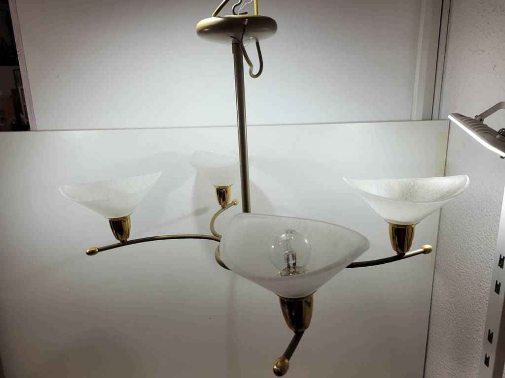 Lámpara de techo muy bonita y original que dispone de una estructura central en color dorado que la hace resaltar. Dispone de cuatro brazos que terminan en cuatro puntos de luz y con unas tulipas en forma de flor abierta de cristal opaco. Es ideal para colocar en un pasillo o en un salón comedor. Como podemos observar en las fotografías se encuentra en buenas condiciones.