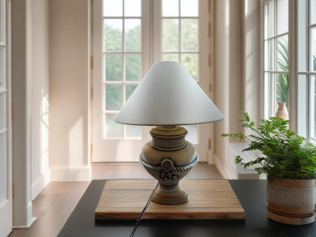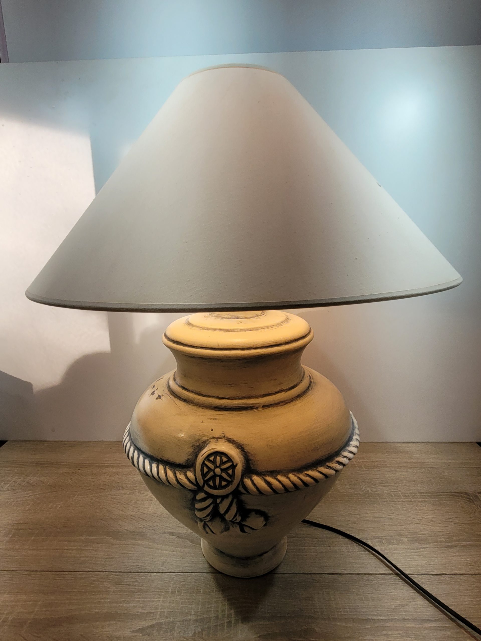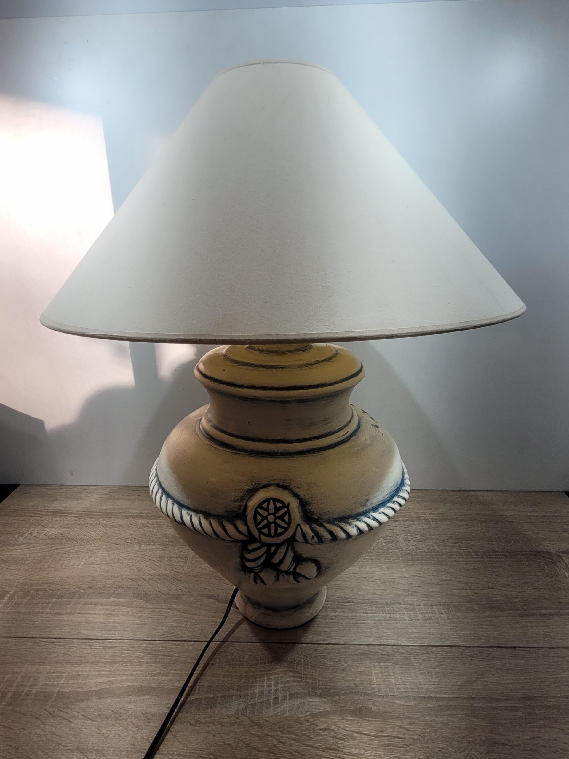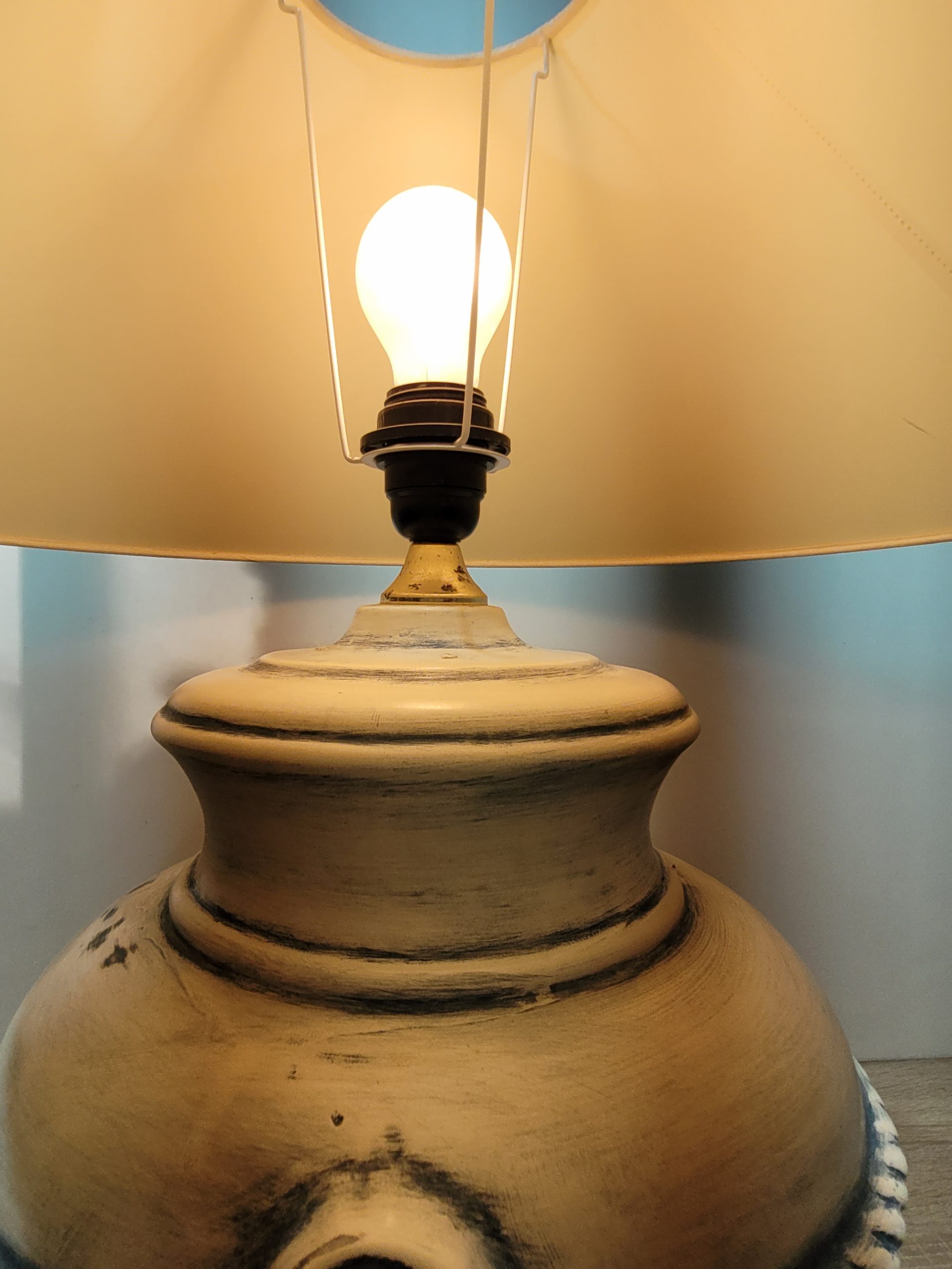 Ref. ✅ O9093 Esta es una lámpara de sobremesa de cerámica vintage con un marcado estilo rústico o clásico francés. Su diseño se caracteriza por una base en forma de jarrón o urna con detalles ornamentales que le confieren un aspecto artesanal y antiguo. Lámpara de mesa con base de cerámica de alta calidad en color blanco antiguo o marfil con efecto envejecido o craquelado. Incluye una pantalla cónica de gran tamaño en un tono neutro (gris claro o beige), ideal para crear una iluminación ambiental cálida y acogedora.