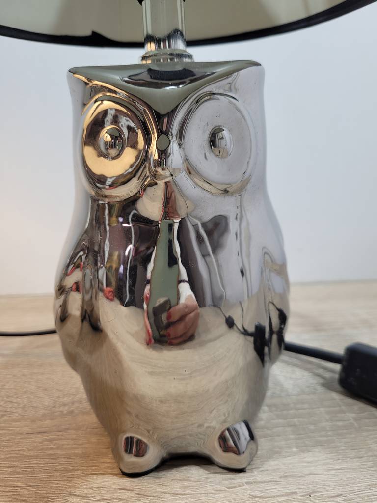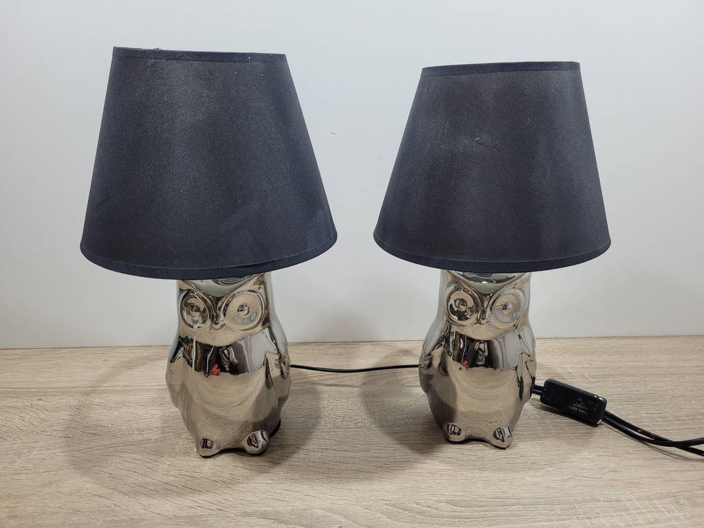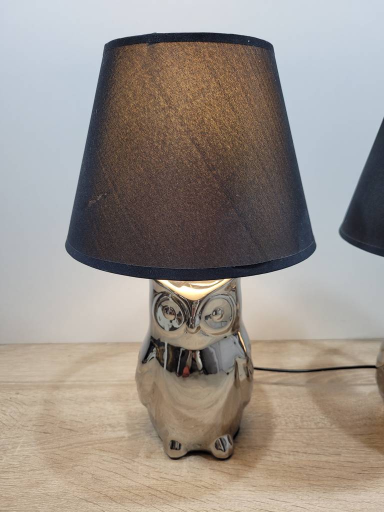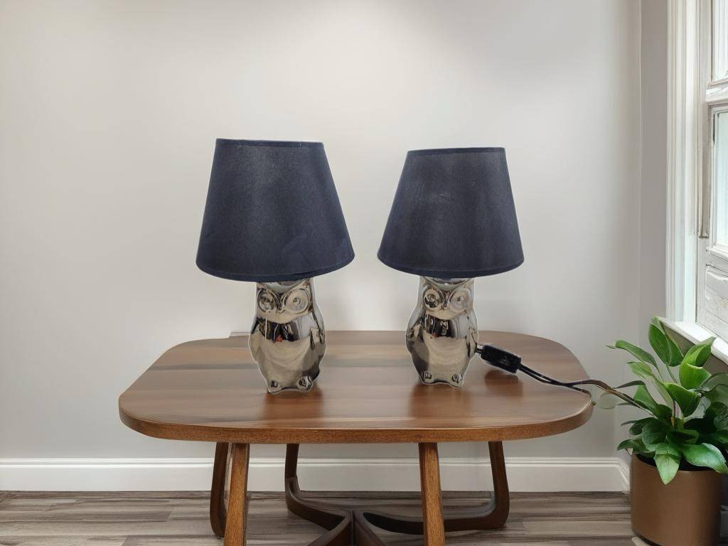 Ref. ✅ O9208 Este exclusivo par de lámparas de sobremesa con forma de búho, con su diseño contemporáneo combina perfectamente con estilos modernos, industriales o de transición. Base de cerámica con un acabado plateado cromado de alto brillo que captura la luz de forma espectacular. Pantalla de tela en color negro, ideal para crear una iluminación cálida y acogedora en cualquier habitación. Son perfectas como lámparas de noche para el dormitorio, o como piezas decorativas en la sala de estar o recibidor. Se encuentran en excelente estado, listas para iluminar tu espacio favorito.