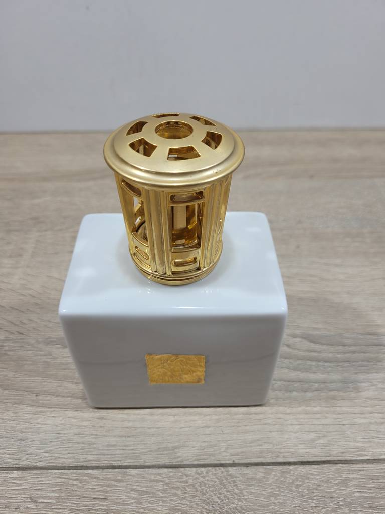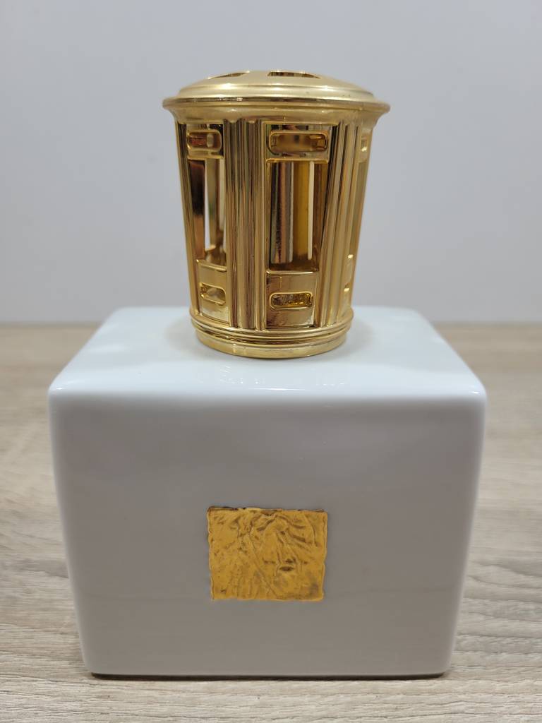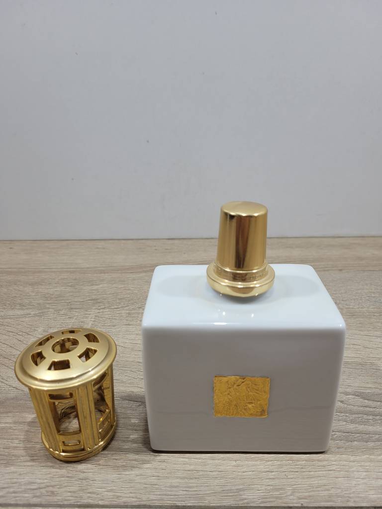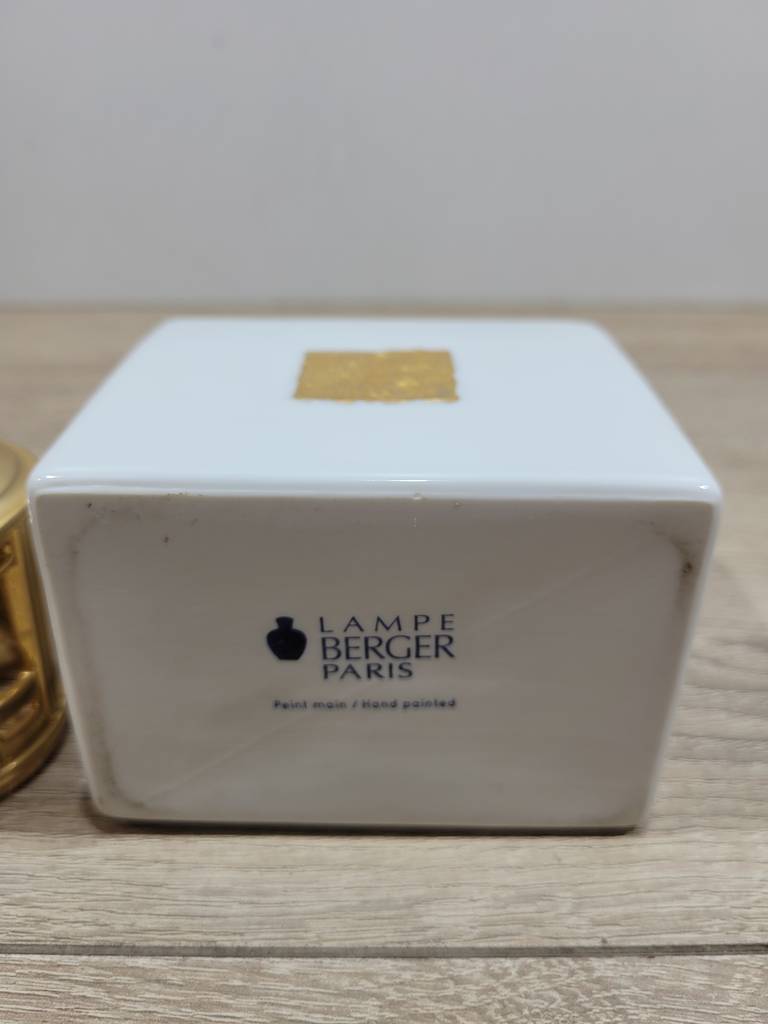 Lampe Berger Paris. Se trata de una lámpara perfumadora que fue creada en 1898 por Maurice Berger en Francia. Con un color dorado brillante se encuentra sobre una base de color blanco grande. Es un elemento decorativo ideal para resaltar en nuestro salón comedor o recibidor. Como podemos observar en las fotografías se encuentra en buenas condiciones.