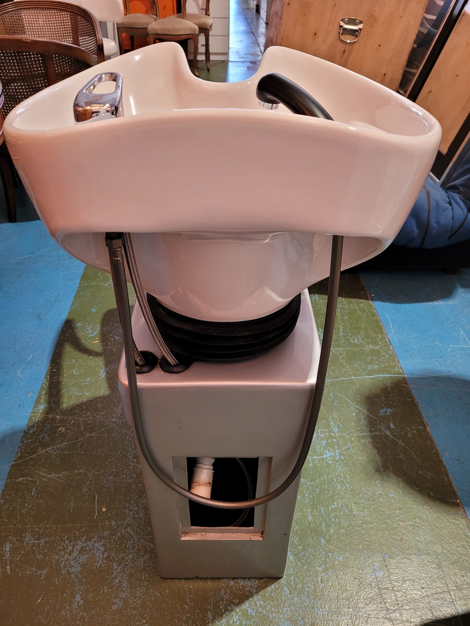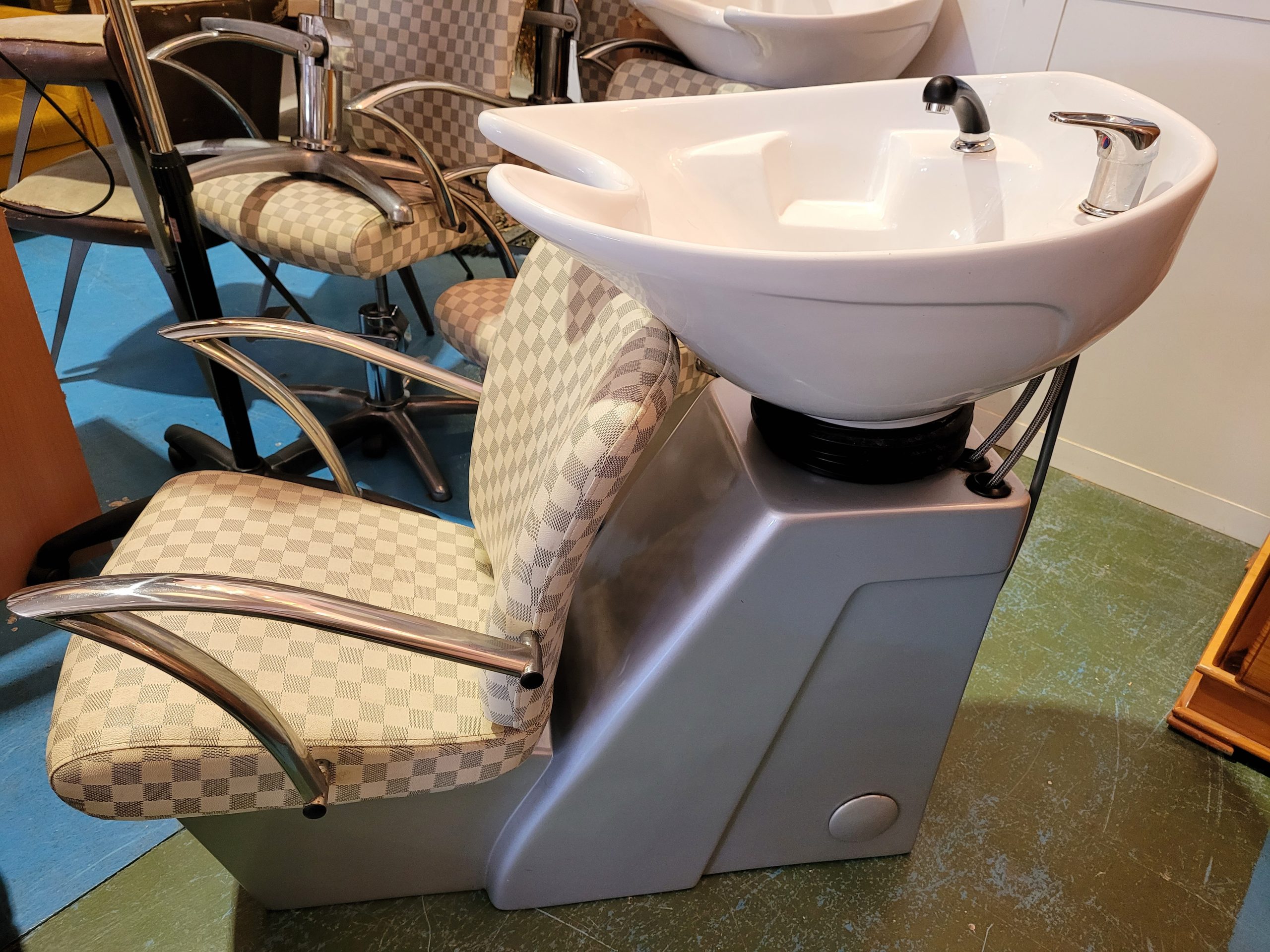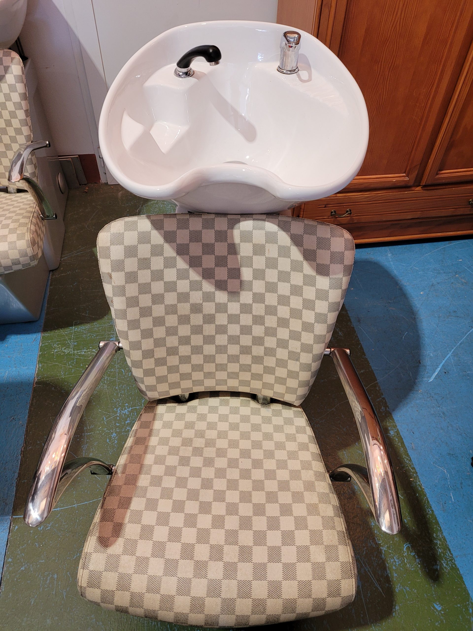 Ref. ✅ O8918 Este lavacabezas de peluquería de alta gama, ideal para salones de belleza, barberías o estéticas que buscan combinar comodidad, funcionalidad y un estilo único. Asiento y respaldo acolchonados con un distintivo patrón a cuadros en tonos beige y blanco, que proporciona la máxima comodidad. La base sólida está acabada en un elegante color plateado/gris, con reposabrazos metálicos cromados que añaden durabilidad y un toque moderno. Fabricado con materiales de alta calidad, resistentes al agua y fáciles de mantener limpios, lo que optimiza la higiene del salón.