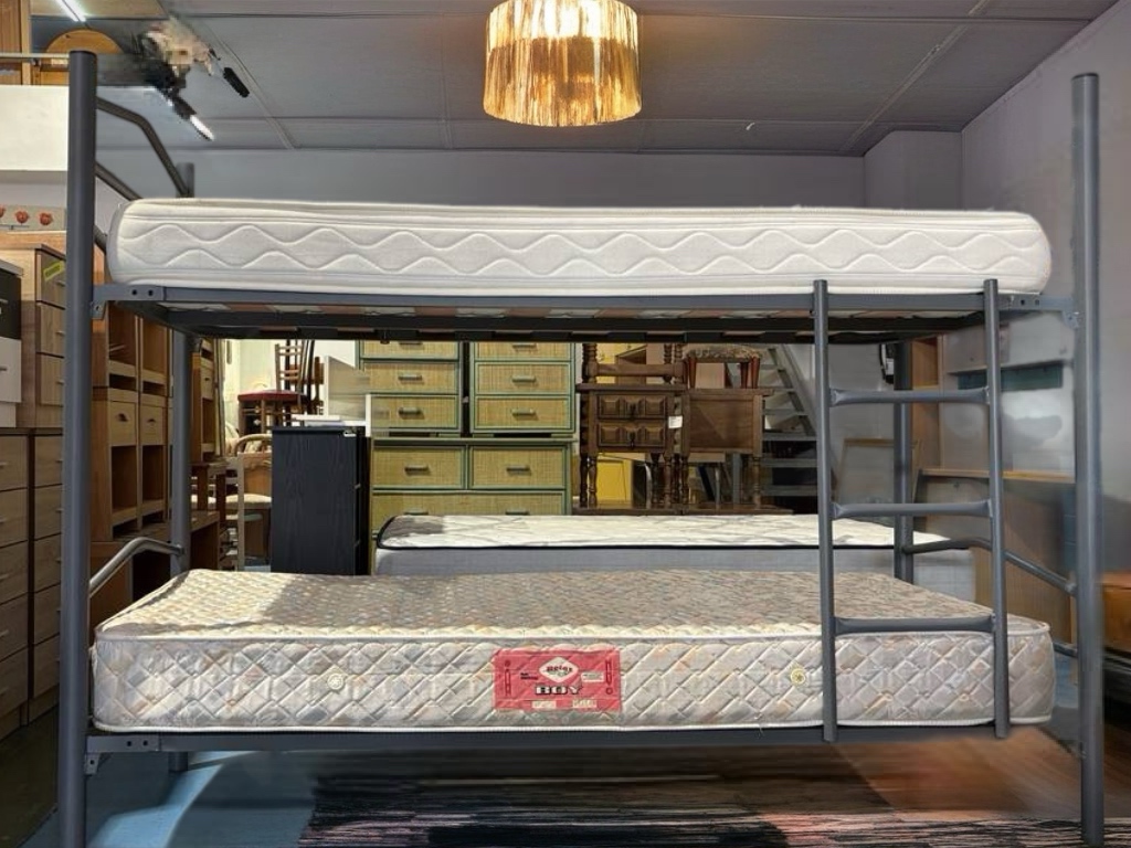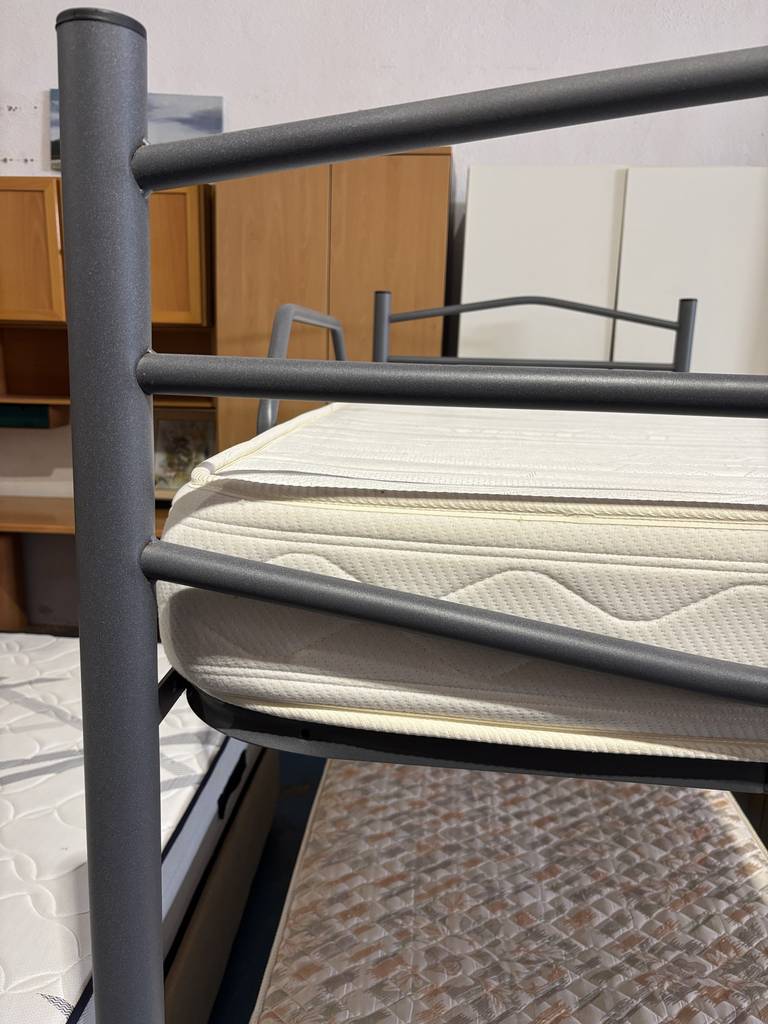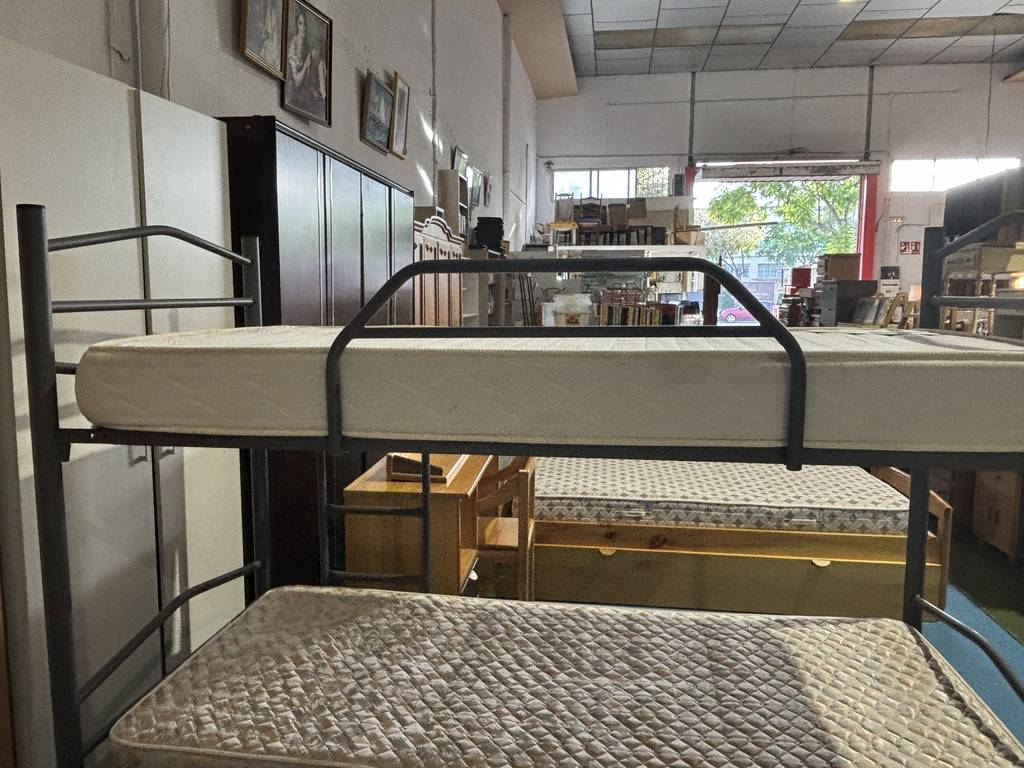 Ref. ✅ O8745 Litera metálica con estructura doble, ideal para optimizar el espacio en habitaciones infantiles, juveniles o de invitados. La estructura es de metal resistente, con un diseño moderno en un tono gris o negro mate. Ofrece durabilidad y resistencia, siendo una opción más ligera y económica en comparación con las de madera. La estructura cuenta con barandillas de seguridad en la cama superior para evitar caídas y una escalera para facilitar el acceso.