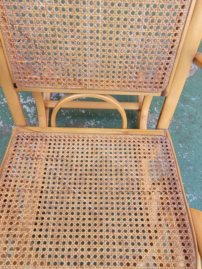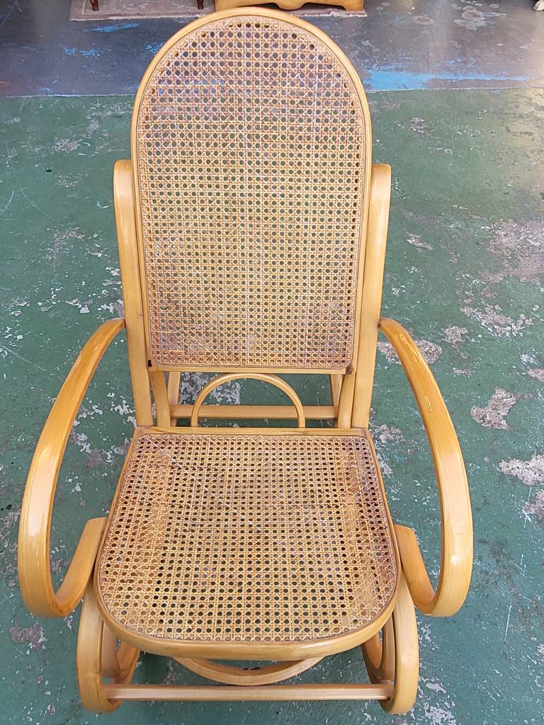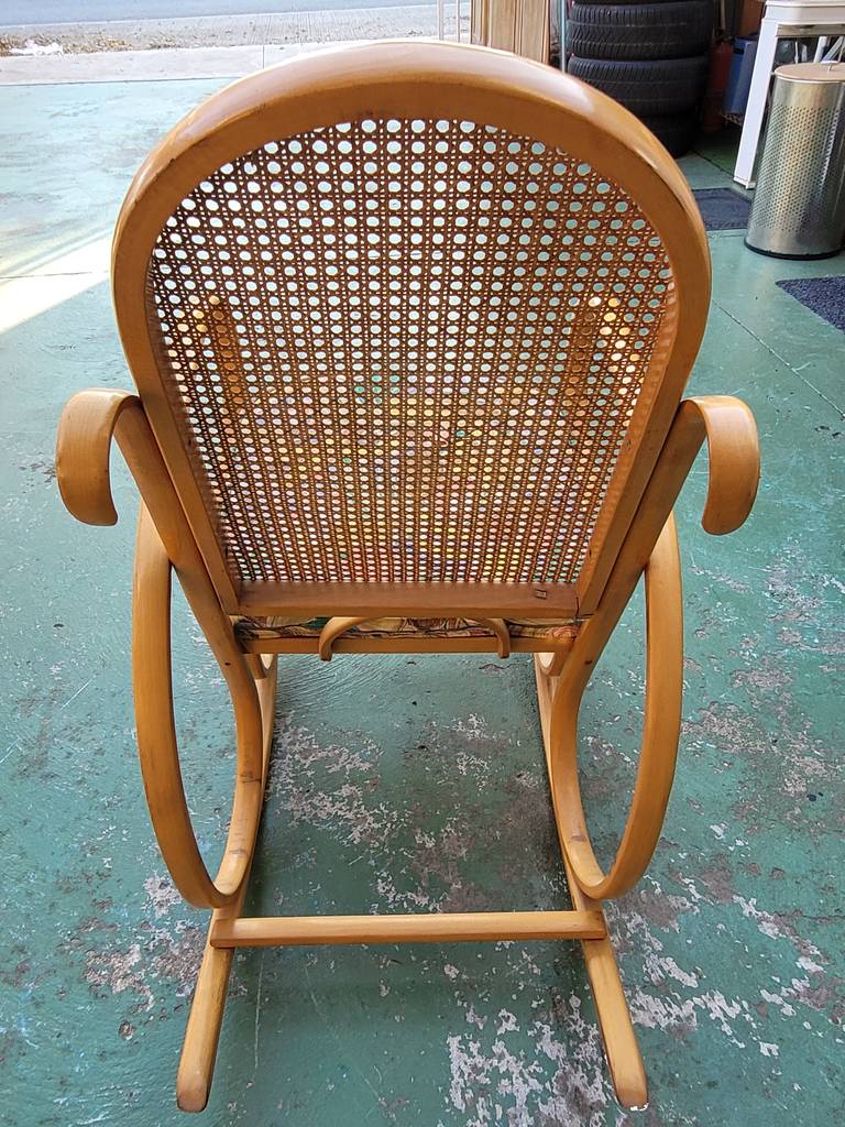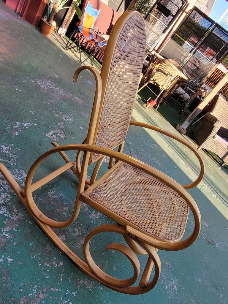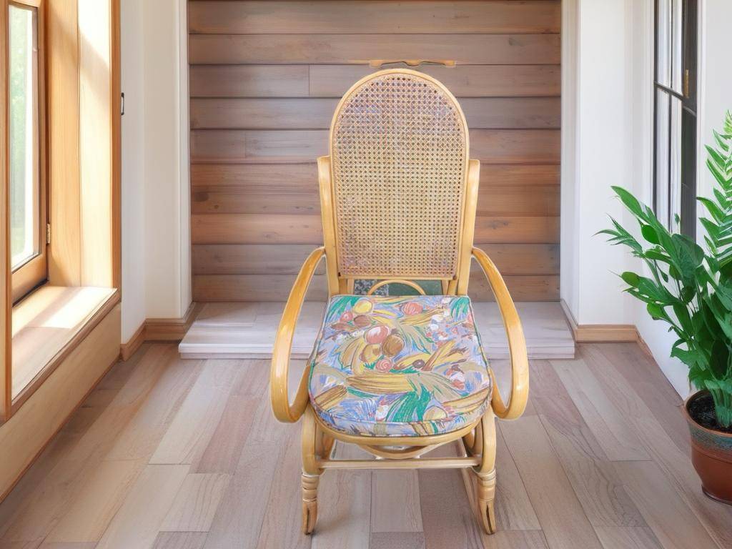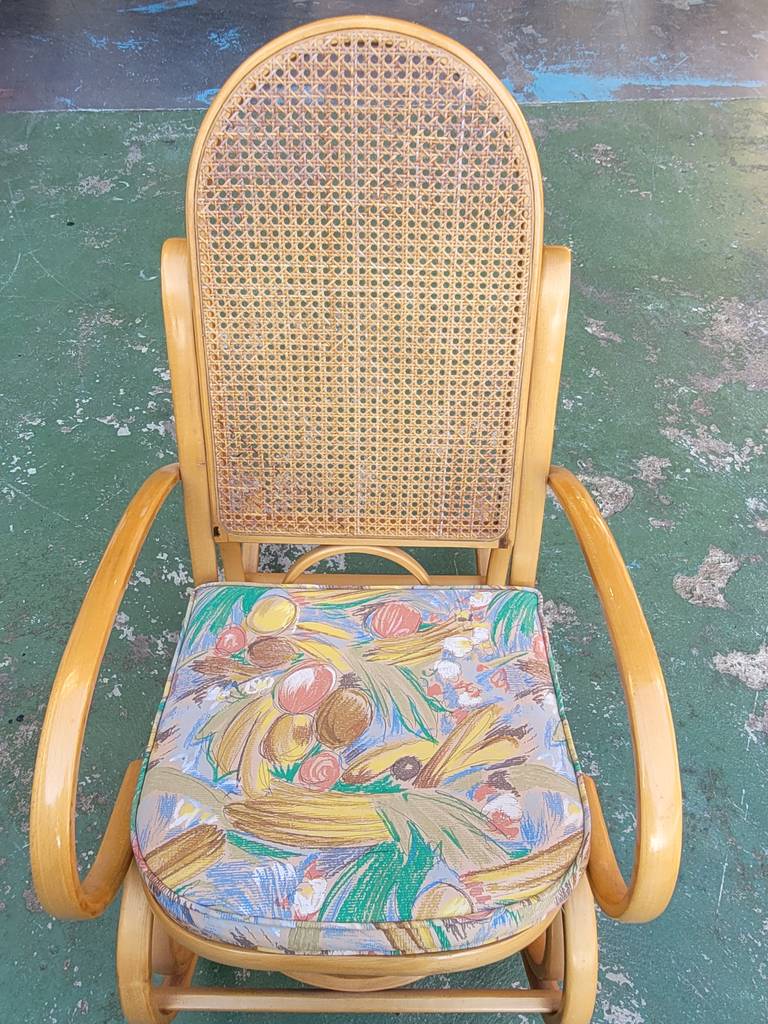 Ref. ✅ O8900 Esta es una silla mecedora clásica con un diseño elegante, fabricada con auténtica madera curvada y ratán natural tejido, conocidos por su durabilidad y ligereza. Incluye un cojín tapizado con un patrón floral/frutal vibrante para mayor comodidad y un toque de color. El movimiento suave y relajante de balanceo ayuda a reducir el estrés y la ansiedad, convirtiéndola en el lugar perfecto para leer, amamantar o simplemente descansar. Esta pieza es una adición versátil y acogedora para cualquier sala, balcón, terraza o rincón de lectura.