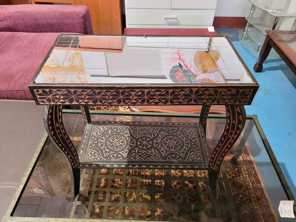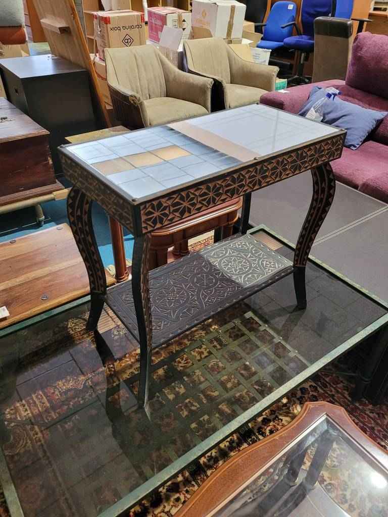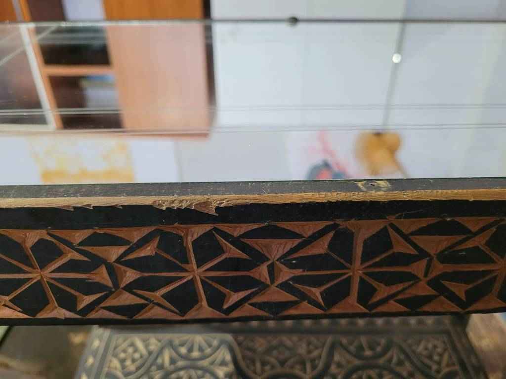 Mesa o recibidor de estilo árabe muy bonito y único que ha sido realizado con madera de cedro de buena calidad y robusta. Se compone de múltiples formas que lo hacen resaltar y que han sido realizadas con mucha precisión y detalle. Su parte superior tiene un cristal a modo de espejo con finas líneas de color negro. Como podemos observar en las fotografías presenta desperfectos.