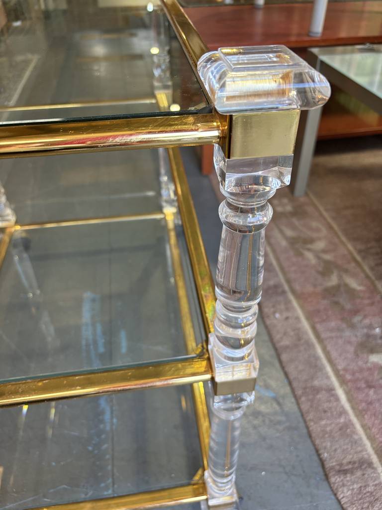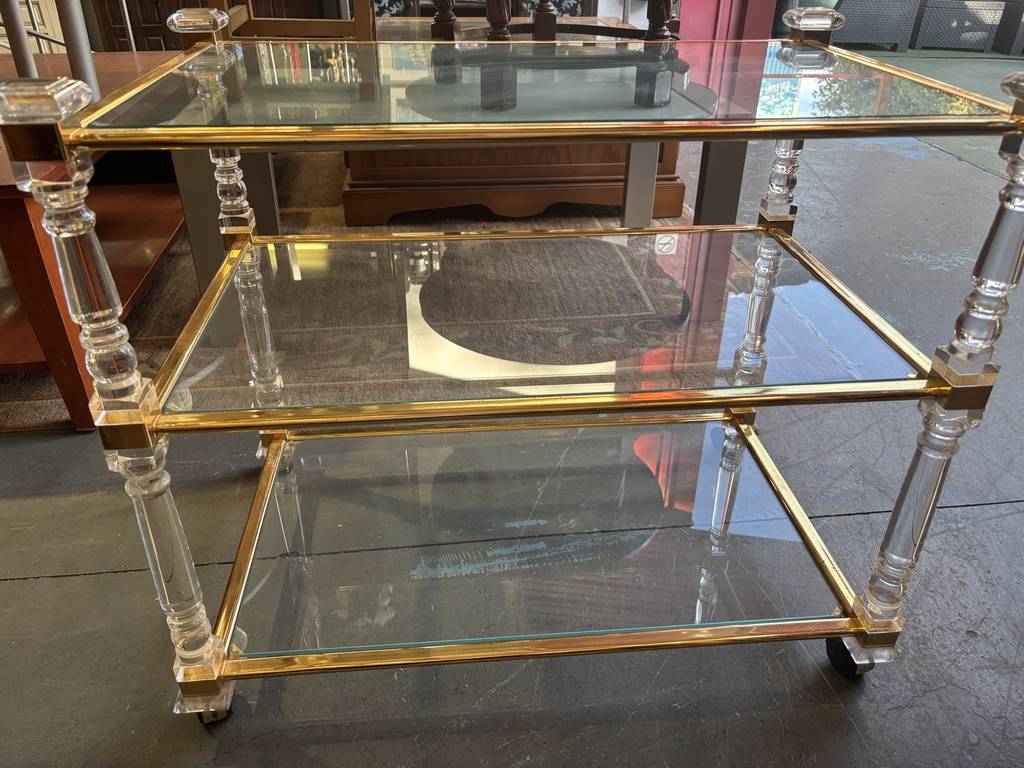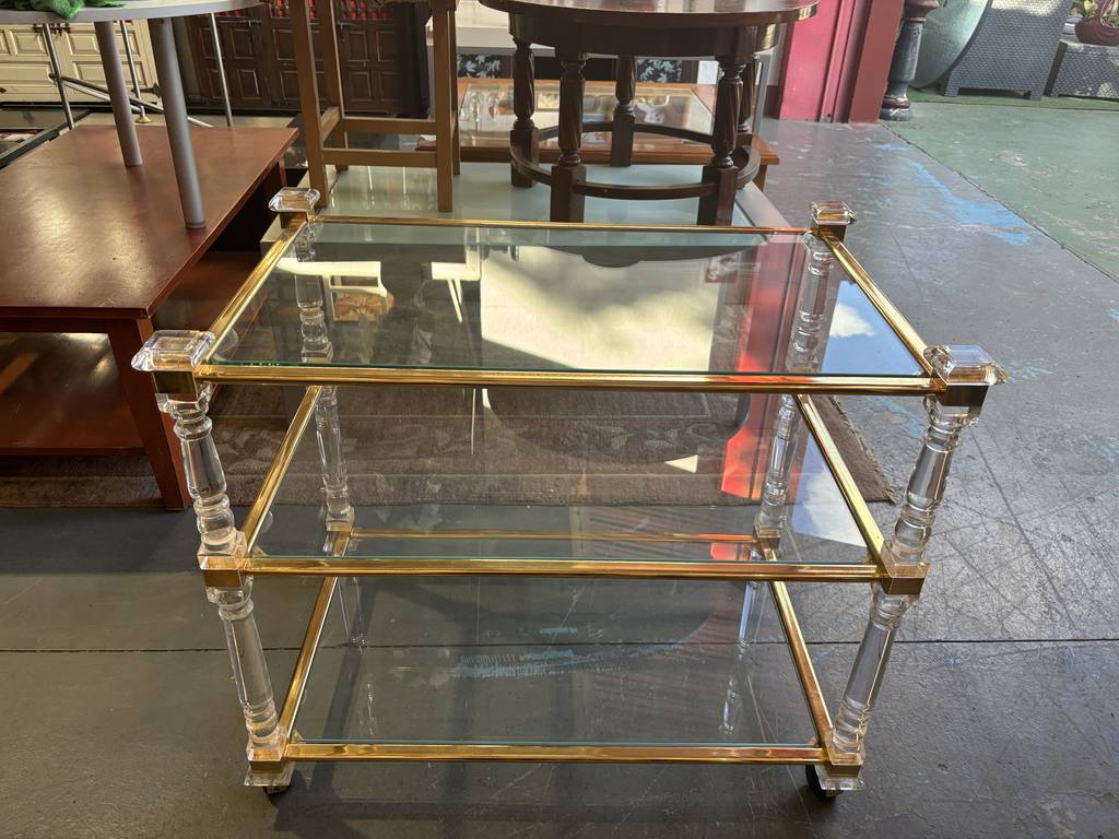 Ref. ✅O8717 Este es un elegante carrito auxiliar de tres niveles con un diseño moderno y glamuroso, cuenta con una estructura de metal con acabado dorado pulido, estantes de vidrio transparente y patas de acrílico transparente con detalles torneados. Su estilo contemporáneo y sofisticado, con una combinación de materiales que aportan ligereza visual y un toque de lujo.Cuenta con tres amplios niveles de almacenamiento o exhibición. Equipado con ruedas (ruedecillas) para facilitar la movilidad.