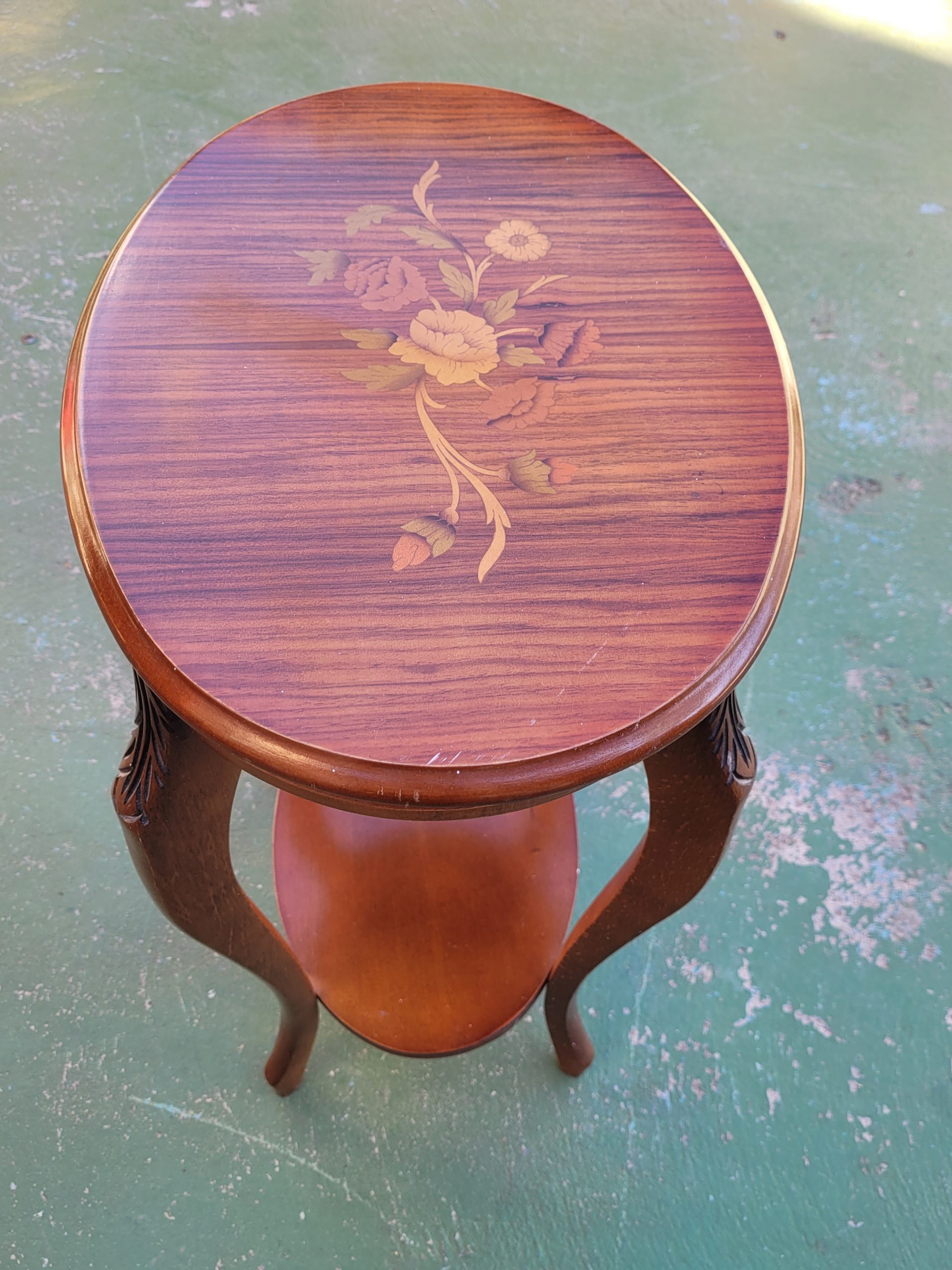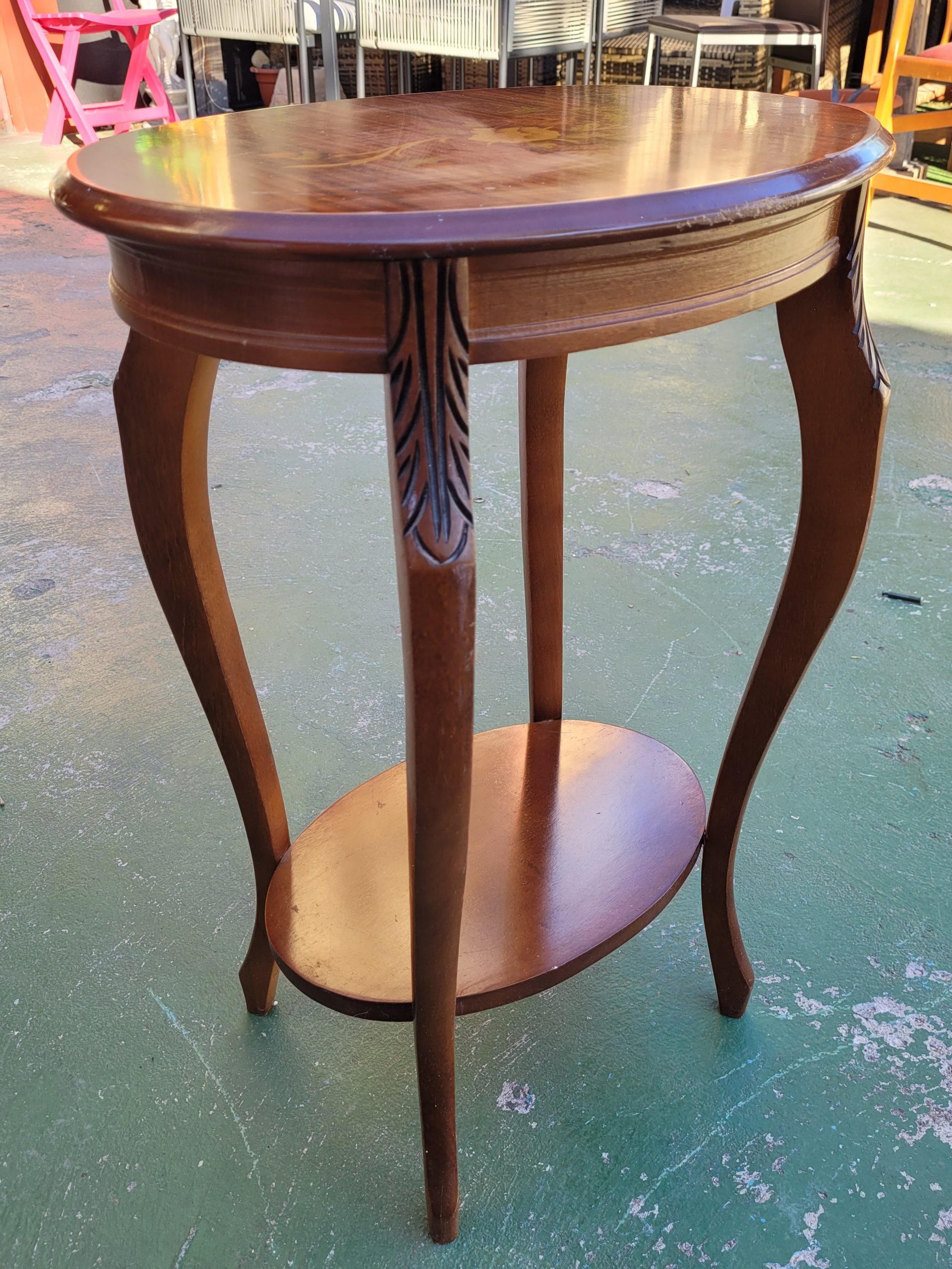 Ref. ✅ O9135 Esta mesita auxiliar ovalada de dos niveles, presenta un diseño de estilo clásico y atemporal, ideal para complementar decoraciones tradicionales o de estilo vintage. Estructura de madera maciza con un acabado en color nogal o caoba que resalta la veta natural de la madera. El tablero superior cuenta con incrustaciones de marquetería con motivos florales. Además, la parte superior de las patas presenta tallas decorativas que añaden un toque de distinción. Incluye un estante inferior ovalado que ofrece superficie adicional para almacenamiento o exhibición.