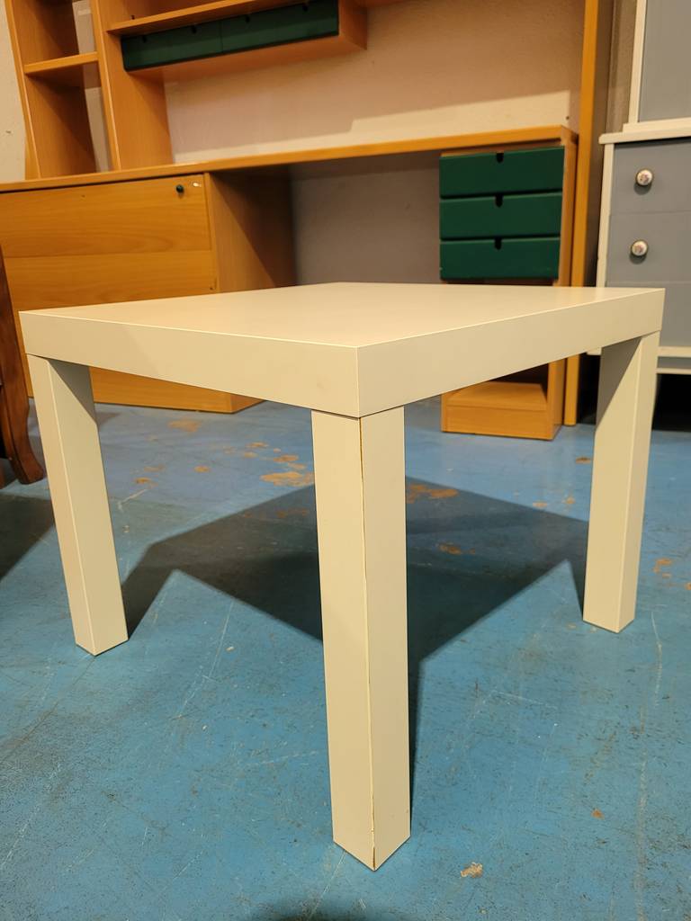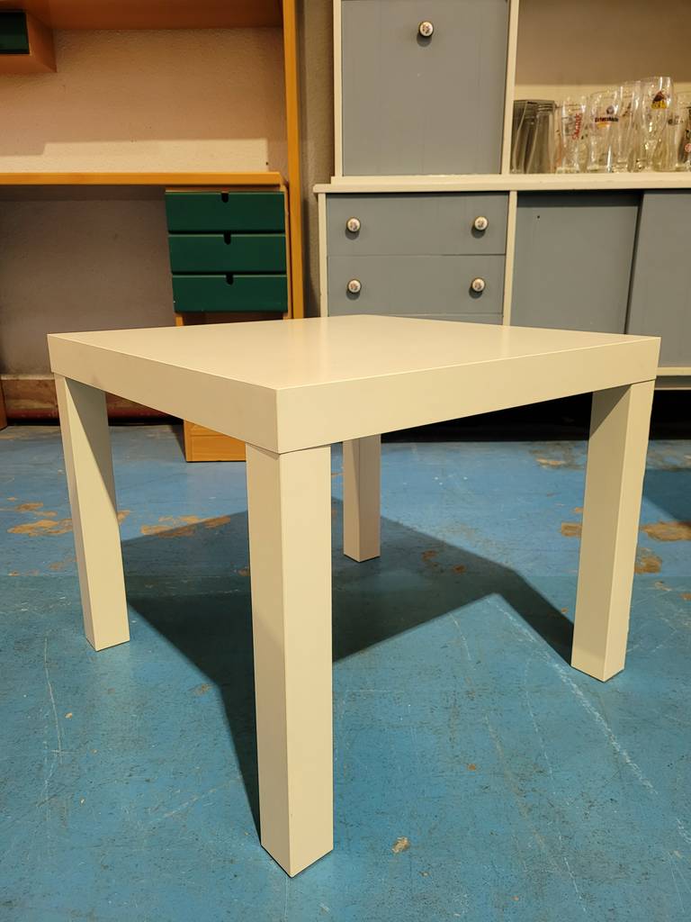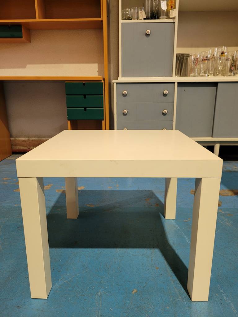Mesa de la reconocida marca de muebles Ikea. Se trata de una mesa con forma cuadrada que ha sido realizada en melamina de buena calidad y robusta. Es una mesa muy versátil que nos puede servir de mesa de centro o de mesa auxiliar en un salón comedor, por ejemplo. Como podemos observar en las fotografías presenta un ligero rasguño, pero en general se encuentra en buenas condiciones.