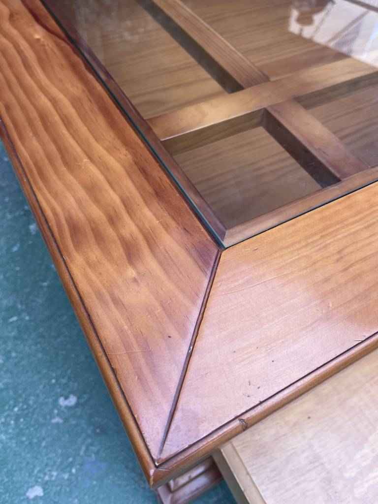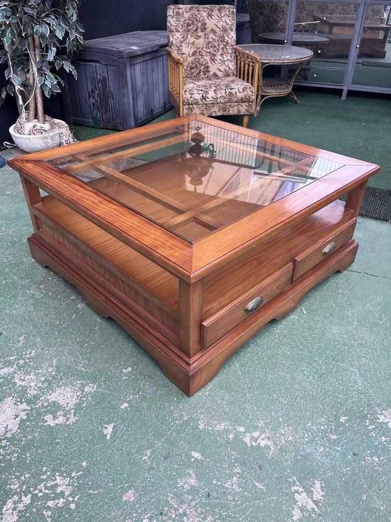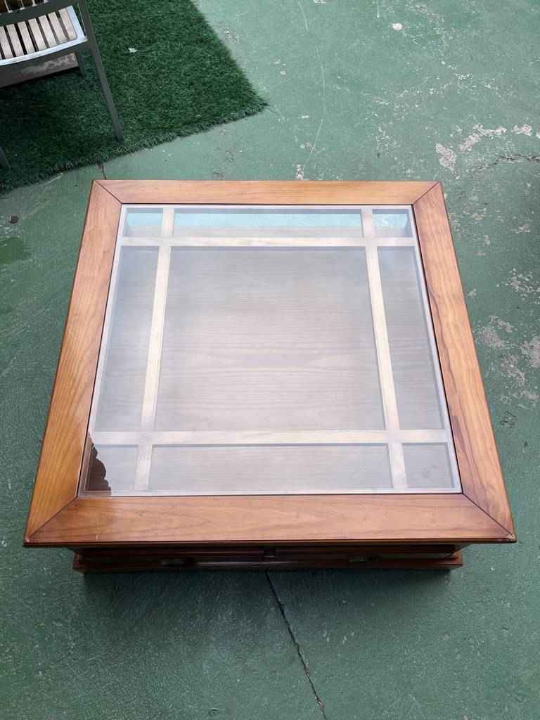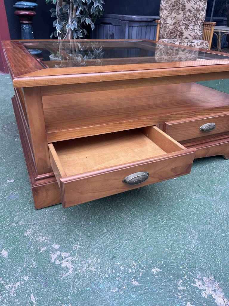 Mesa de centro de gran tamaño y con forma cuadrada que ha sido realizada con madera de pino de buena calidad y robusta. Dispone en un lateral de dos cajones y en la parte media de un gran habitáculo abierto ideal para colocar revistas o libros. La parte superior un buen cristal transparente que la hace muy elegante. Ideal para colocar en un salón comedor. Como podemos observar en las fotografías presenta desperfectos.