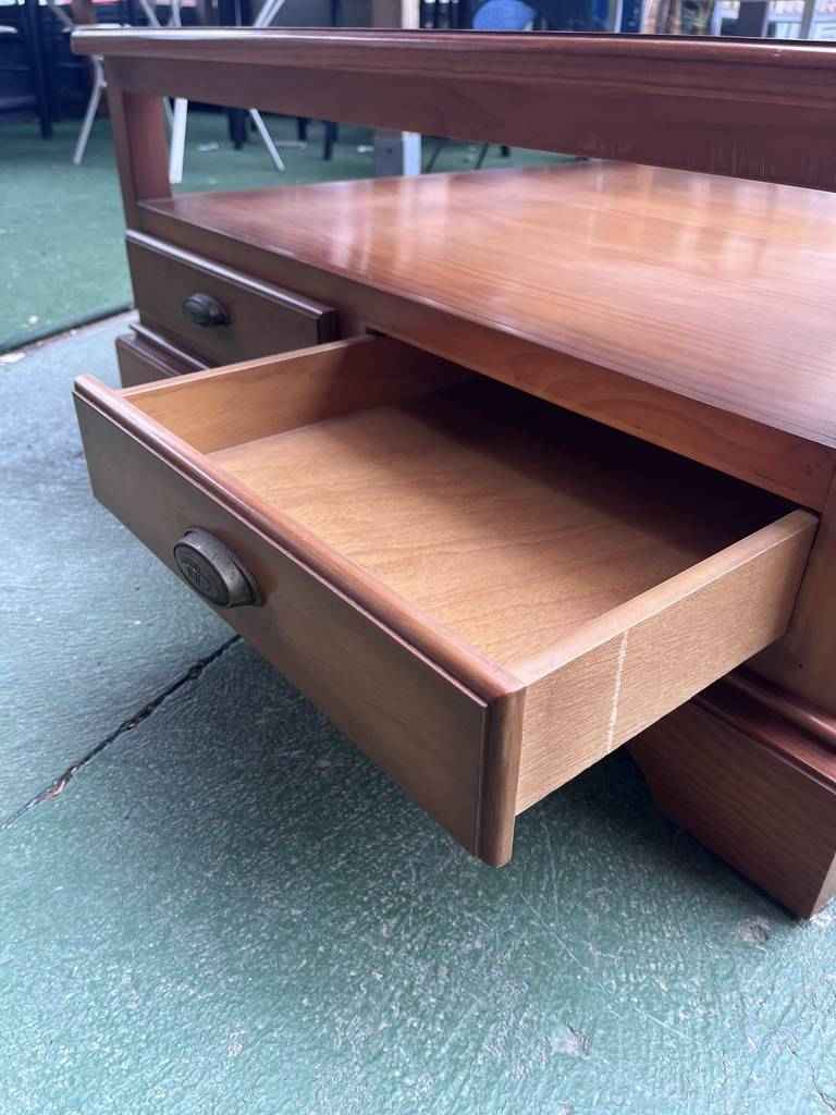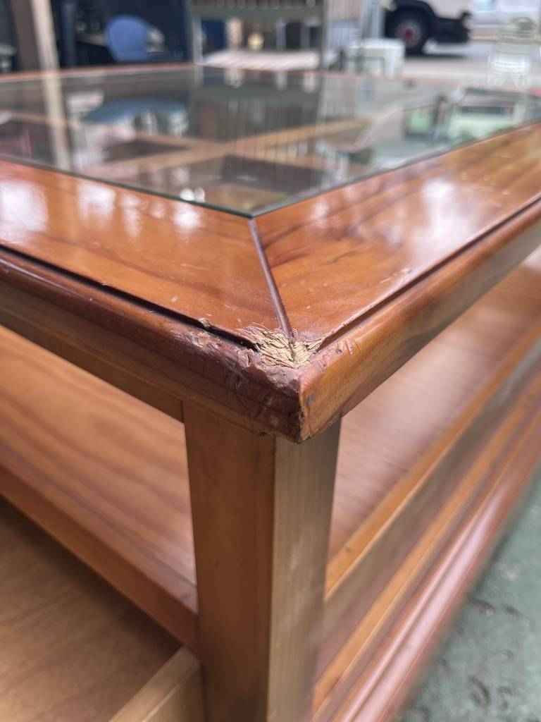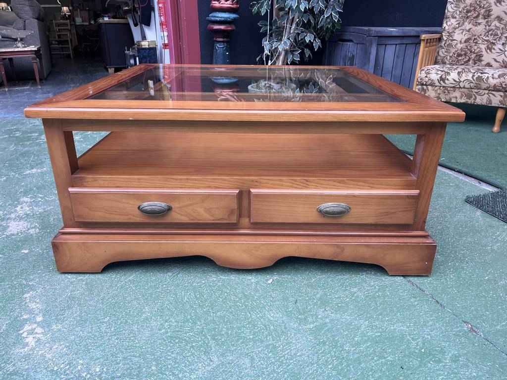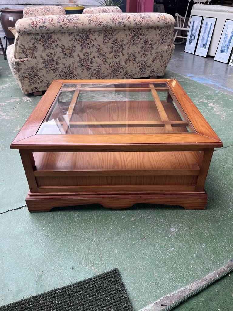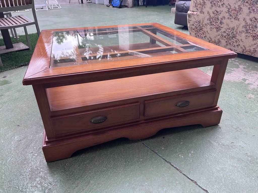 Mesa de centro de gran tamaño y con forma cuadrada que ha sido realizada con madera de pino de buena calidad y robusta. Dispone en un lateral de dos cajones y en la parte media de un gran habitáculo abierto ideal para colocar revistas o libros. La parte superior un buen cristal transparente que la hace muy elegante. Ideal para colocar en un salón comedor. Como podemos observar en las fotografías presenta desperfectos.