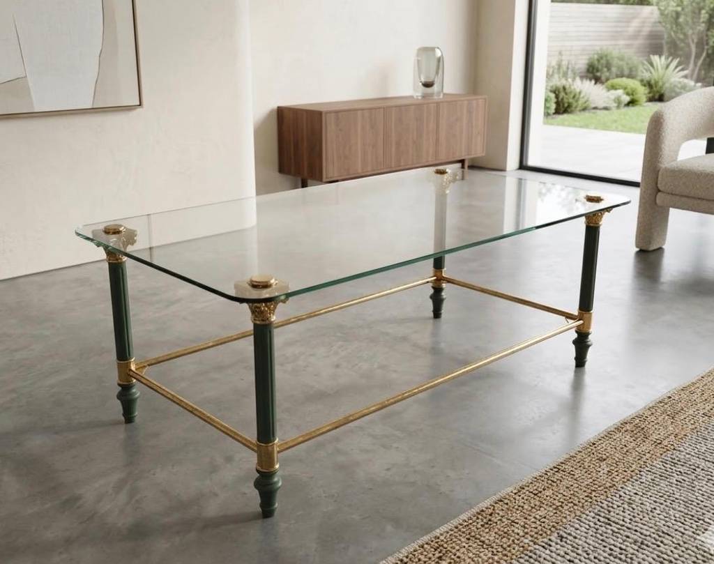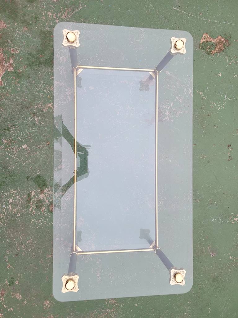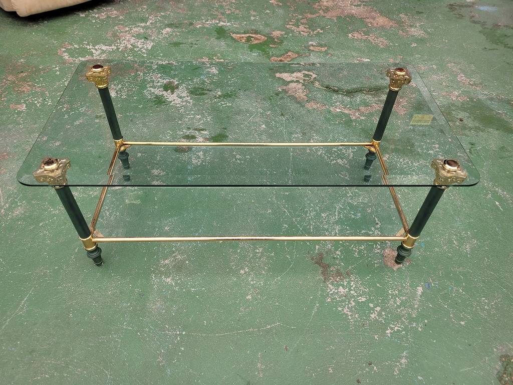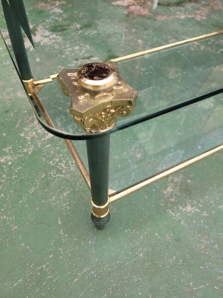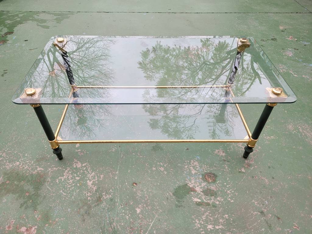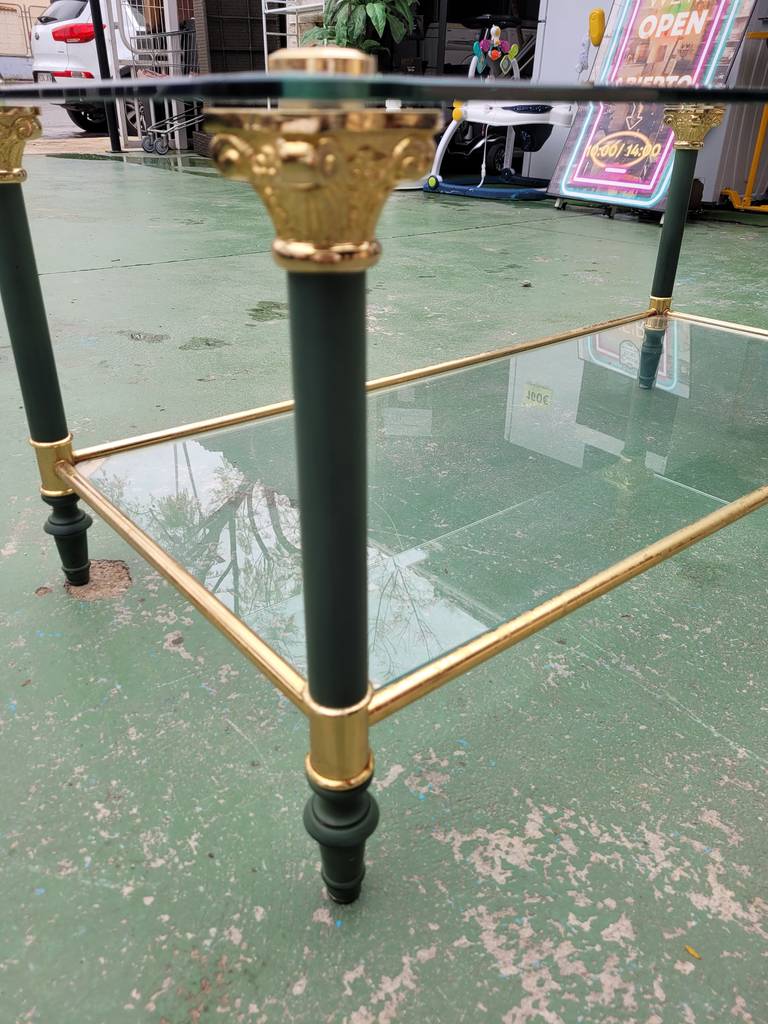 Ref. ✅ O9270 Esta es una elegante y sofisticada mesa de centro de dos niveles, que combina a la perfección el cristal transparente con una estructura metálica de alta calidad. Su diseño ligero y refinado la convierte en la pieza ideal para salones que buscan un toque de distinción clásica y modernidad. El nivel superior sirve como superficie principal, mientras que el inferior es ideal para libros o decoración. Patas con remates decorativos de inspiración neoclásica, típicos del estilo Regencia. Se encuentra en perfecto estado y lista para darle una segunda oportunidad.