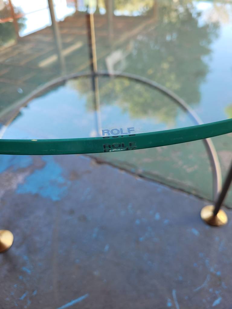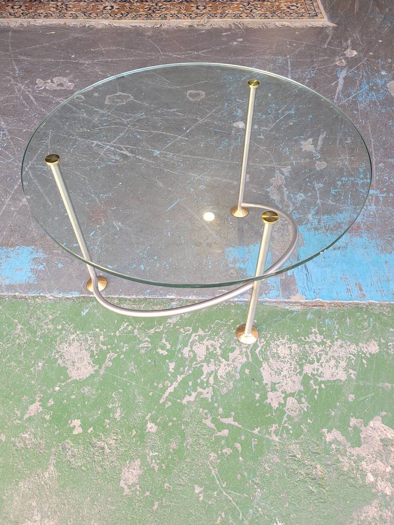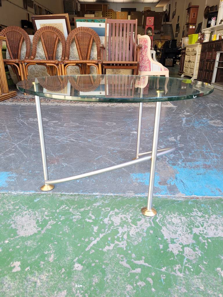 Mesa de centro de cristal con una forma redonda. Se trata de una mesa de centro que tiene tres patas unidas por un metal alargado y tiene una superficie redonda de cristal grueso de buena calidad. Es una mesa ideal para ponerla en el centro de un salón comedor entre el sofá y la televisión. Como se puede observar en las fotografías se encuentra en buenas condiciones.