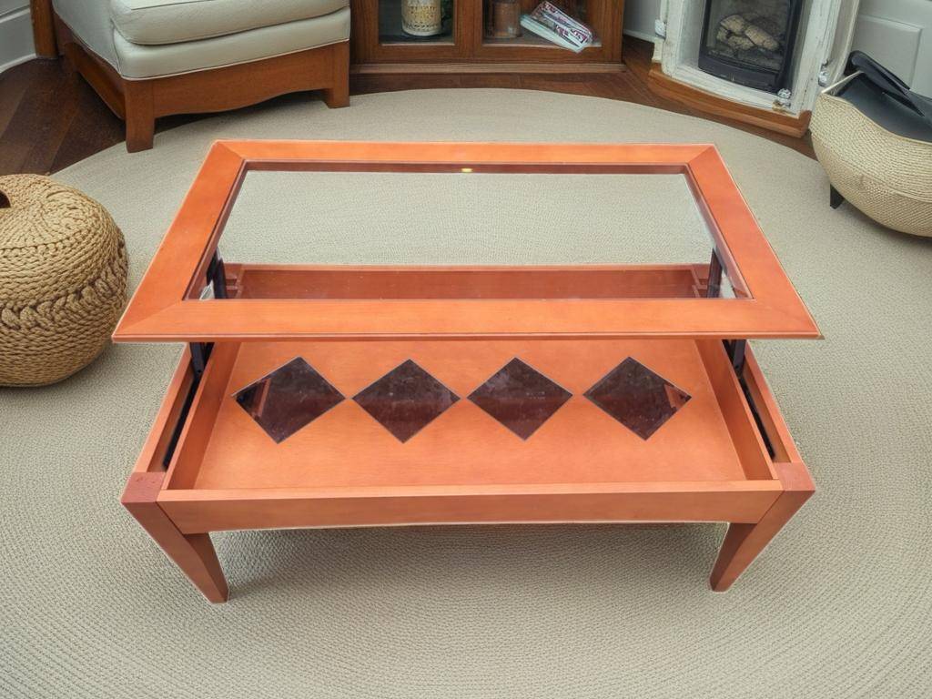 Ref. ✅ O9260 Esta es una mesa de centro elevable con un diseño funcional y elegante, ideal para salones modernos o clásicos. Cuenta con un mecanismo elevable que permite ajustar la altura del sobre, facilitando comer desde el sofá, trabajar con un portátil o utilizarla como mesa auxiliar. Al elevarse, deja al descubierto un amplio compartimento interno, ideal para organizar mandos, revistas o accesorios sin que queden a la vista. El interior presenta un detalle decorativo de rombos. Estructura robusta acabada en tono madera natural (cerezo o nogal) y superficie superior con un cristal resistente y fácil de limpiar. Diseño moderno y limpio que aporta un toque sofisticado a cualquier sala de estar.