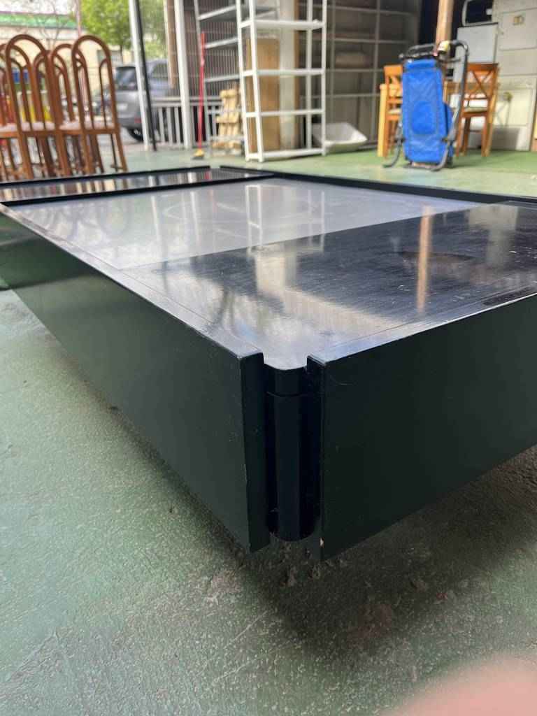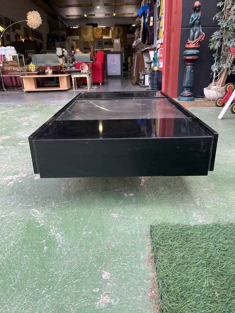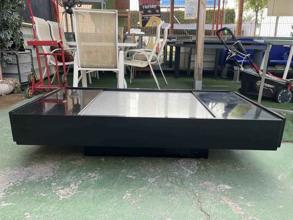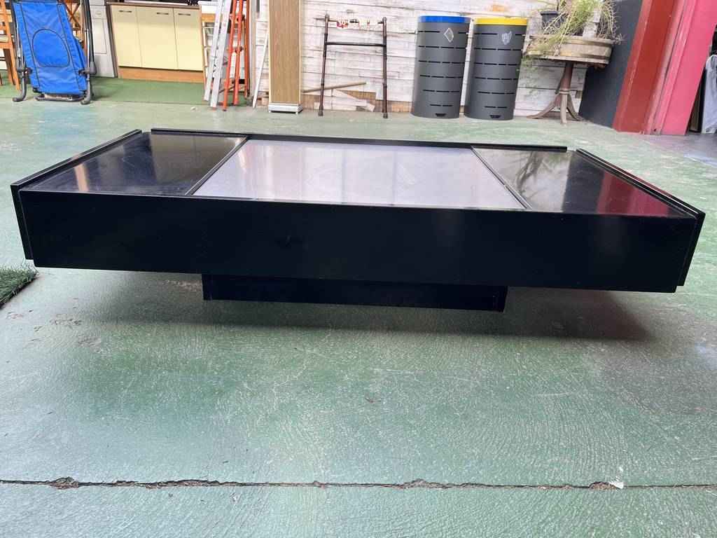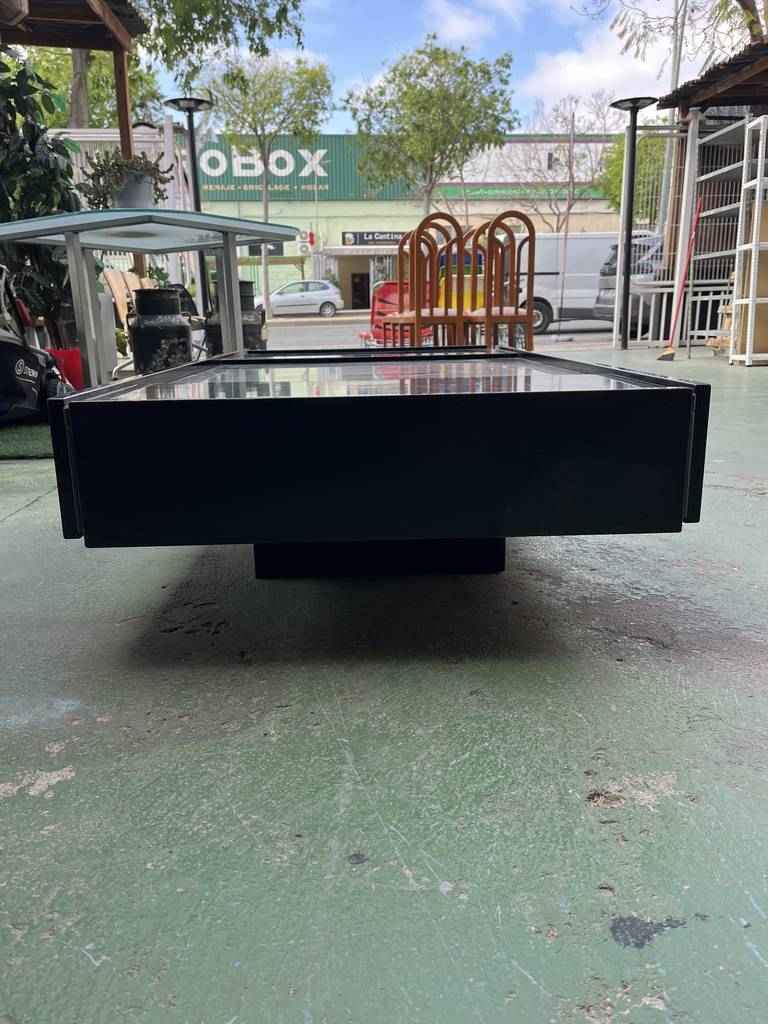 Mesa de centro de estilo vintage con forma rectangular. Se trata de una mesa con un diseño muy único y original. Lacada en color negro y una parte central gris. Es ideal para colocar en un salón comedor frente al sofá. Como podemos observar en las fotografías tiene algún desperfecto.