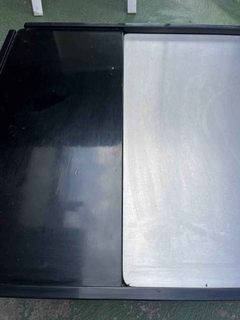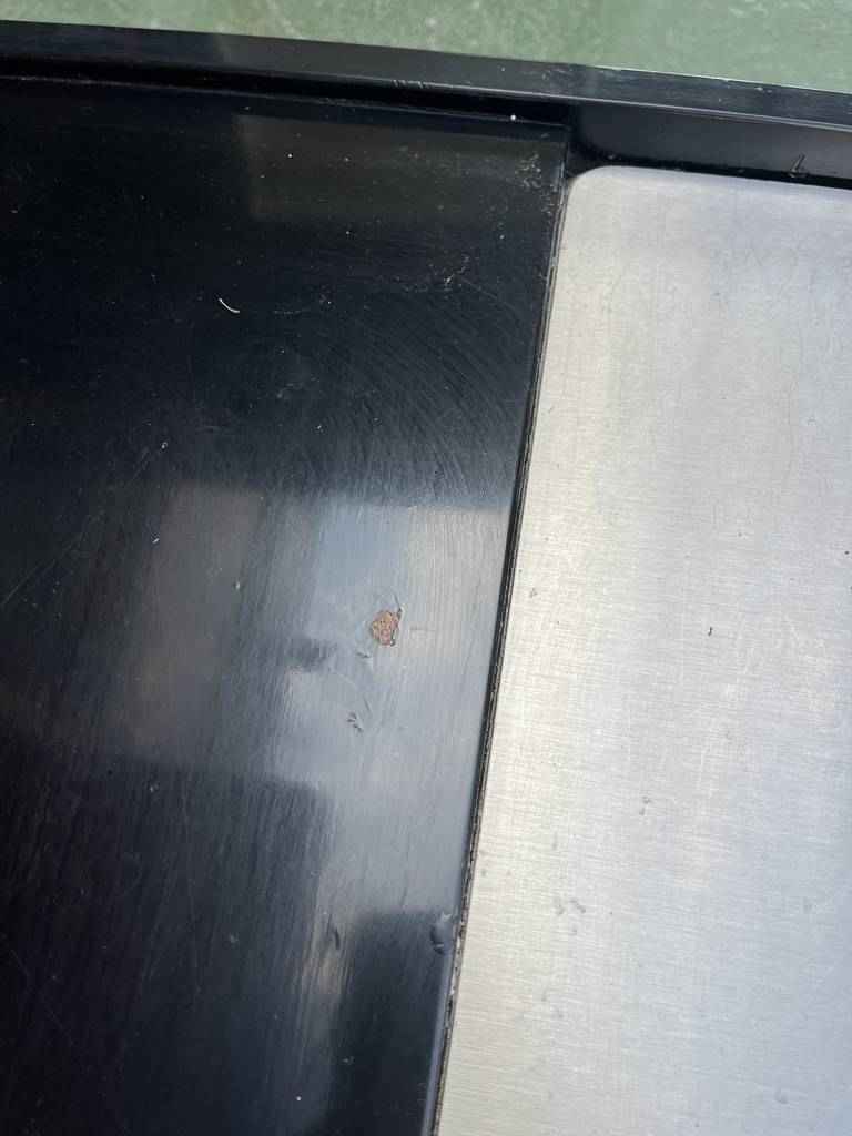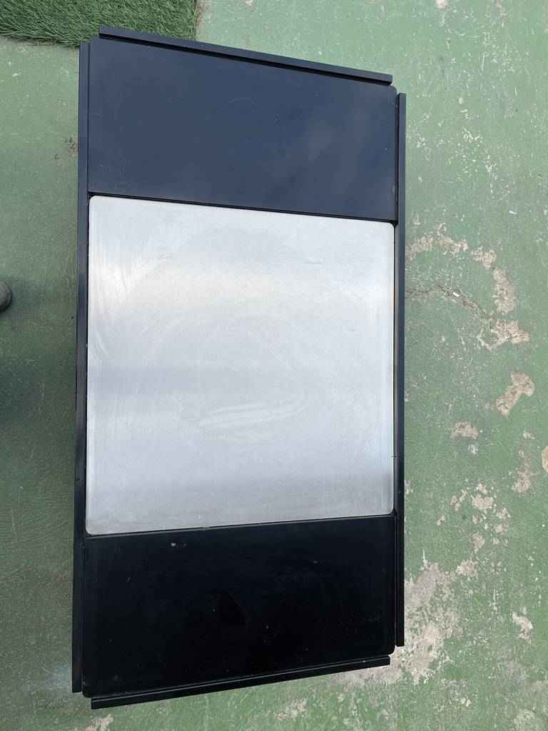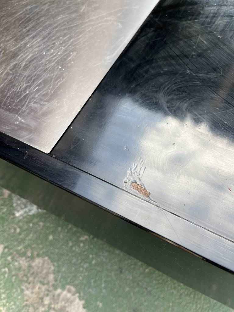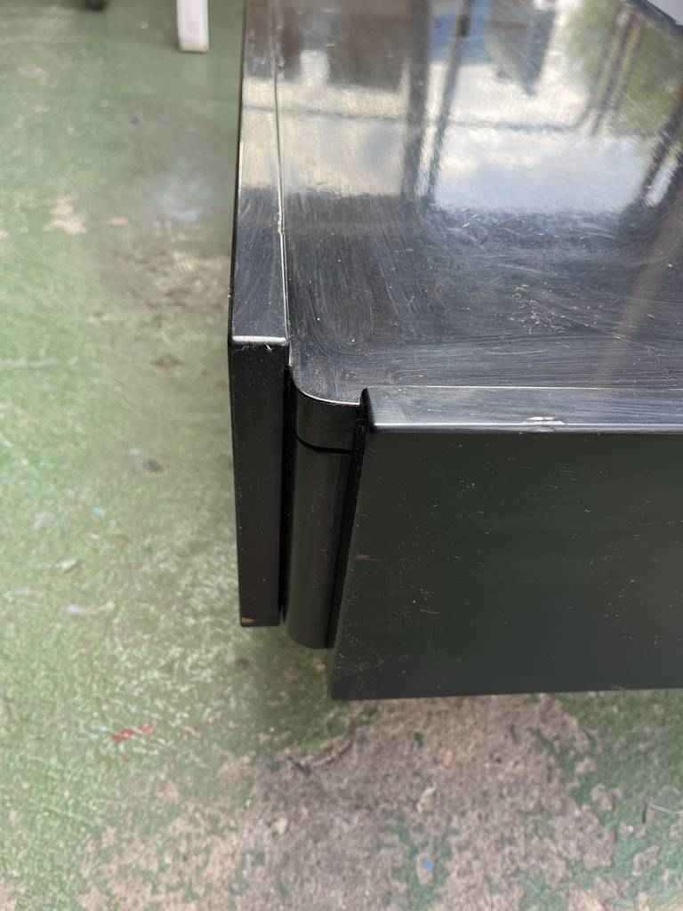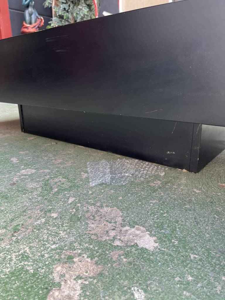Mesa de centro de estilo vintage con forma rectangular. Se trata de una mesa con un diseño muy único y original. Lacada en color negro y una parte central gris. Es ideal para colocar en un salón comedor frente al sofá. Como podemos observar en las fotografías tiene algún desperfecto.