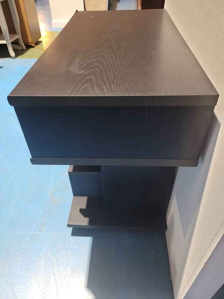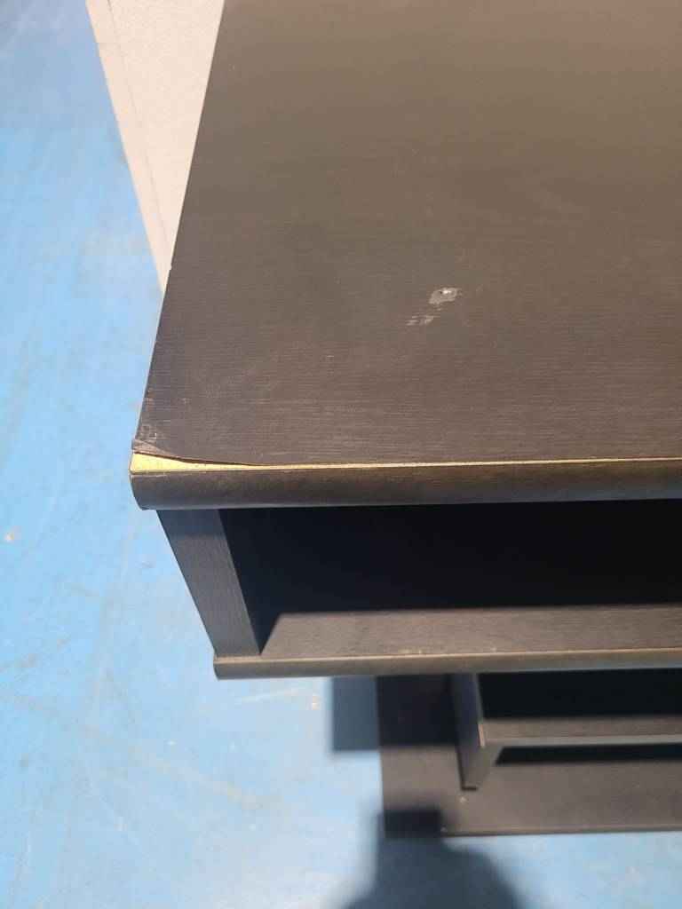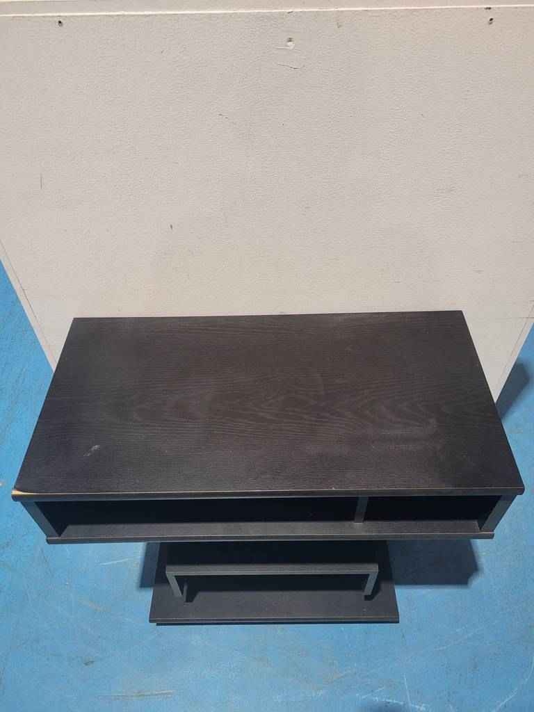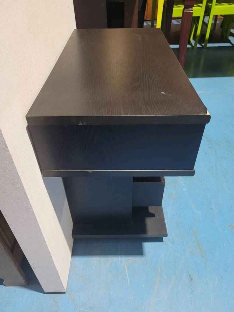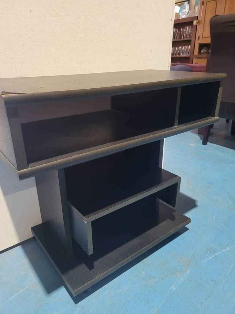 Mesa para televisión muy original y en color negro que ha sido fabricada con madera de buena calidad y robusta. Dispone en la parte inferior de cuatro cajones con diferentes tamaños ideales para colocar reproductores de video o videoconsolas, así como películas en blu-ray o DVD. Es una mesa ideal para colocar en un salón comedor. Como podemos observar en las fotografías presenta desperfectos.