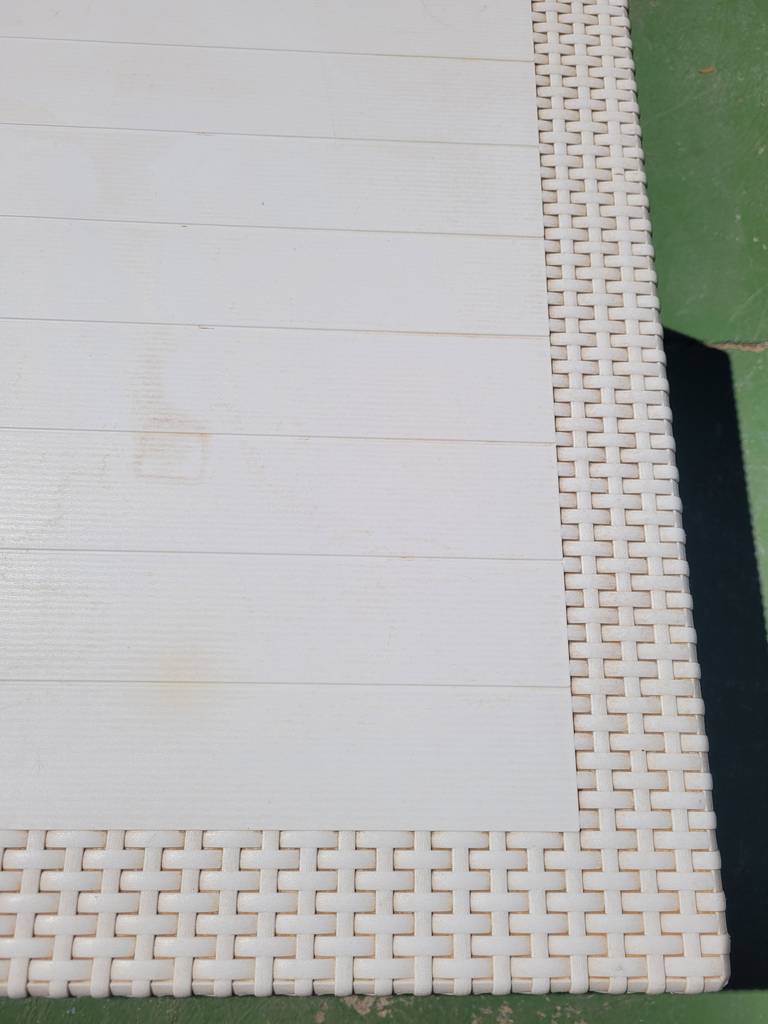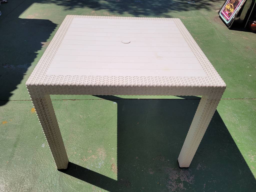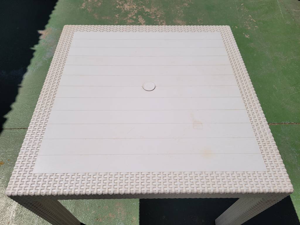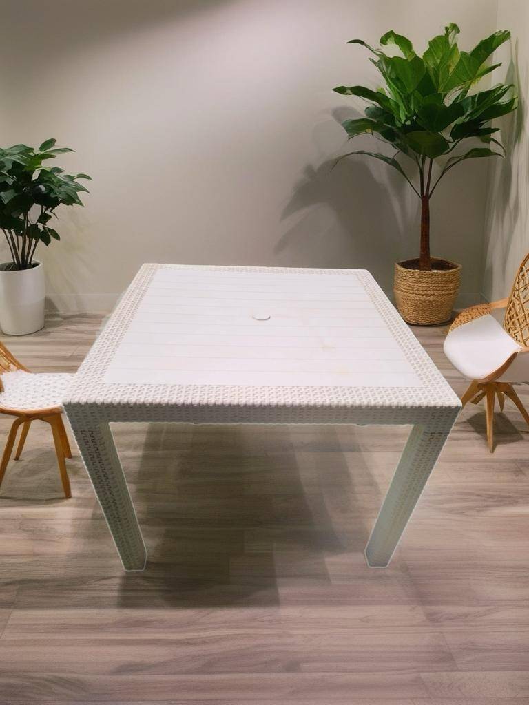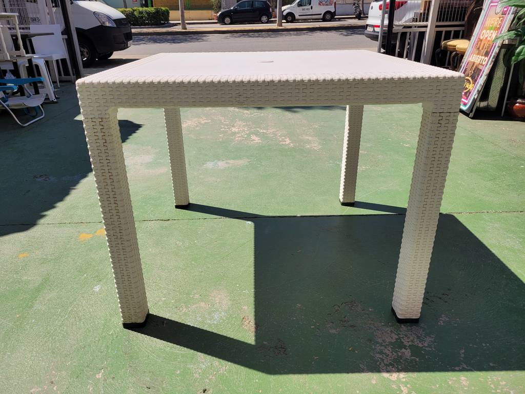 Ref. ✅ O9414 Esta es una mesa cuadrada con acabado estilo ratán. Es el complemento ideal para terrazas, jardines, porches o incluso para interiores modernos, ofreciendo durabilidad y estilo sin necesidad de mantenimiento complejo. Cuenta con una textura efecto ratán en las patas y bordes, combinada con un tablero de líneas limpias que imita tablones de madera. Fabricada en plástico reforzado, lo que la hace extremadamente resistente a la intemperie, la humedad y el desgaste diario. Incluye un agujero central con tapa para colocar una sombrilla o parasol fácilmente.