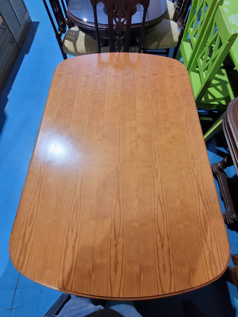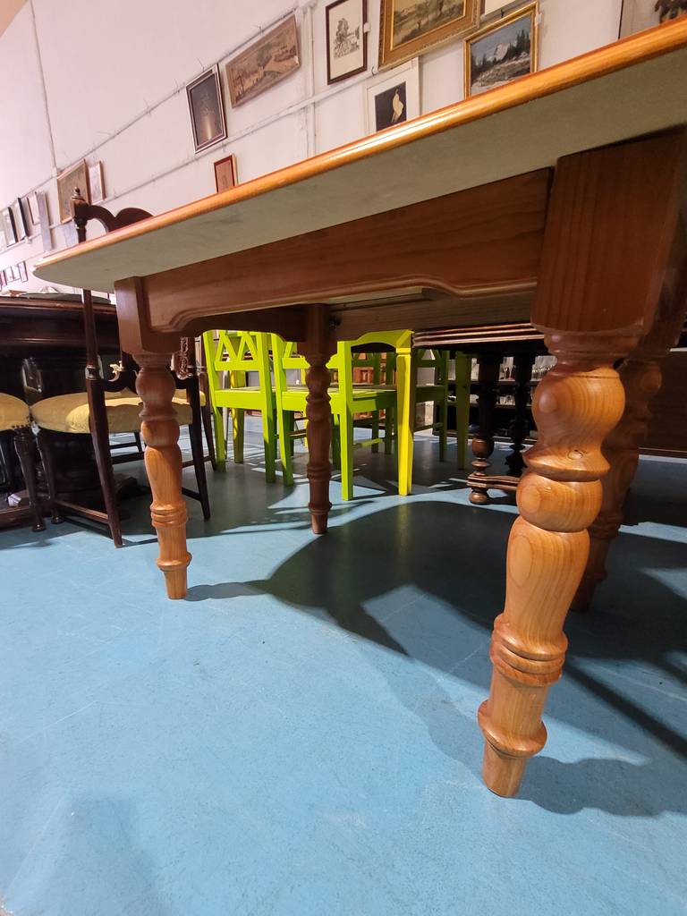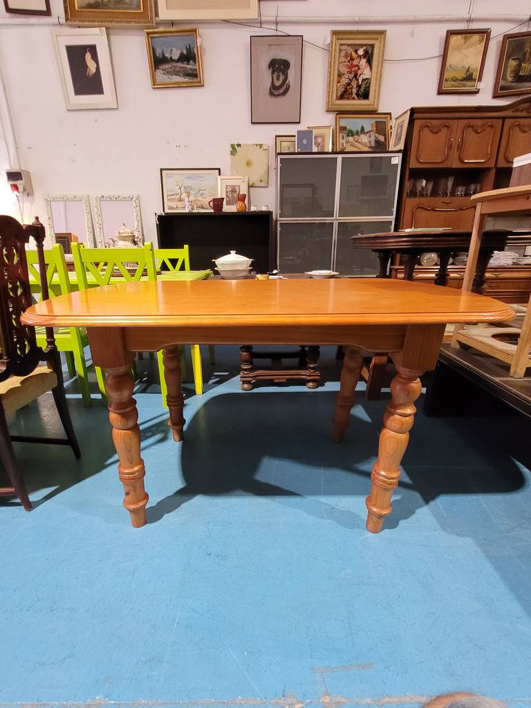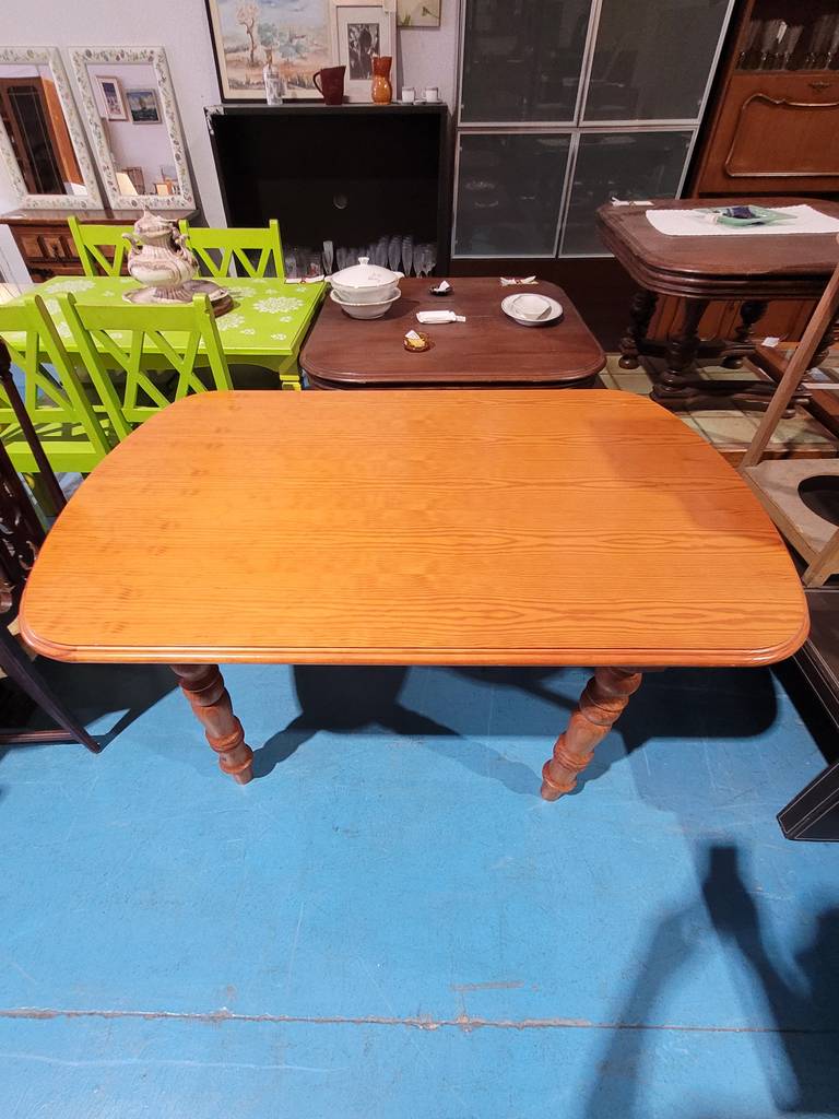 Mesa con forma rectangular que ha sido fabricada con madera de pino de buena calidad y robusta. Se trata de una mesa muy estable con cuatro patas con detalles esféricos realizados con mucha precisión y detalle. Es ideal para colocar en un salón comedor. Como podemos observar en las fotografías se encuentra en buenas condiciones.