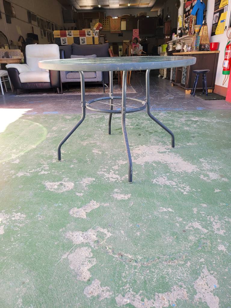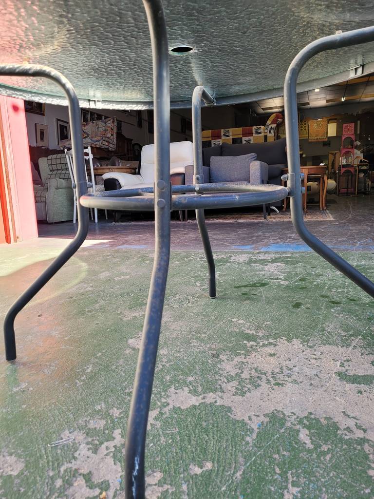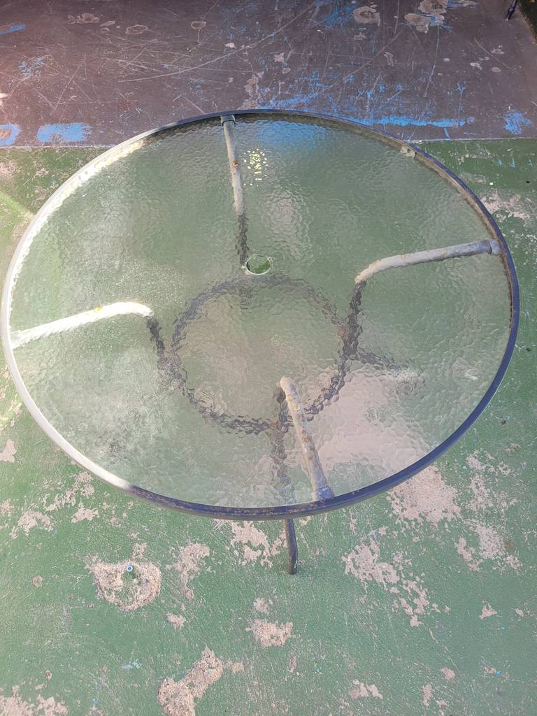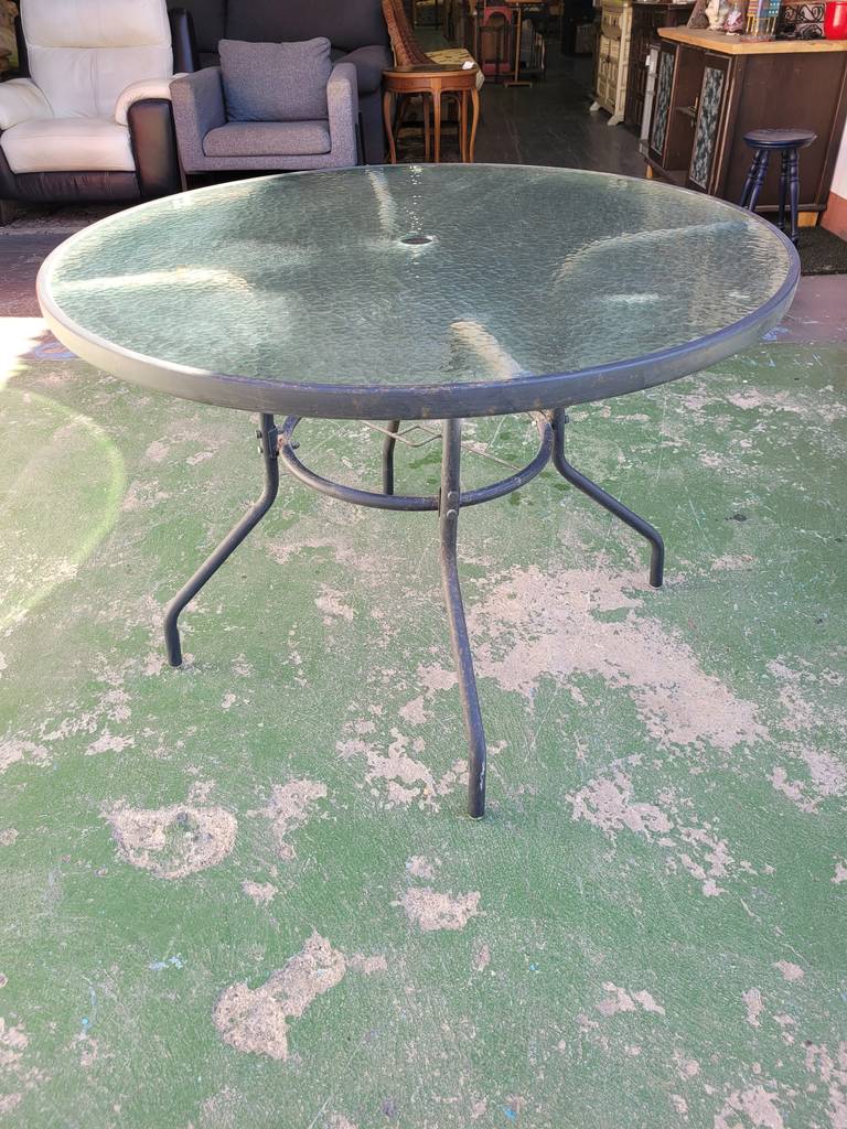 Mesa con forma redonda ideal para un jardín o porche. Se compone de una estructura de metal negra y de una parte superior con un cristal grueso de buena calidad. Incorpora en el centro un hueco para colocar una sombrilla y protegernos del sol cuando la estemos utilizando. Como podemos observar en las fotografías presenta desgaste.