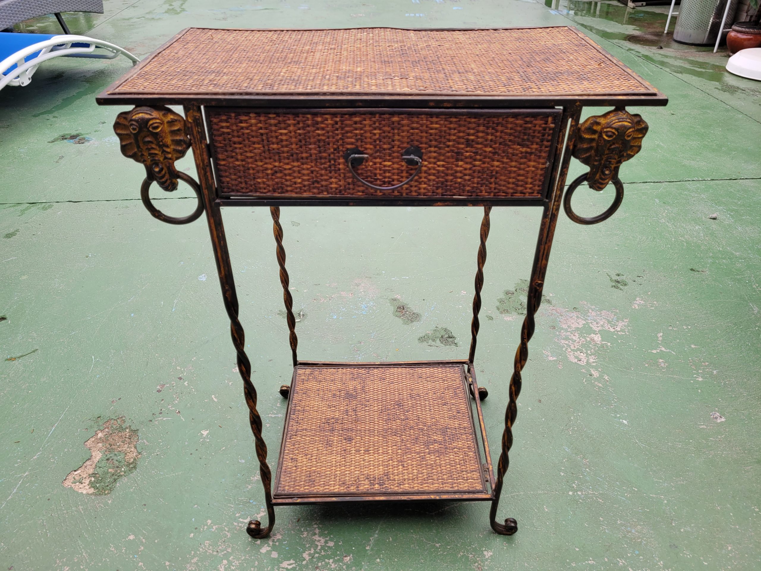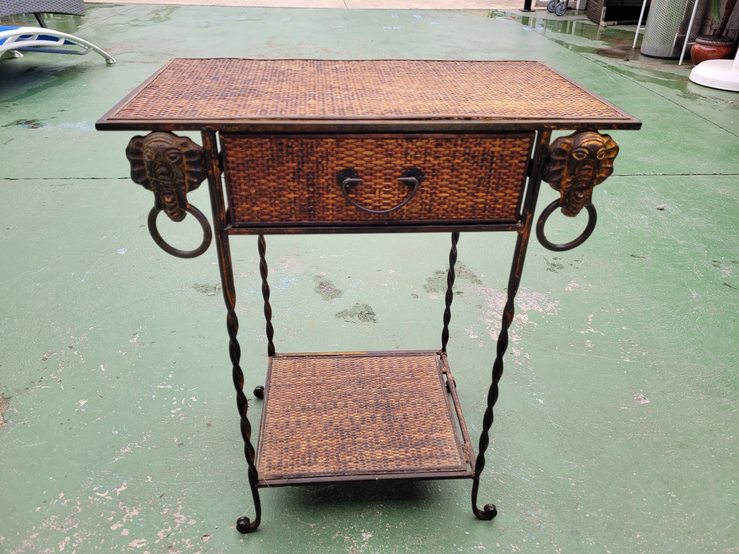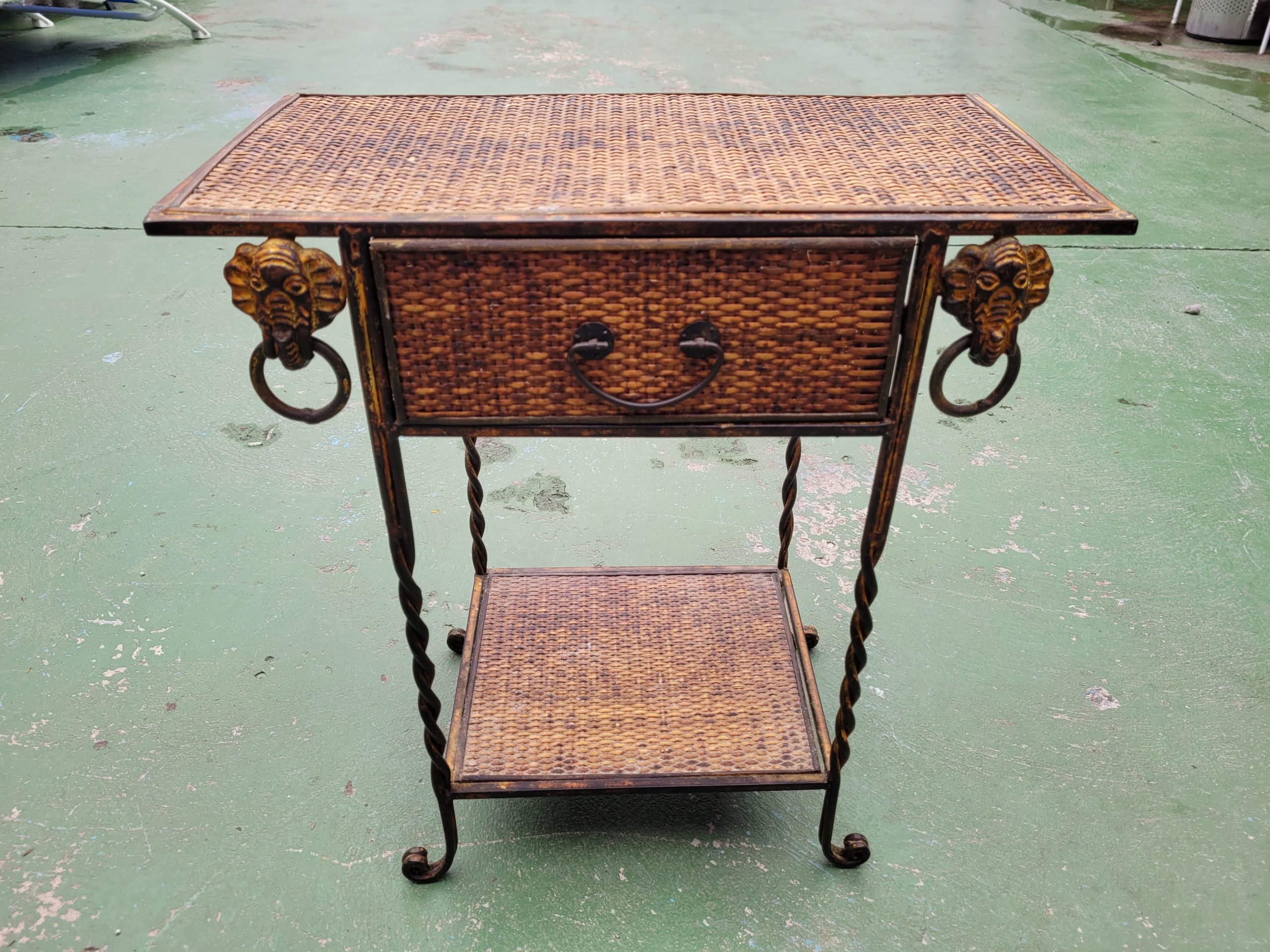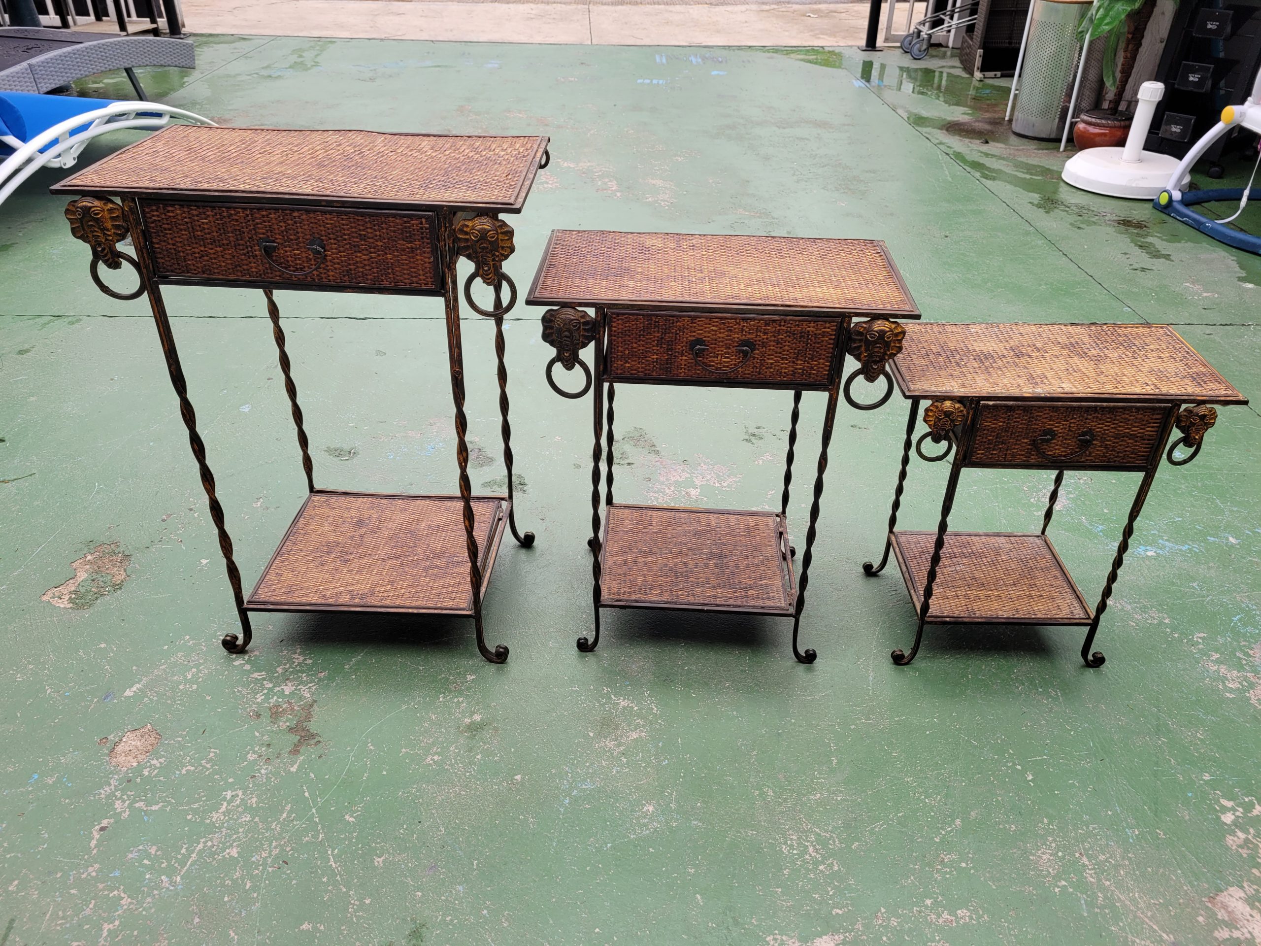 Ref. ✅ O9217 Este conjunto único de tres mesas nido de diferentes tamaños. Inspiradas en el estilo Mediterranean Revival, combinan la calidez de los materiales naturales con la robustez artesanal del metal. Cada mesa presenta una estructura de hierro forjado con patas torneadas en espiral y detalles ornamentales de cabezas de elefante con anillas en latón/dorado. Superficies y frontales de cajón elaborados en ratán tejido o mimbre de alta calidad, sobre una base de madera maciza con pátina envejecida. Cada unidad cuenta con un práctico cajón superior con tirador metálico y un estante inferior de rejilla, ideal para organizar objetos pequeños, libros o plantas. Perfectas como mesitas de noche, mesas auxiliares en el salón o como pedestales decorativos en un rincón especial.