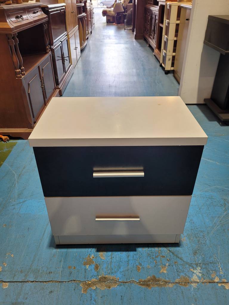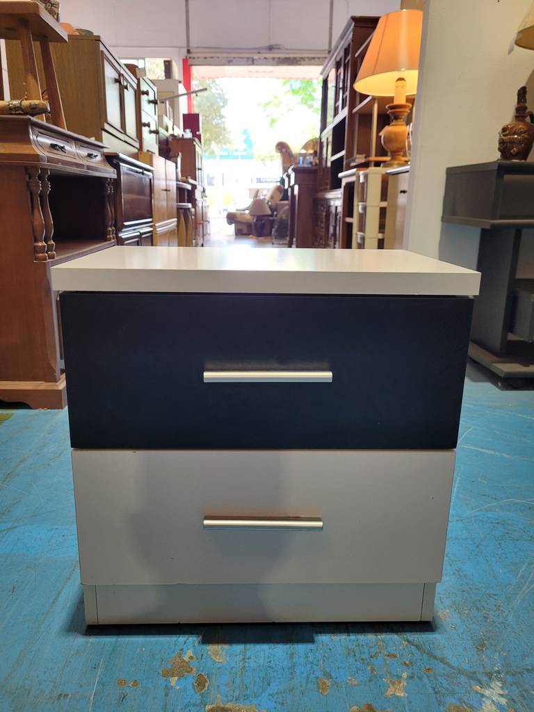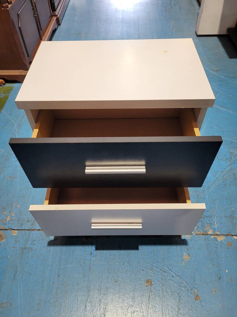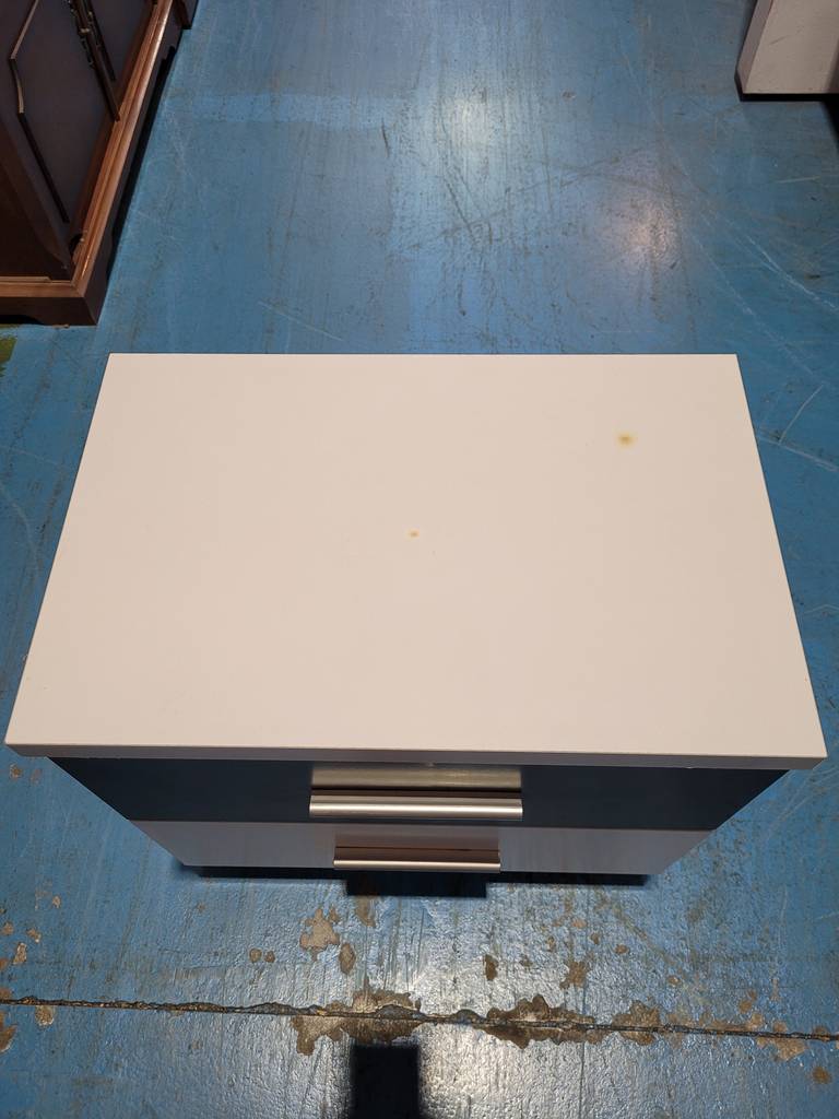 Mesita de noche de color blanco y azul fabricada en madera de buena calidad. Se trata de una mesita de noche que cuenta con dos cajones que tienen tiradores metálicos alargados para facilitar su apertura. Es una mesita ideal para colocarla en un dormitorio individual de estilo moderno al lado de una cama. Como se puede observar en las fotografías se encuentra en buenas condiciones.