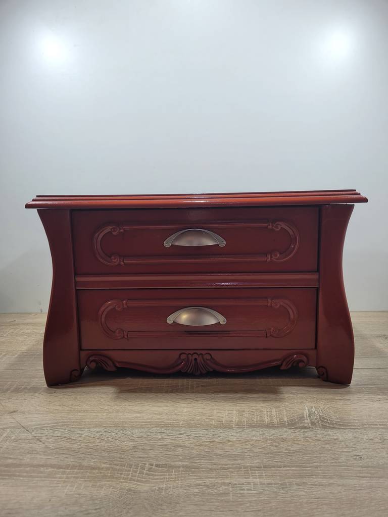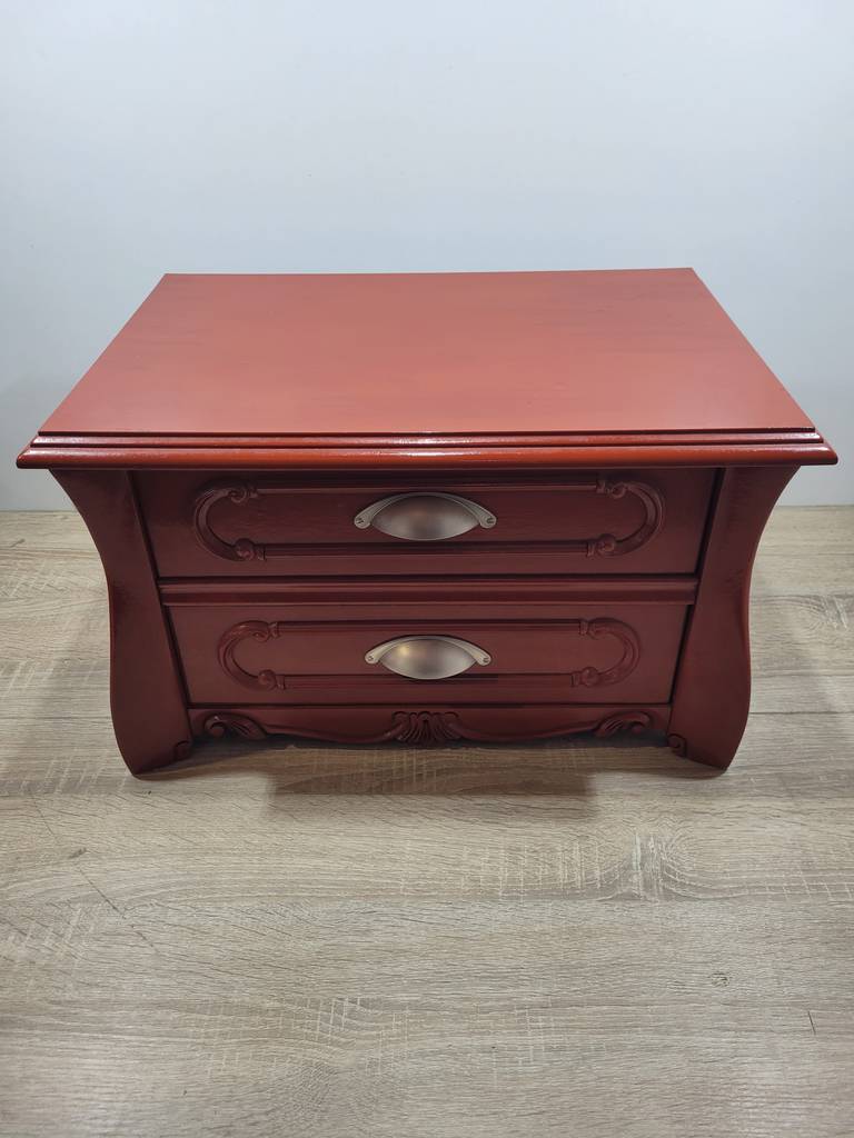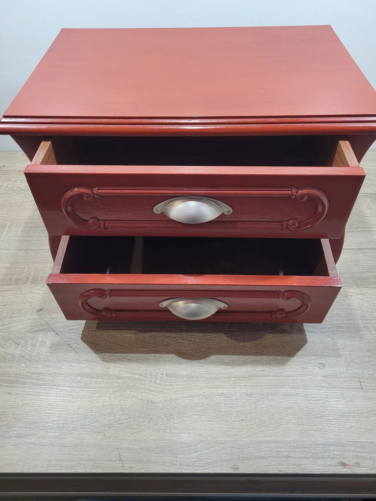 Mesita muy bonita y coqueta de estilo vintage en color rojo. Se trata de una mesita que ha sido fabricada con madera de buena calidad y robusta. Está compuesta por una parte frontal con dos cajones y en la parte central unos bonitos tiradores metálicos grises. Es ideal para colocar en un dormitorio al lado de una cama. Como podemos observar en las fotografías se encuentra en buenas condiciones.