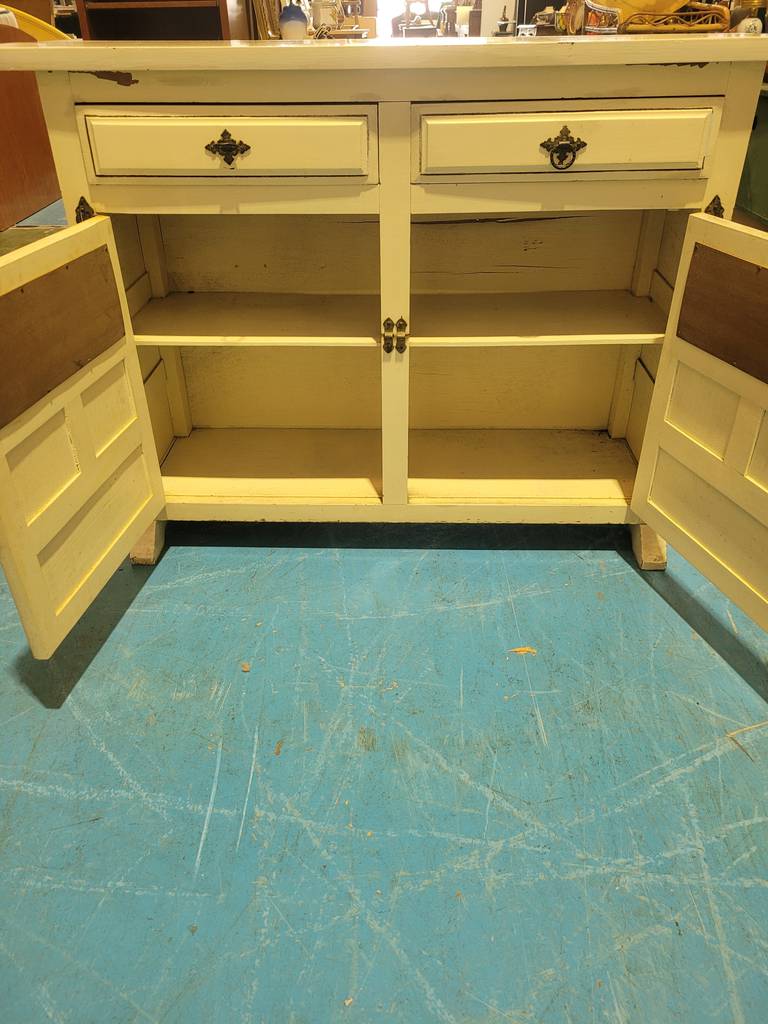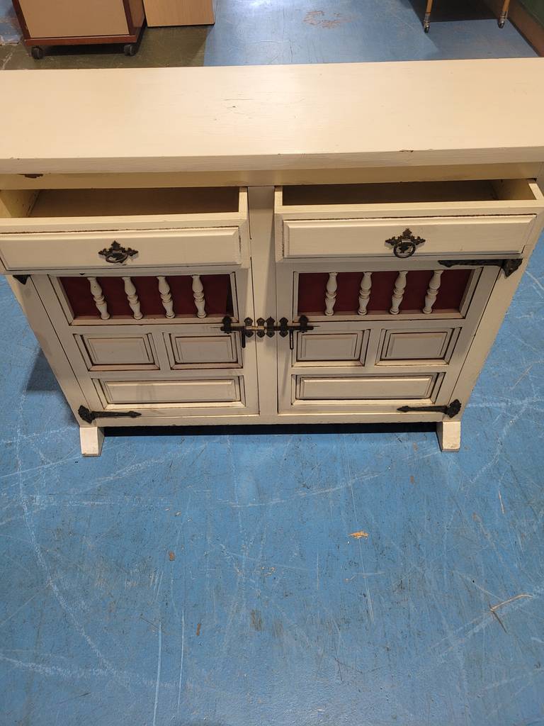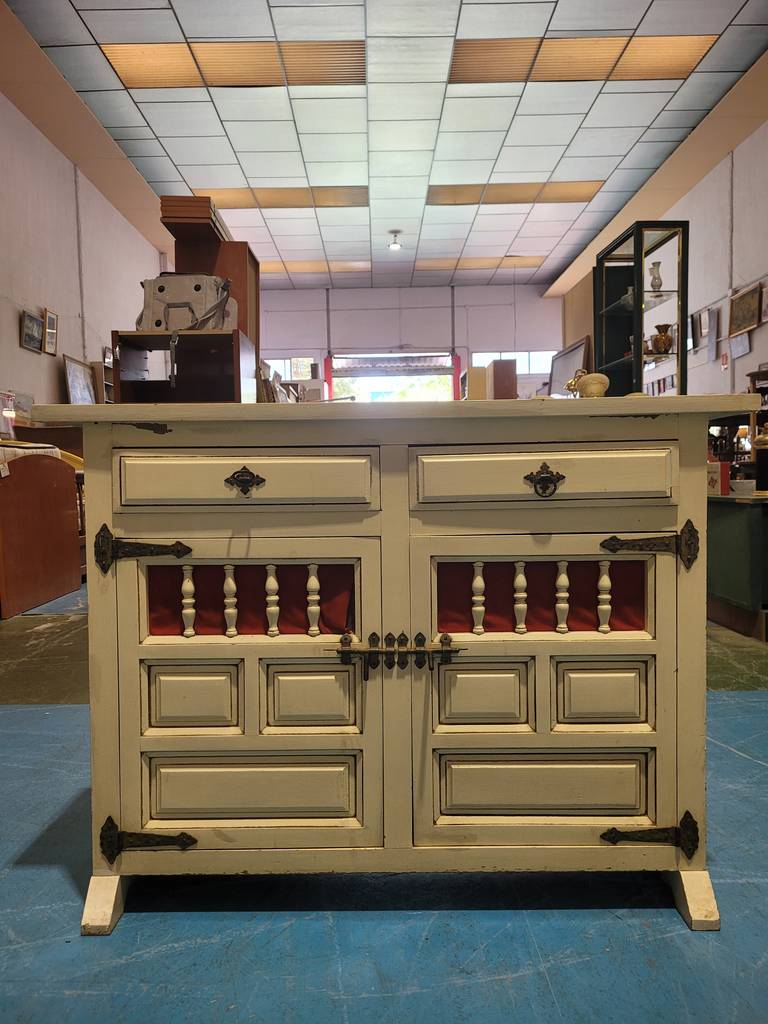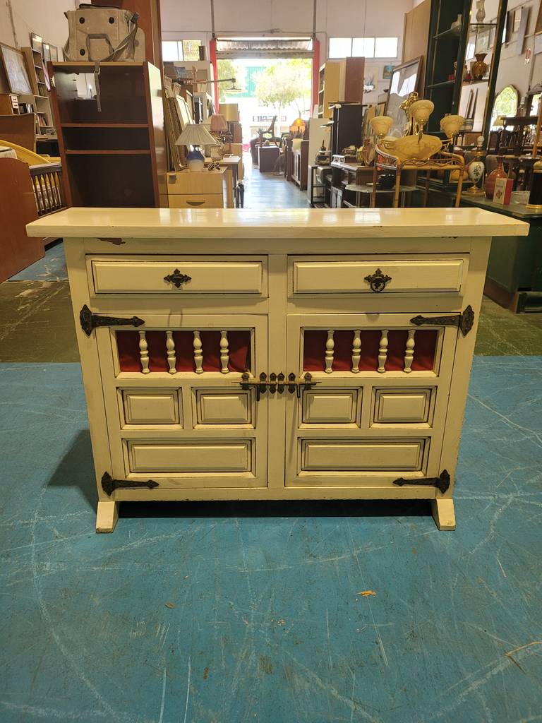 Mueble de estilo castellano y en color blanco. Este mueble ha sido realizado con madera de buena calidad y robusta. Se compone de una parte frontal con dos cajones en la parte superior y dos puertas en la inferior. Su estilo único le aportará elegancia donde decidamos colocarlo, en especial como recibidor o en un salón comedor. Como podemos observar en las fotografías presenta ligeros rasguños.
