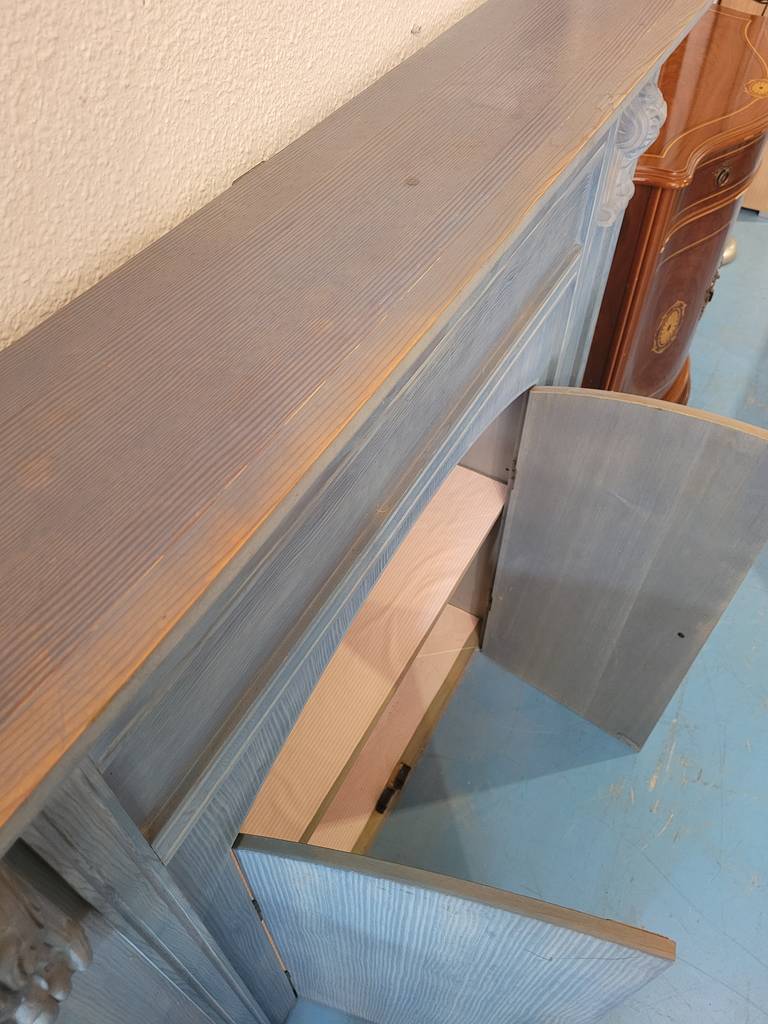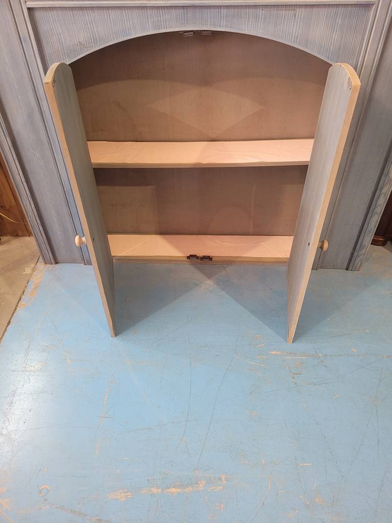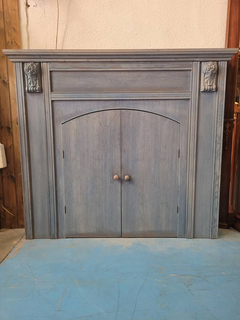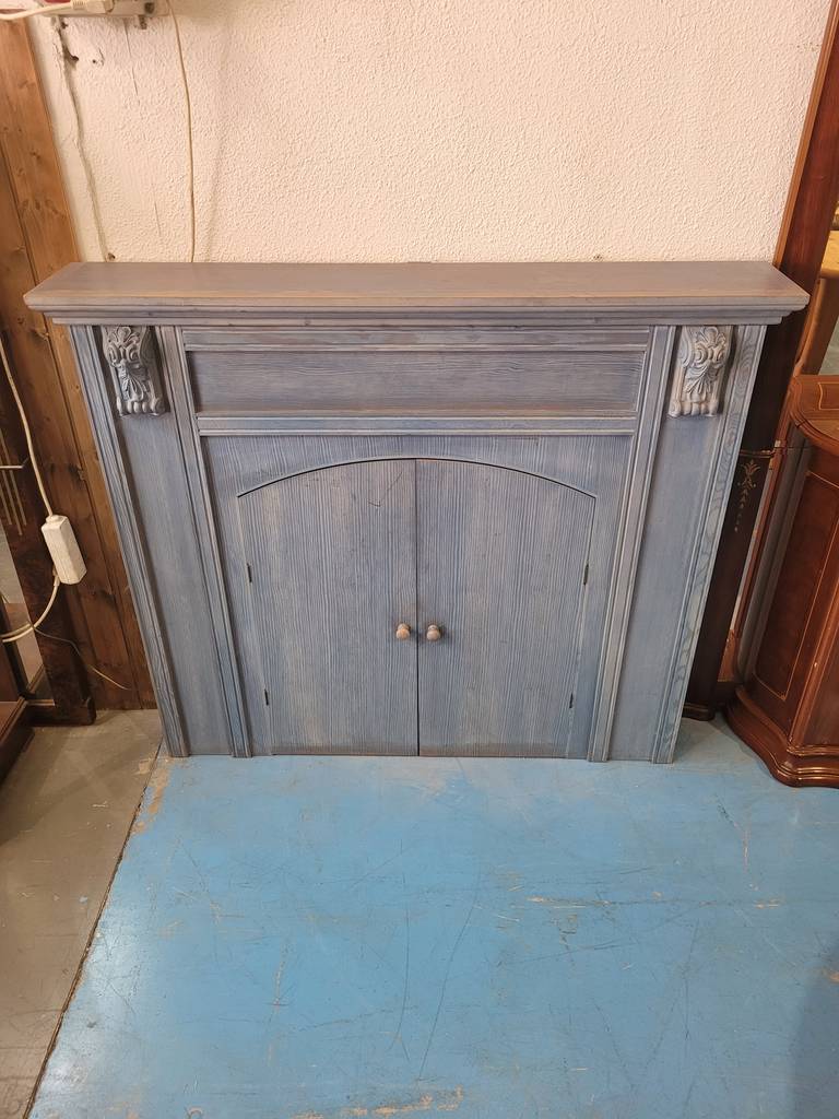 Mueble de pared en azul muy bonito y elegante que ha sido fabricado con madera de buena calidad y robusta. Se compone de dos columnas laterales con un bonito detalle realizado con precisión y detalle así como dos puertas en el centro que en su interior tiene dos habitáculos para almacenar enseres. Es un mueble ideal para colocar en un salón comedor. Como podemos observar en las fotografías se encuentra en buenas condiciones.