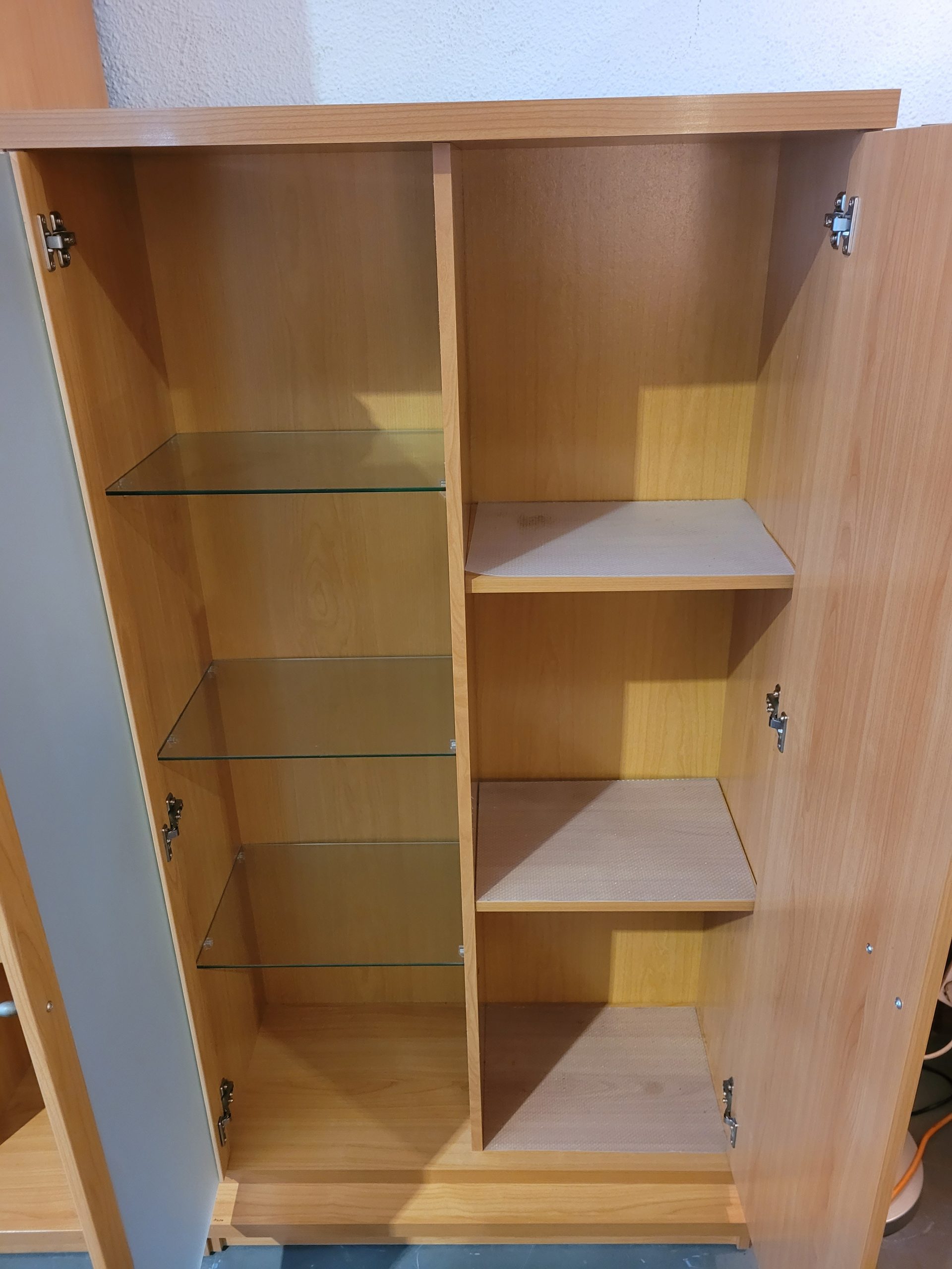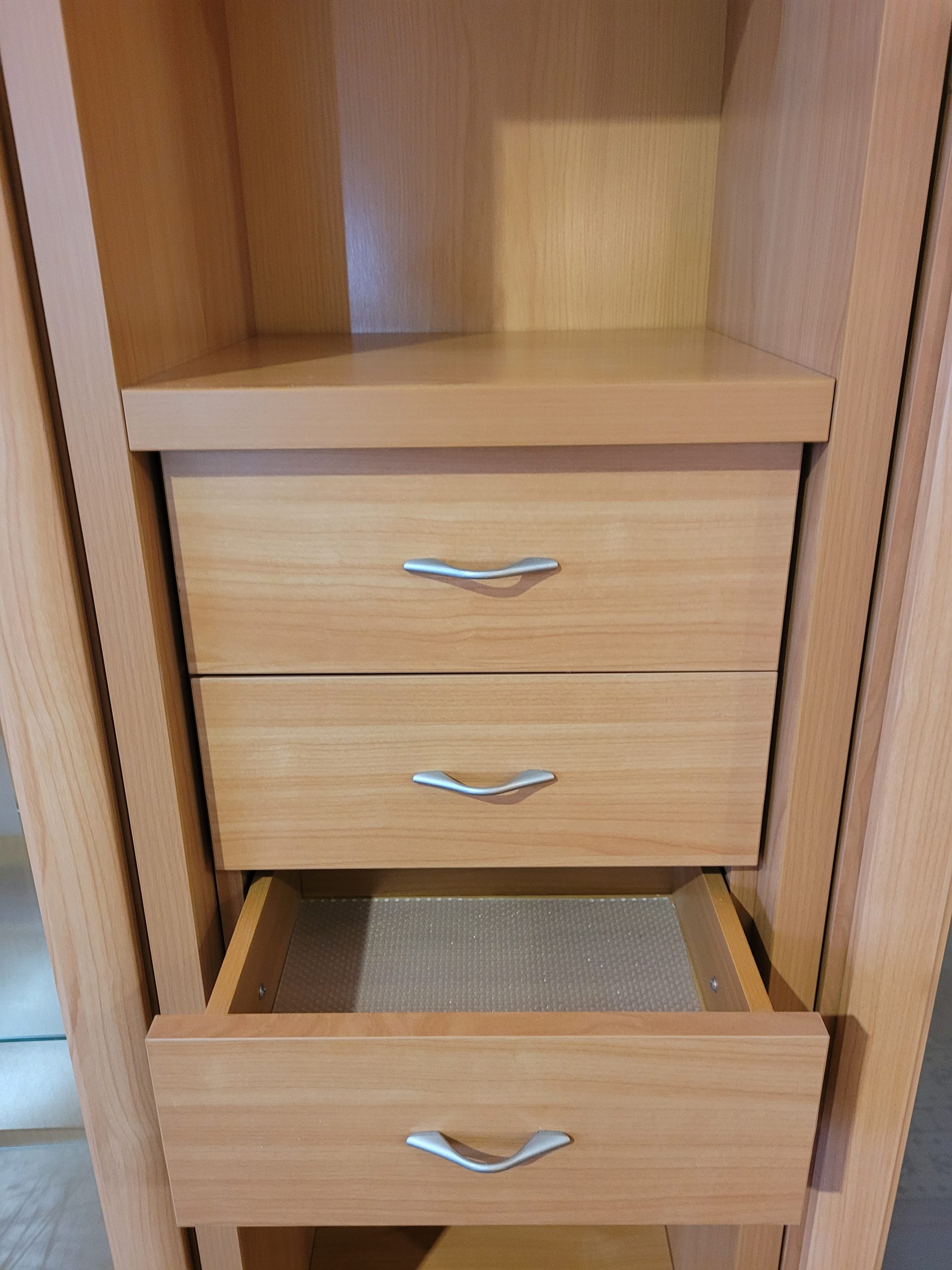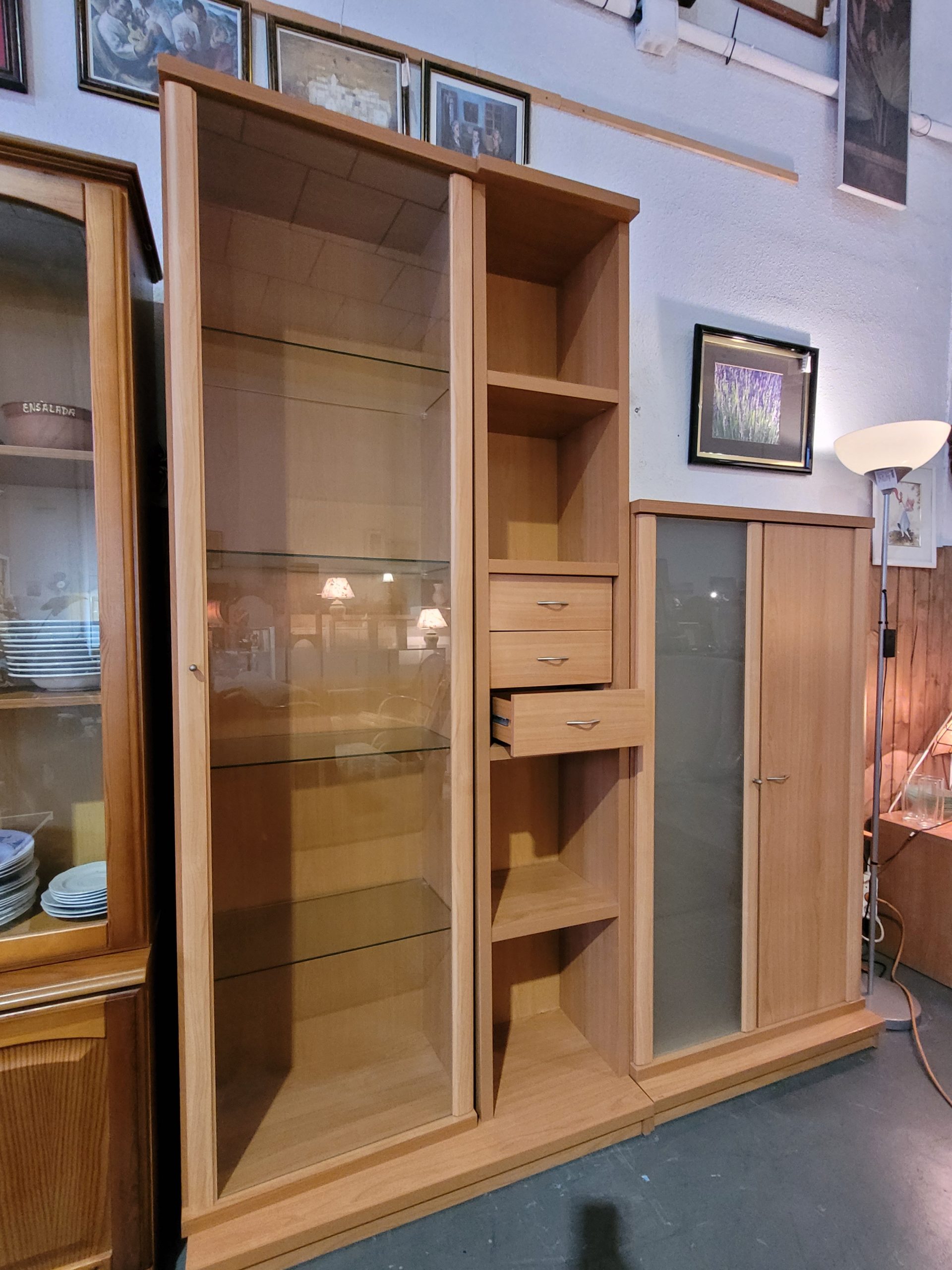 Ref. ✅ O8915 Este es un mueble modular de salón o comedor en tono de madera clara, ideal para almacenamiento y exhibición. Compuesto por tres secciones que se pueden organizar juntas o por separado, dos secciones de vitrina con puertas de cristal y estantes internos de vidrio, perfectas para exhibir vajilla, libros u objetos decorativos, una sección central con estantes abiertos y tres cajones de madera con tiradores, que ofrecen espacio de almacenamiento adicional y discreto. Este conjunto combina funcionalidad con un estilo clásico y adaptable que encaja en diversos ambientes.