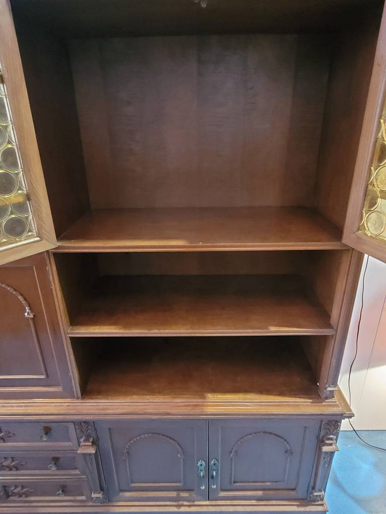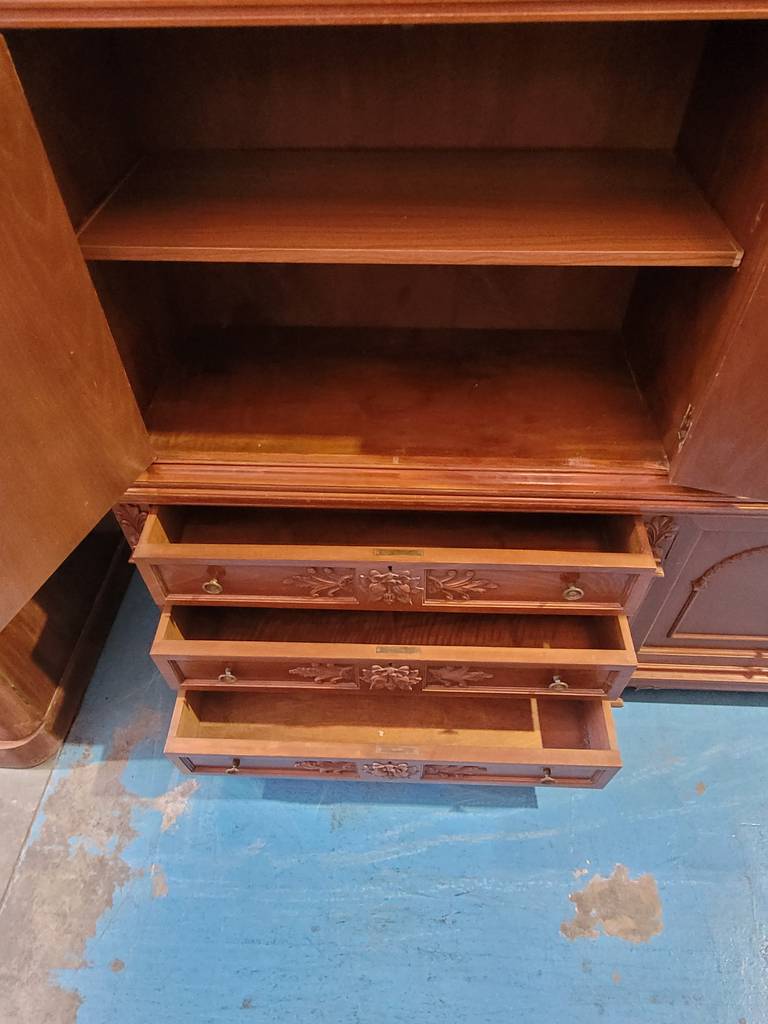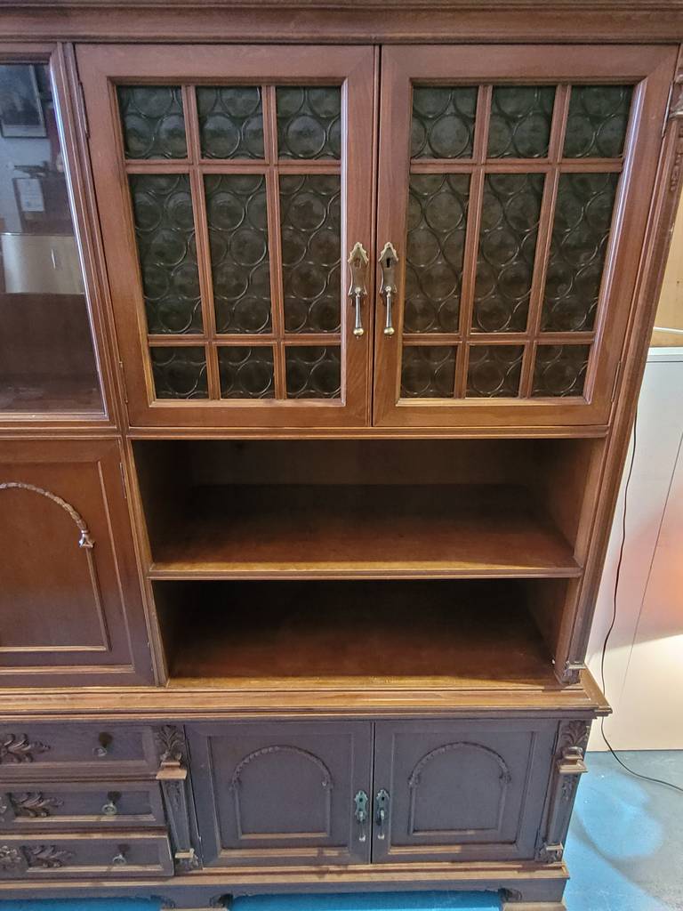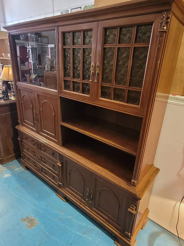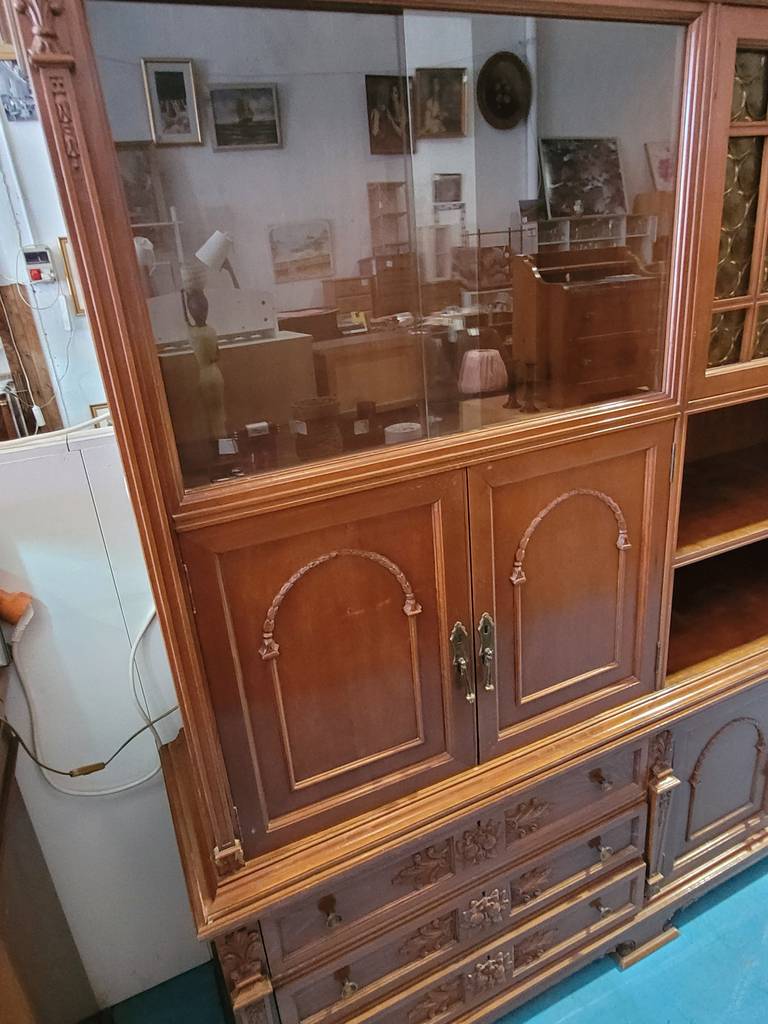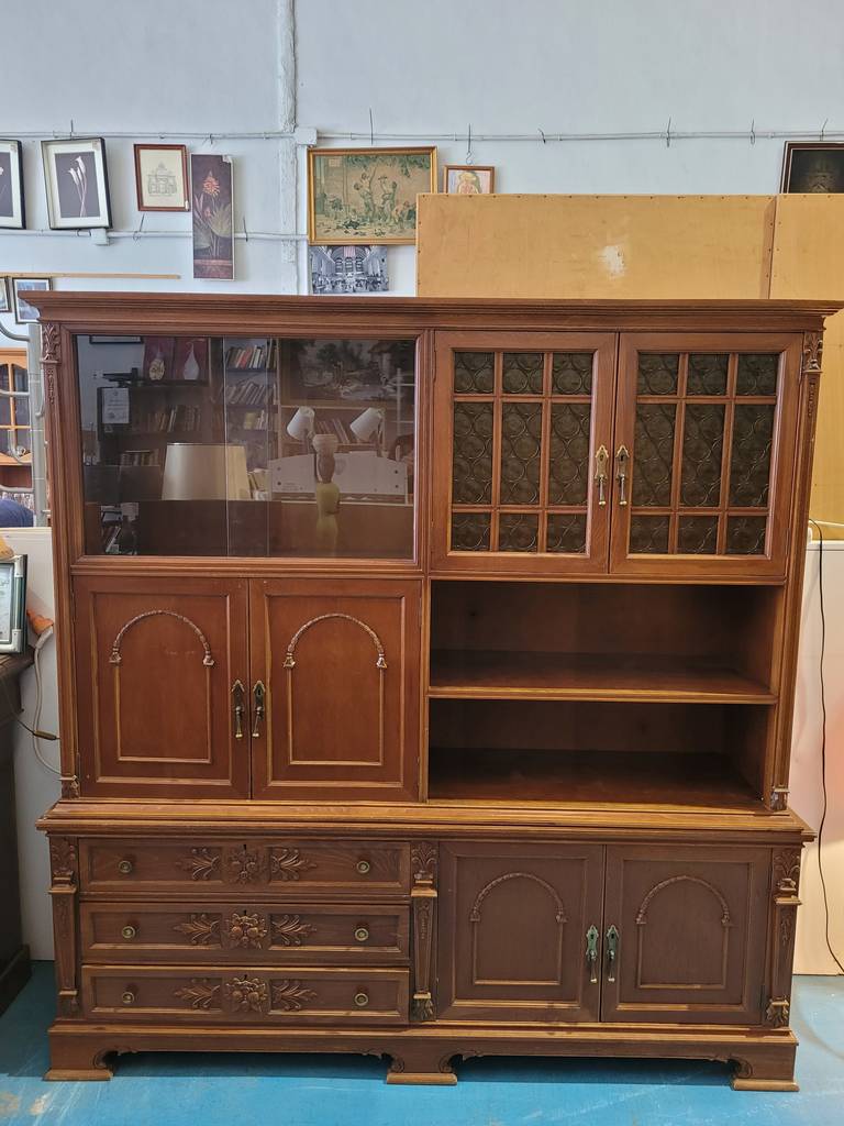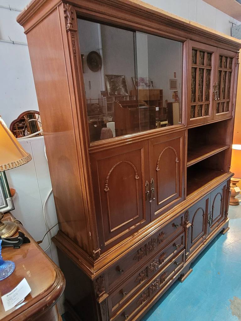 Mueble de salón de estilo vintage que ha sido fabricado con madera de buena calidad y robusta. Se trata de un mueble con gran espacio de almacenamiento, compuesto por habitáculos abiertos, vitrinas de cristal, cajones y puertas. Es ideal para colocarlo en nuestro salón comedor. Como podemos observar en las fotografías se encuentra en buenas condiciones.