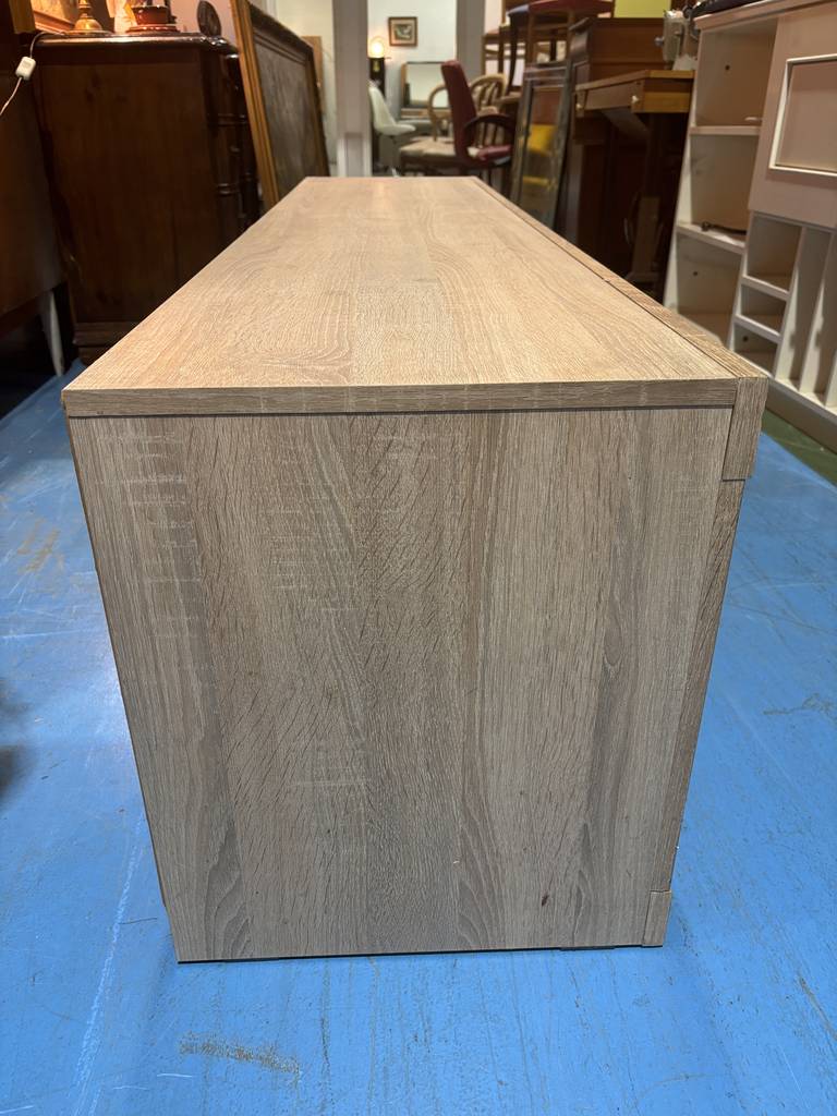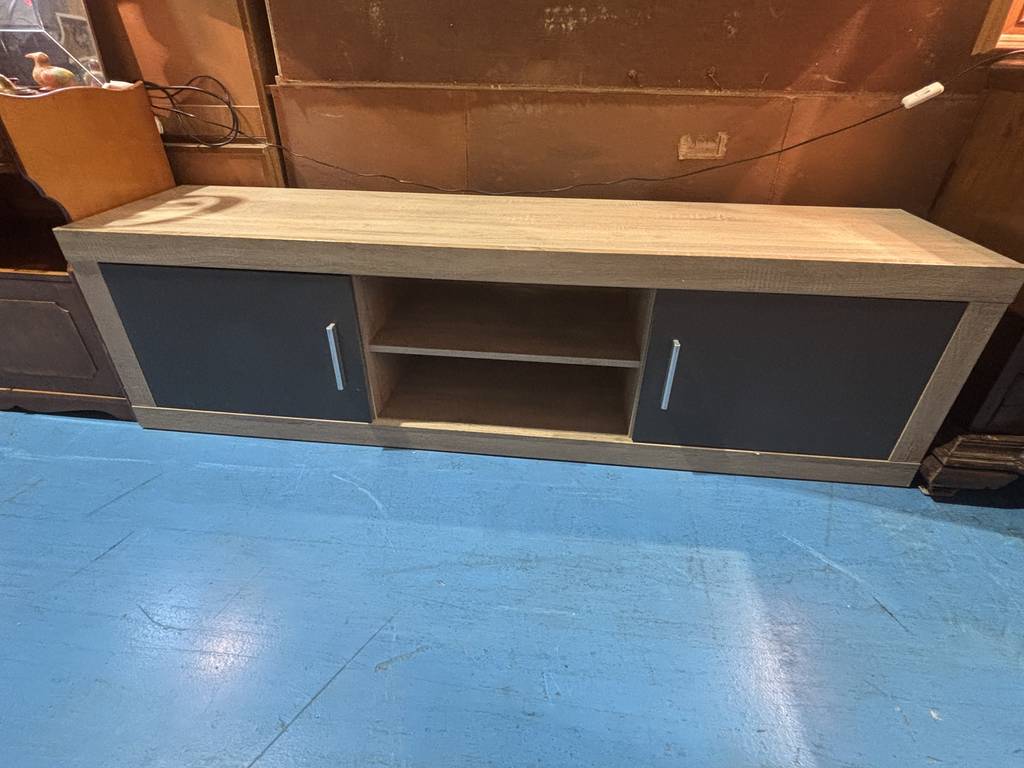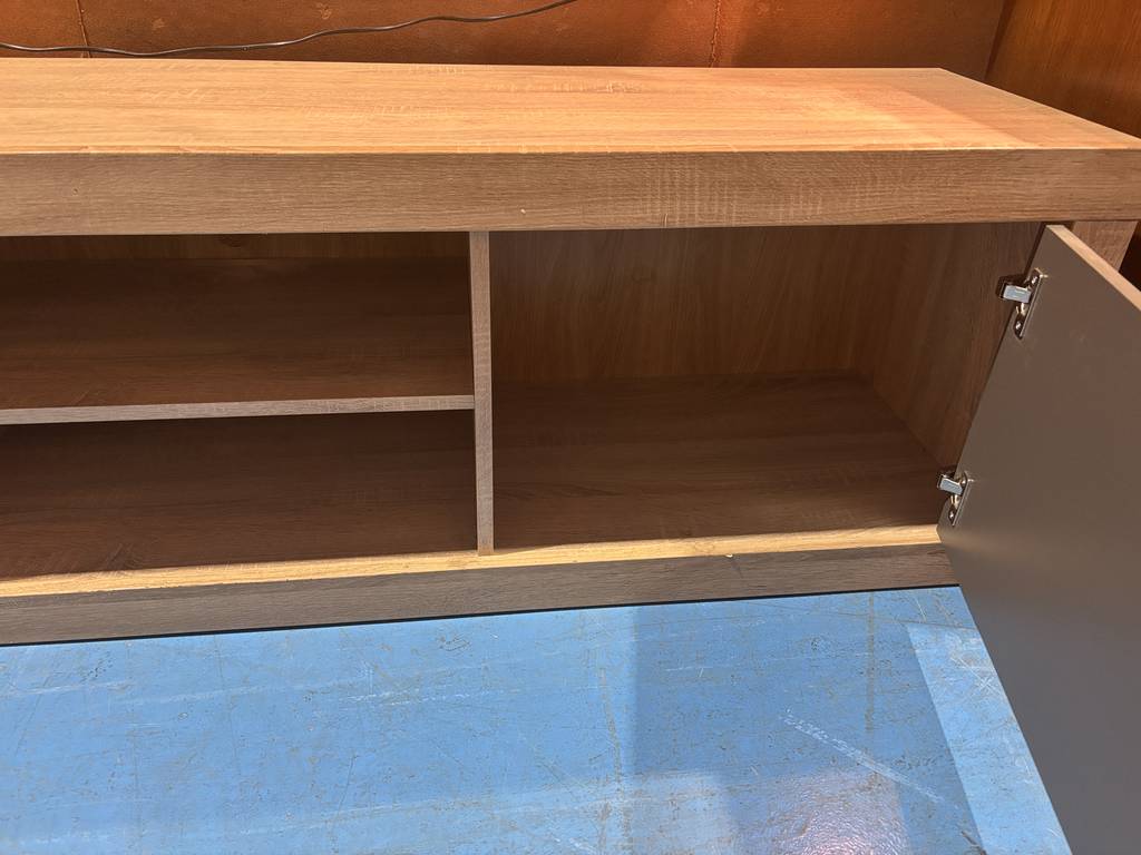 Ref. ✅ O8800 Mueble de TV moderno y funcional, de estilo contemporáneo que combina tonos de madera clara y gris oscuro, ideal para un salón moderno. Cuenta con dos compartimentos centrales abiertos, perfectos para consolas o dispositivos multimedia, y dos amplios armarios laterales cerrados con puertas y tiradores metálicos para almacenamiento discreto. Es un mueble neutro que se adapta a diversos estilos de decoración que se encuentra listo para darle una segunda oportunidad.