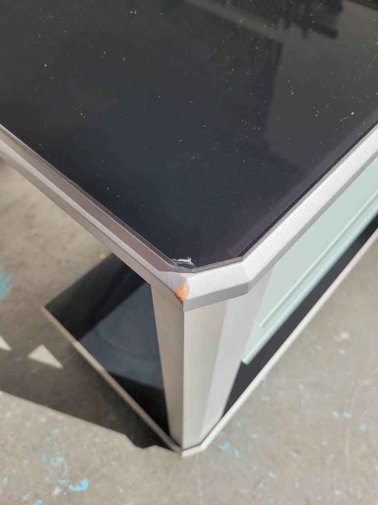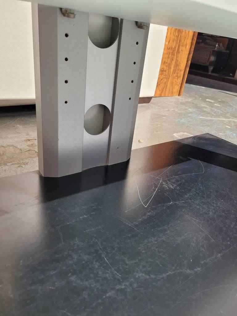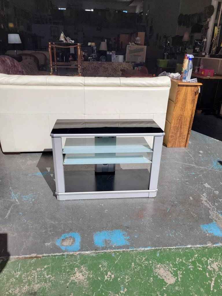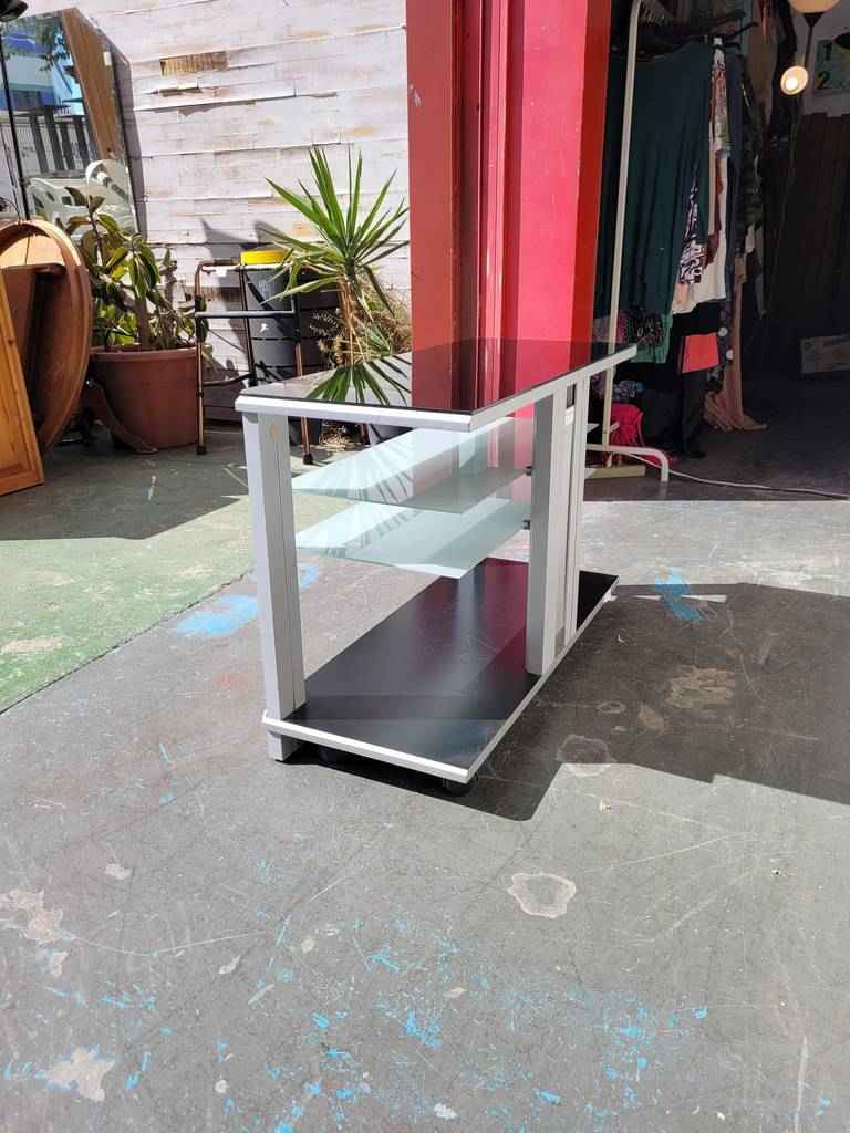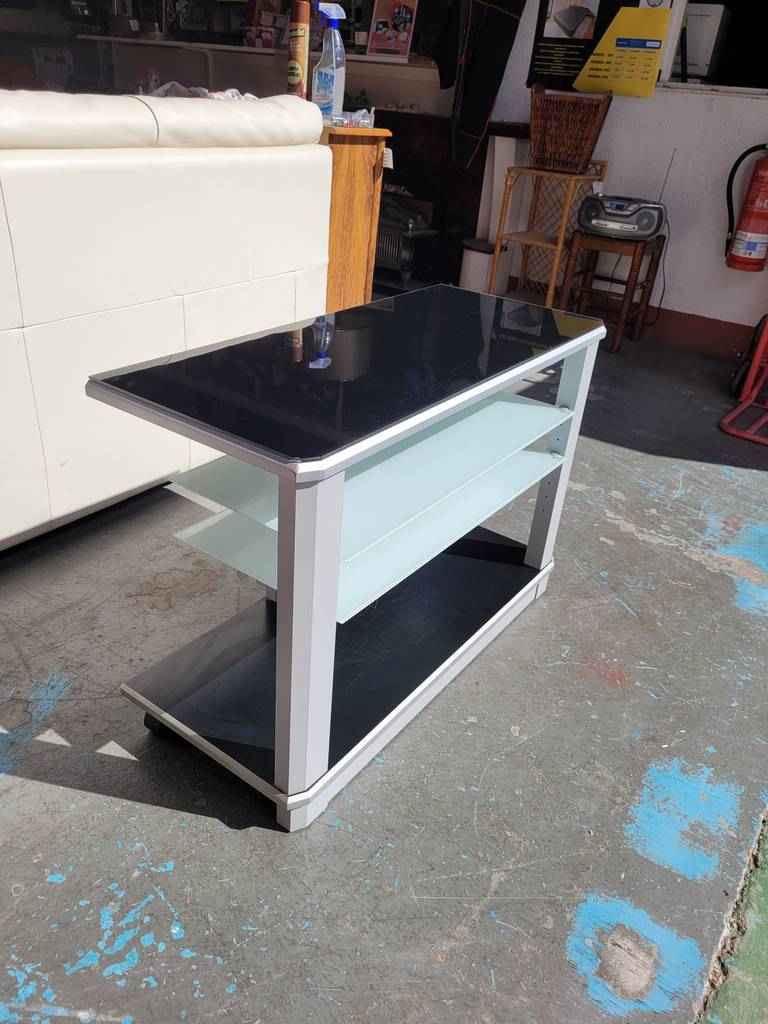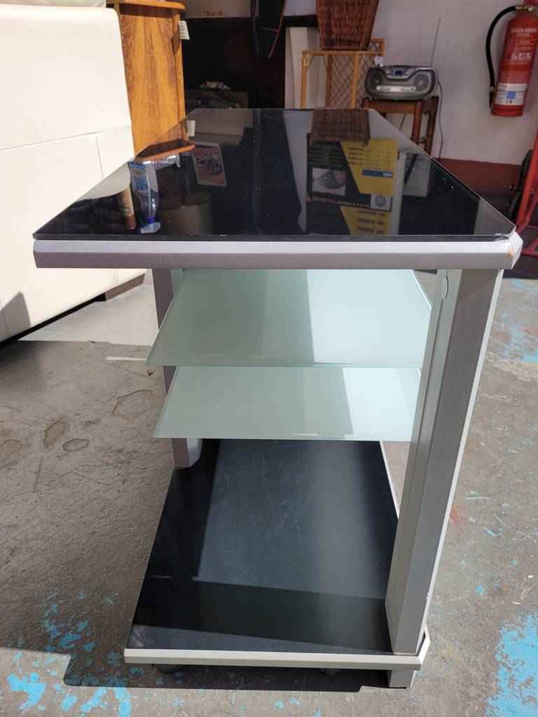 Mueble especialmente diseñado para colocar nuestro televisor en un salón comedor con un estilo muy moderno. Dispone en la parte superior e inferior de dos tablones en color negro y en la parte frontal dos baldas de cristal opaco que separan tres habitáculos abiertos que son ideales para colocar reproductores de dvd o videoconsolas. Como podemos observar en las fotografías presenta desperfectos.