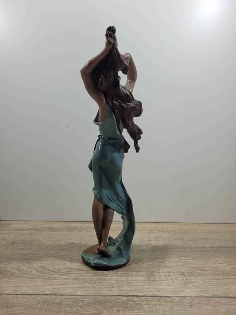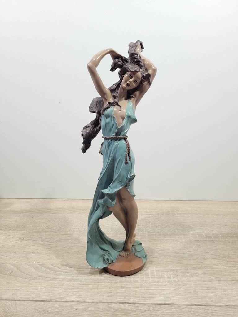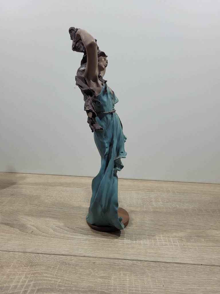Figura que ha sido fabricada en yeso de buena calidad. En ella podemos observar a una mujer que lleva un vestido muy bonito con una cuerda a modo de cinturón. La mujer está con los brazos levantados posando. Es una figura ideal para darle un toque distintivo a nuestro salón comedor o recibidor. Como podemos observar en las fotografías se encuentra en buenas condiciones.