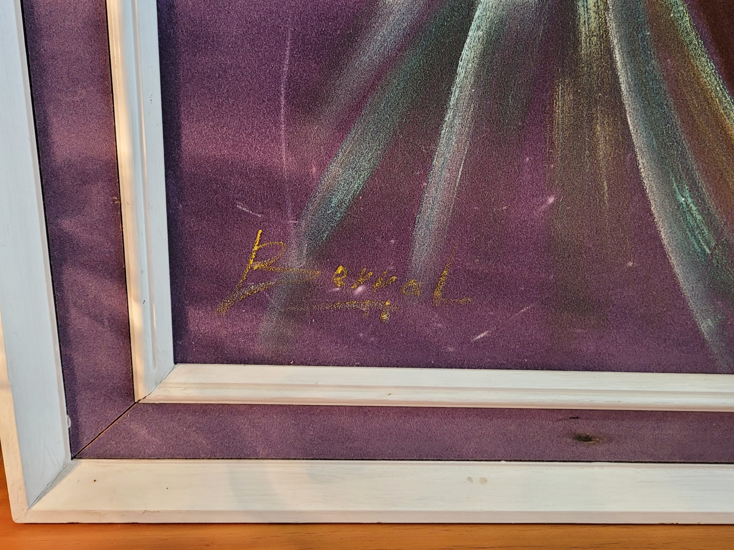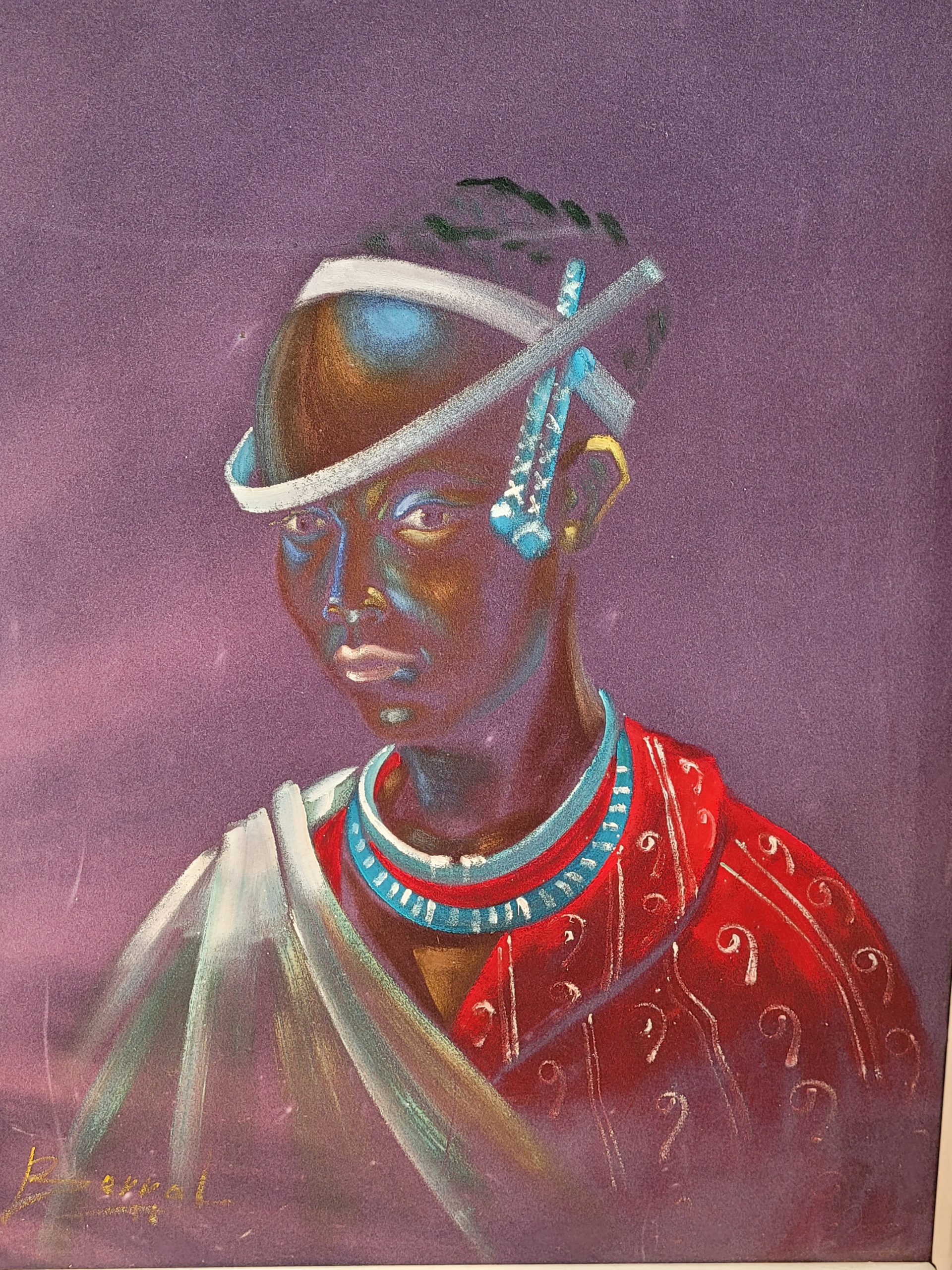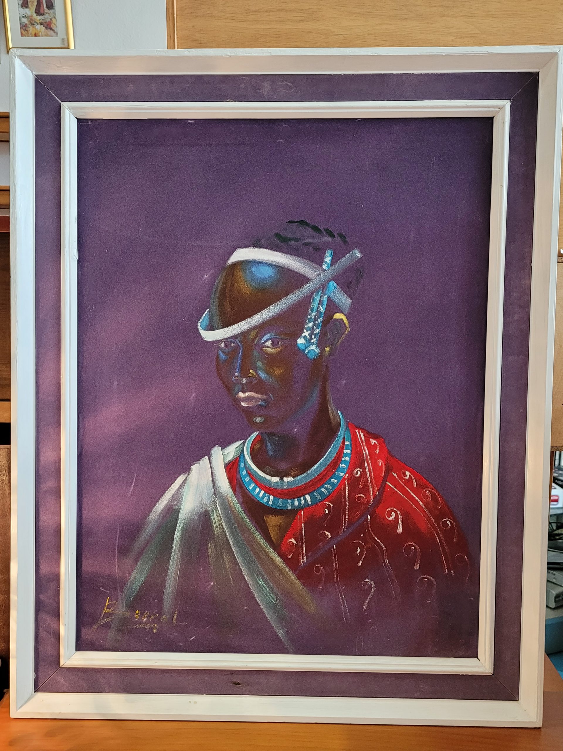 Ref. ✅ O9048 Esta pintura, titulada originalmente “Princesa Tusi”, es un retrato étnico que destaca por su vibrante uso del color y simbolismo cultural. La obra captura la esencia de la dignidad y la herencia africana a través de detalles tradicionales meticulosamente representados. Ornamentación detallada con collares de abalorios azules (beadwork), que son elementos centrales en la expresión de la belleza y estatus en diversas culturas africanas. Fondo en tonos púrpuras profundos que contrastan con la calidez de la figura central. La pieza se presenta en un marco de madera blanco con un paspartú de color morado que complementa la paleta de la obra.