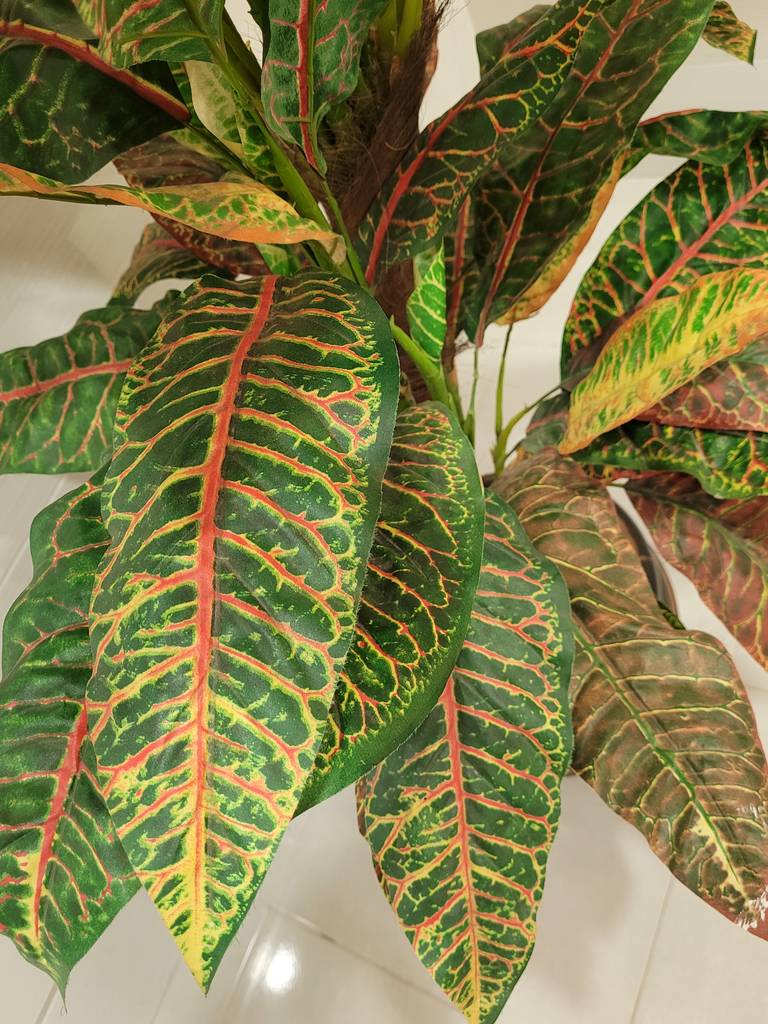 Ref. ✅ O8898  Esta planta artificial Crotón (Codiaeum variegatum), es una planta de interior muy popular conocida por su espectacular y colorido follaje. La característica más destacada son sus hojas gruesas, brillantes y coriáceas (similares al cuero). Presenta una mezcla de colores intensos que incluyen tonos de verde, amarillo, naranja y rojo. Aporta un toque exótico y vital a cualquier espacio, siendo ideal para decorar salas de estar, oficinas o patios interiores. Es una planta resistente y duradera que no requiere mantenimiento.
