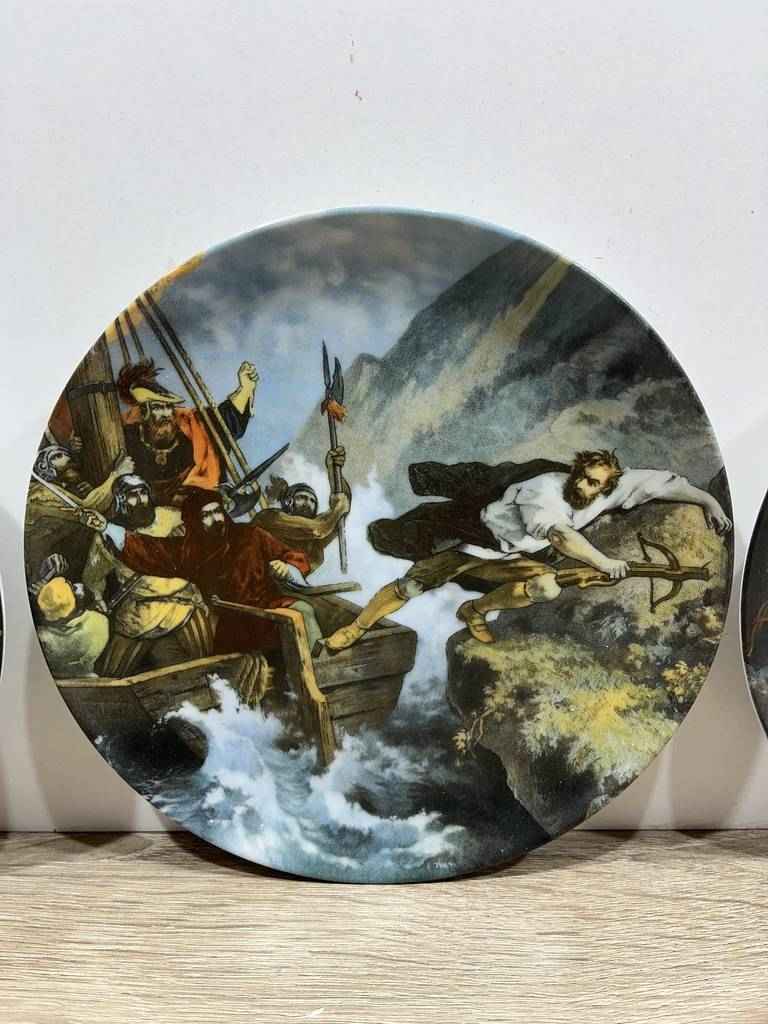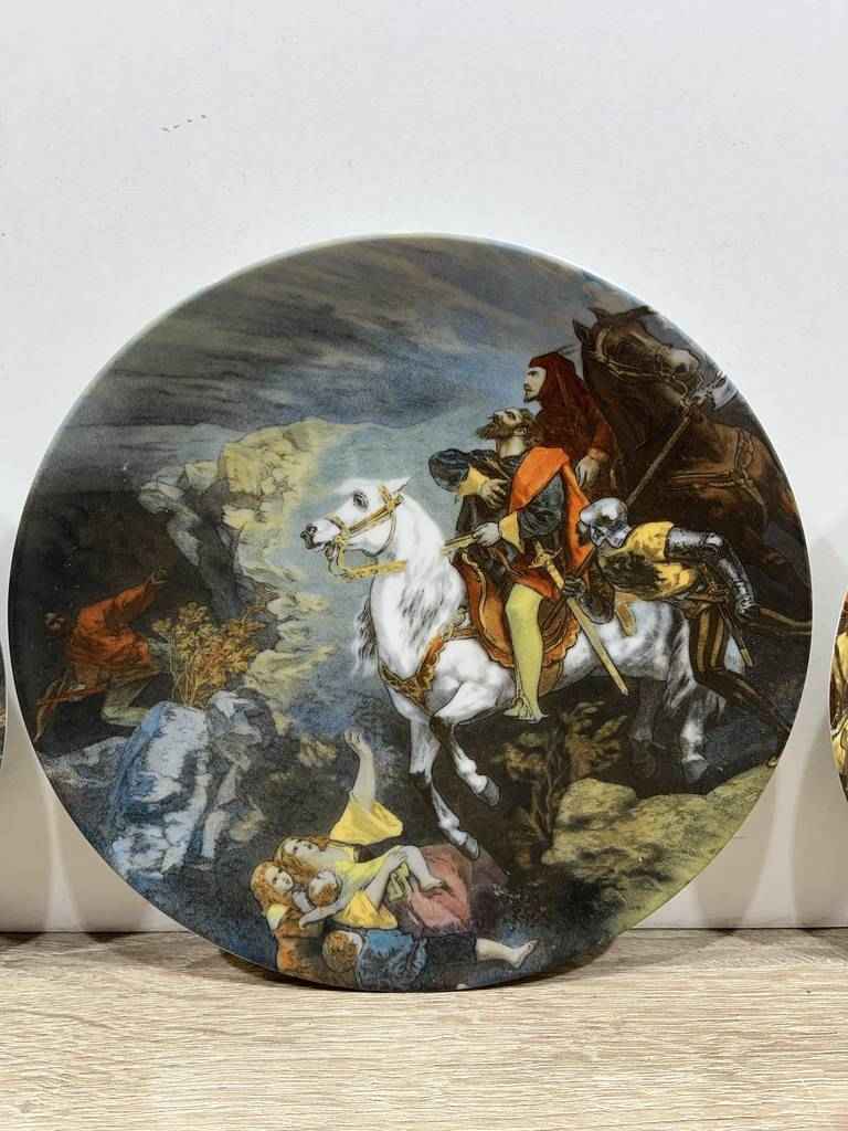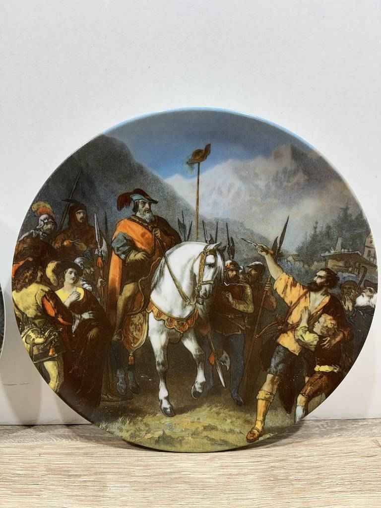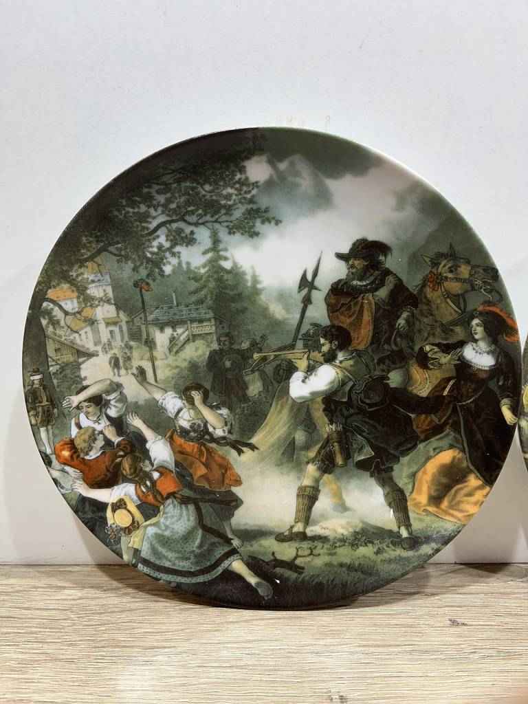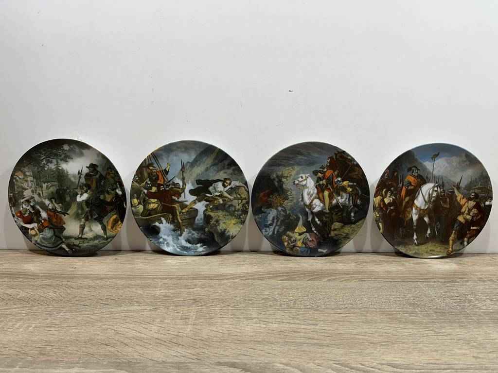 Cuatro platos para colgar en la pared con unas pinturas muy elegantes y sobrias. Cada plato dispone de la representación de un cuadro de época en el que podemos observar múltiples personas peleando en batalla, varios a lomos de un caballo o huyendo de un barco mientras son atacados. Son ideales para colgar en cualquier estancia de nuestra casa y hacerla resaltar. Como podemos observar en las fotografías se encuentran en buenas condiciones.