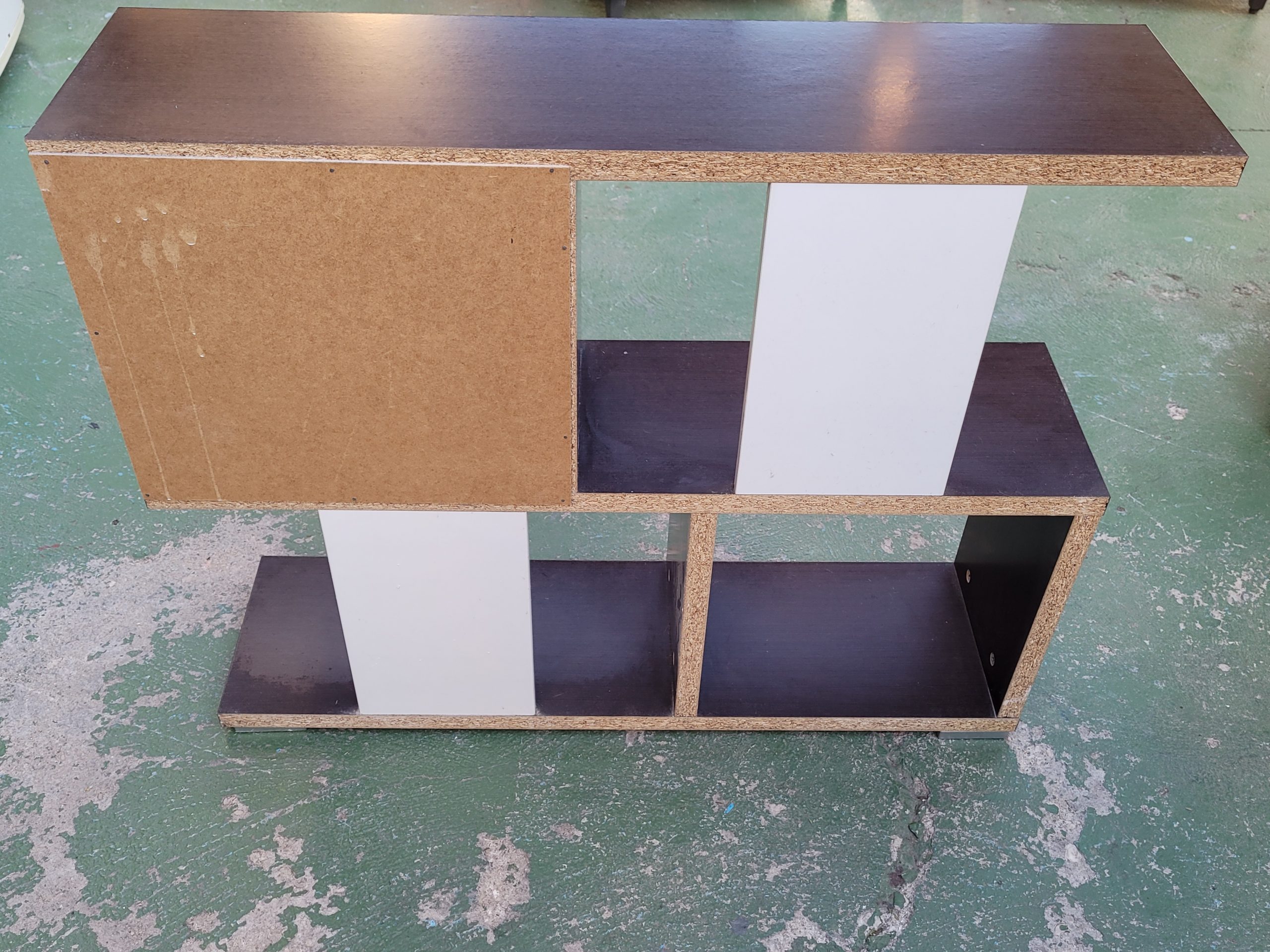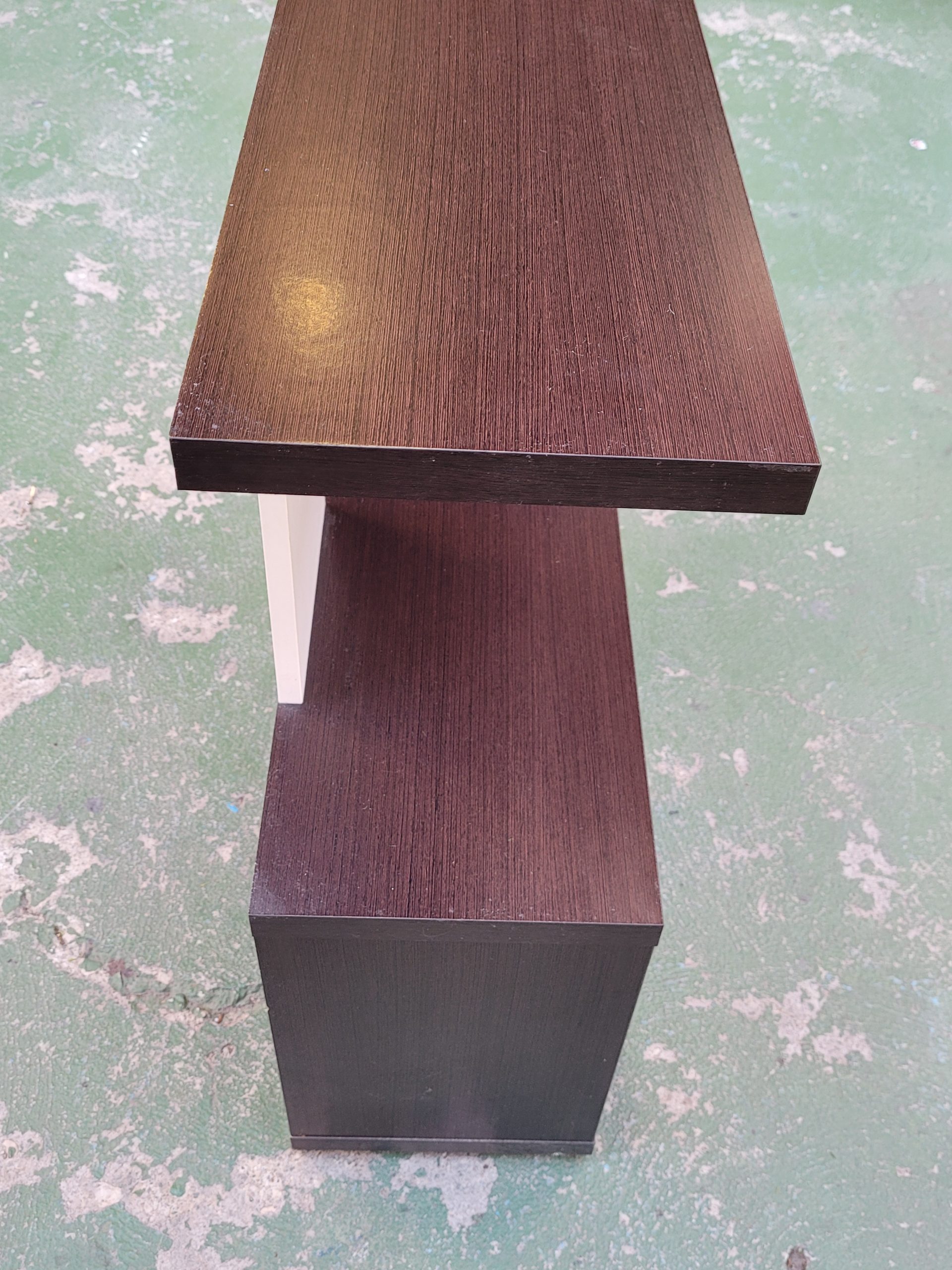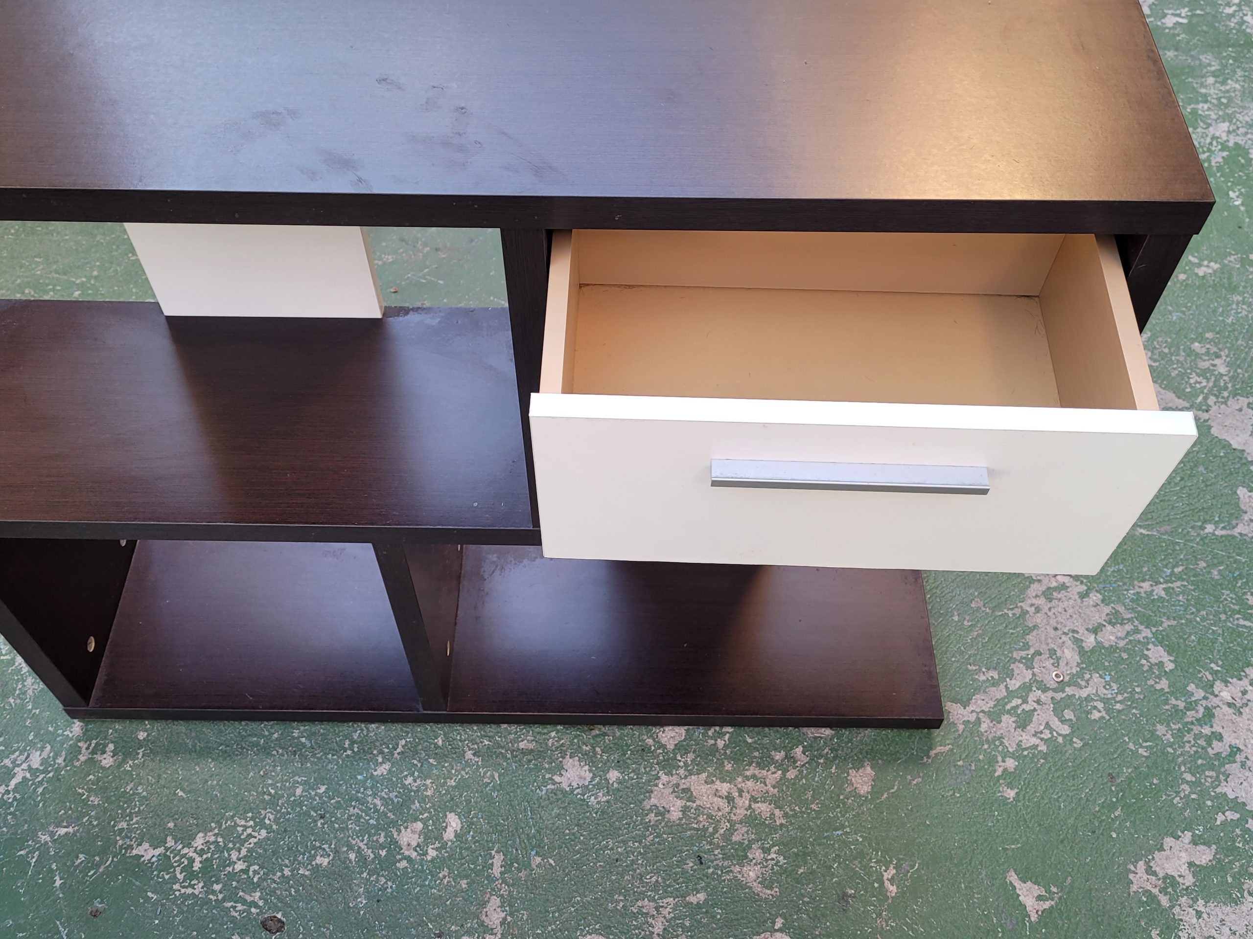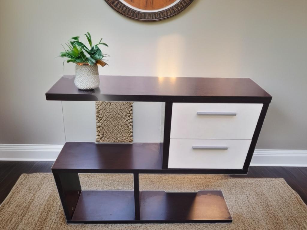 Ref. ✅ O8920 Este recibidor moderno y funcional, es ideal para la entrada de casa o como mueble de TV, con un diseño geométrico asimétrico y colores neutros. La combinación de acabados oscuro (wengué/marrón) y frentes blancos le otorga versatilidad para diversos estilos de decoración. Ofrece una solución de almacenamiento práctica, combinando espacio cerrado en sus dos cajones frontales con tiradores metálicos y compartimentos abiertos (estantes inferiores) para decoración, libros o zapatos. Se destaca por su estética contemporánea y su capacidad para mantener el orden visual, maximizando el espacio de almacenamiento.