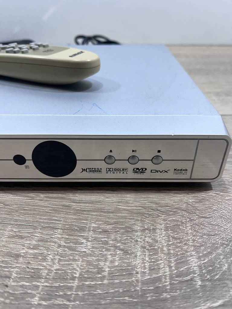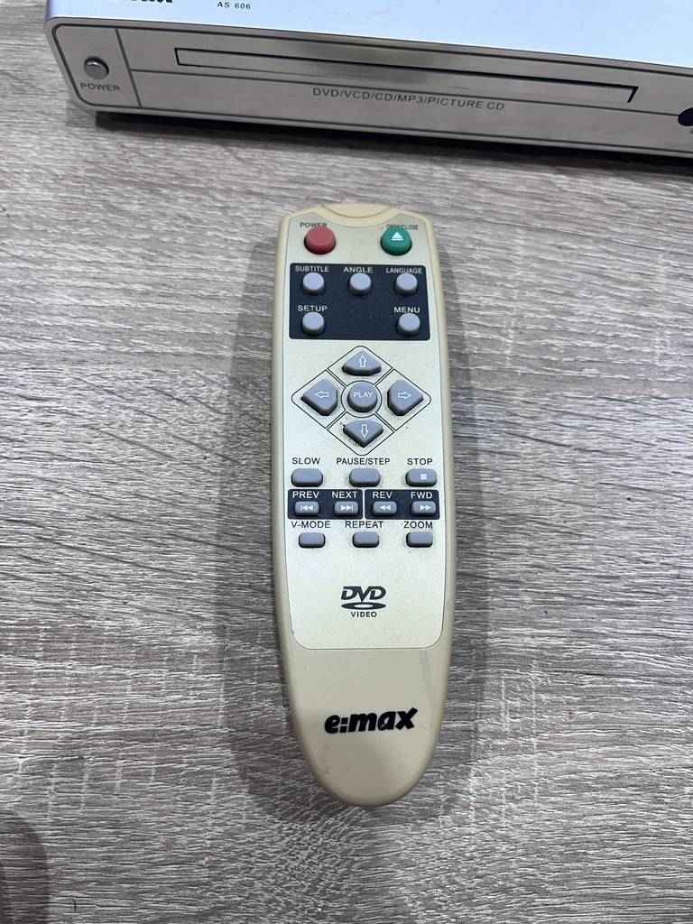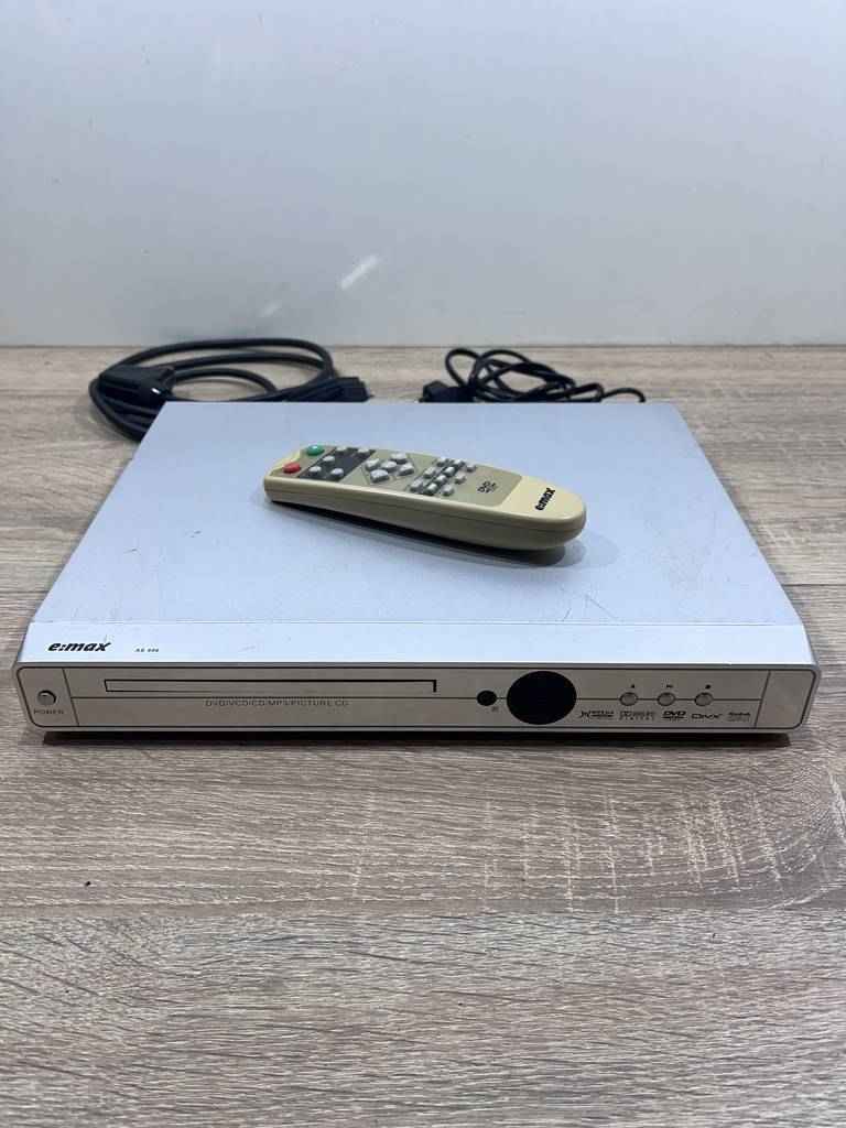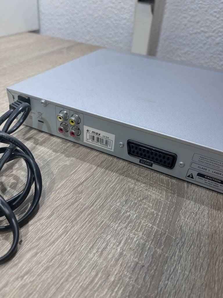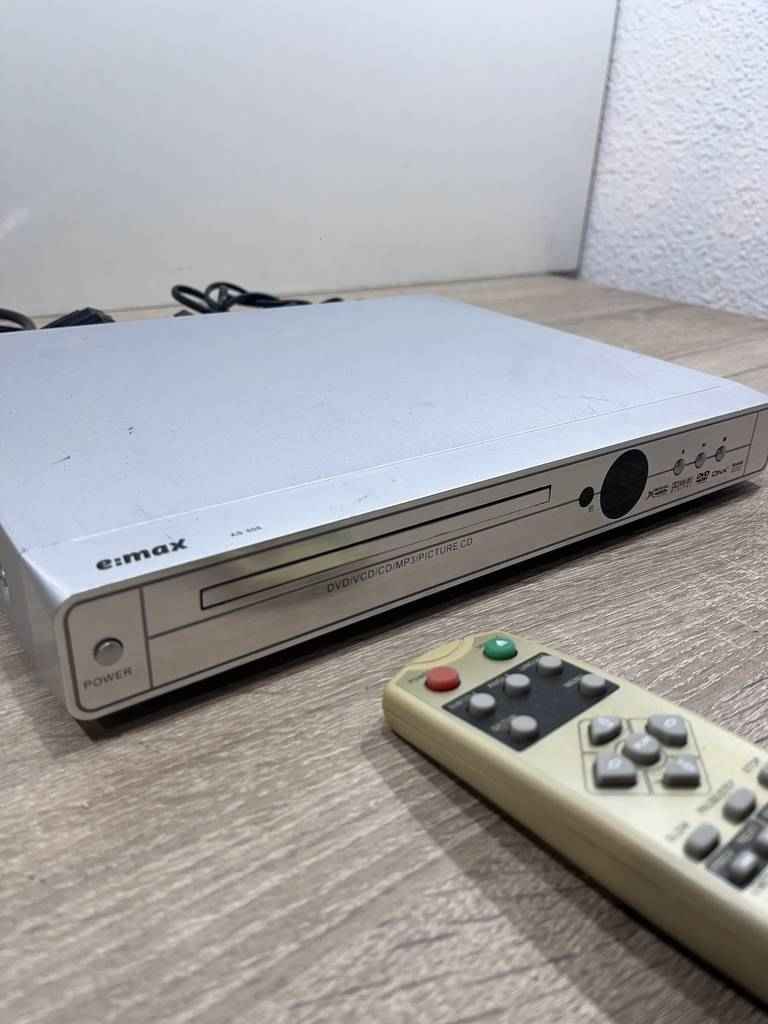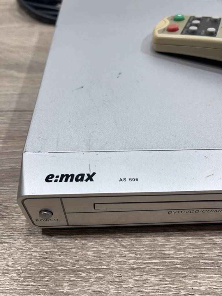 Reproductor de DVD ‘S de la marca E-MAX modelo AS 606. Se trata de un reproductor de muy buena calidad que dispone de opción para reproducir películas en divx y mpeg4. En la parte frontal dispone de botones, para manejarlo fácilmente. También incluye mando con múltiples funcionalidades. Como podemos observar en las fotografías se encuentra algo desgastado, pero funciona correctamente.