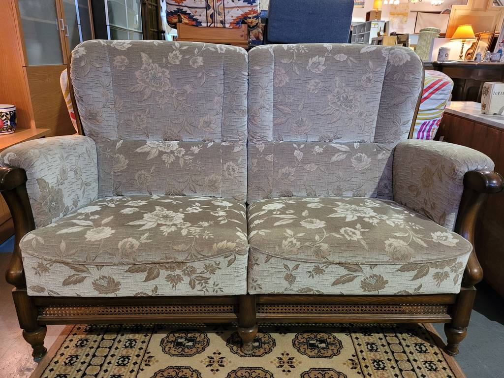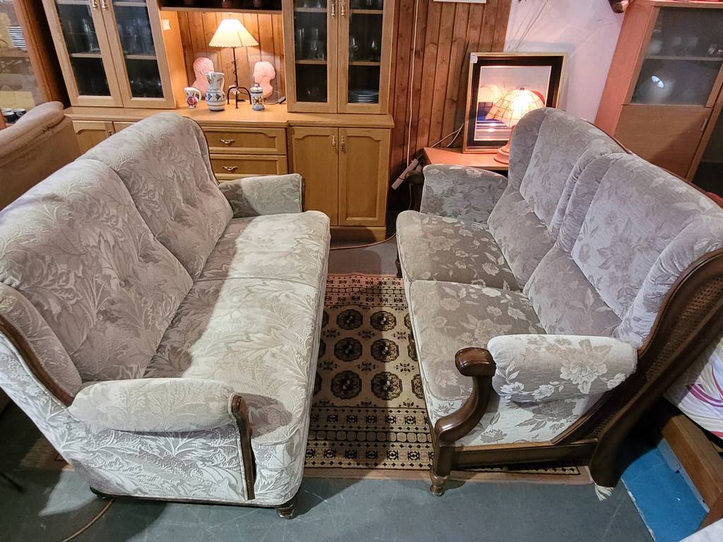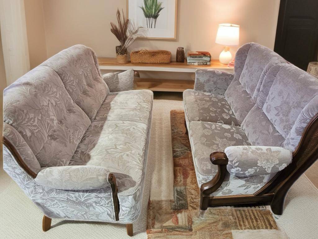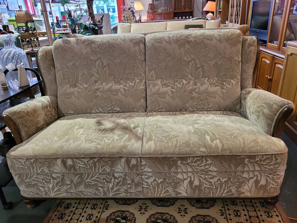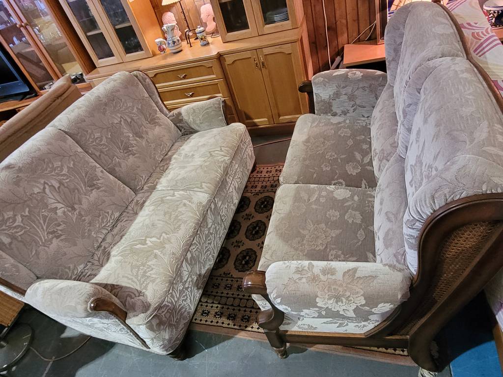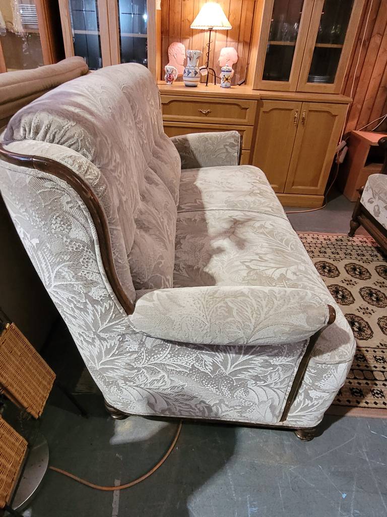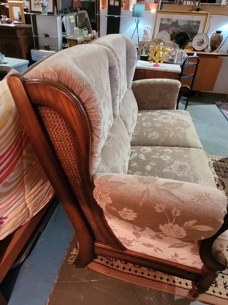 Ref. ✅ O8888 Este es un conjunto de sofás vintage clásicos de tela y madera, ideal para un salón con estilo vintage. El diseño es clásico con detalles de madera vista en los reposabrazos y la base. La tela presenta un elegante patrón floral en tonos neutros (beige/crema/gris), lo que le da un toque distintivo y atemporal. Cuentan con respaldos altos y cojines de asiento mullidos, diseñados para ofrecer un buen confort. Son muebles de segunda mano, pero la estructura y la tapicería parecen estar en buen estado general, listos para darle una segunda oportunidad.