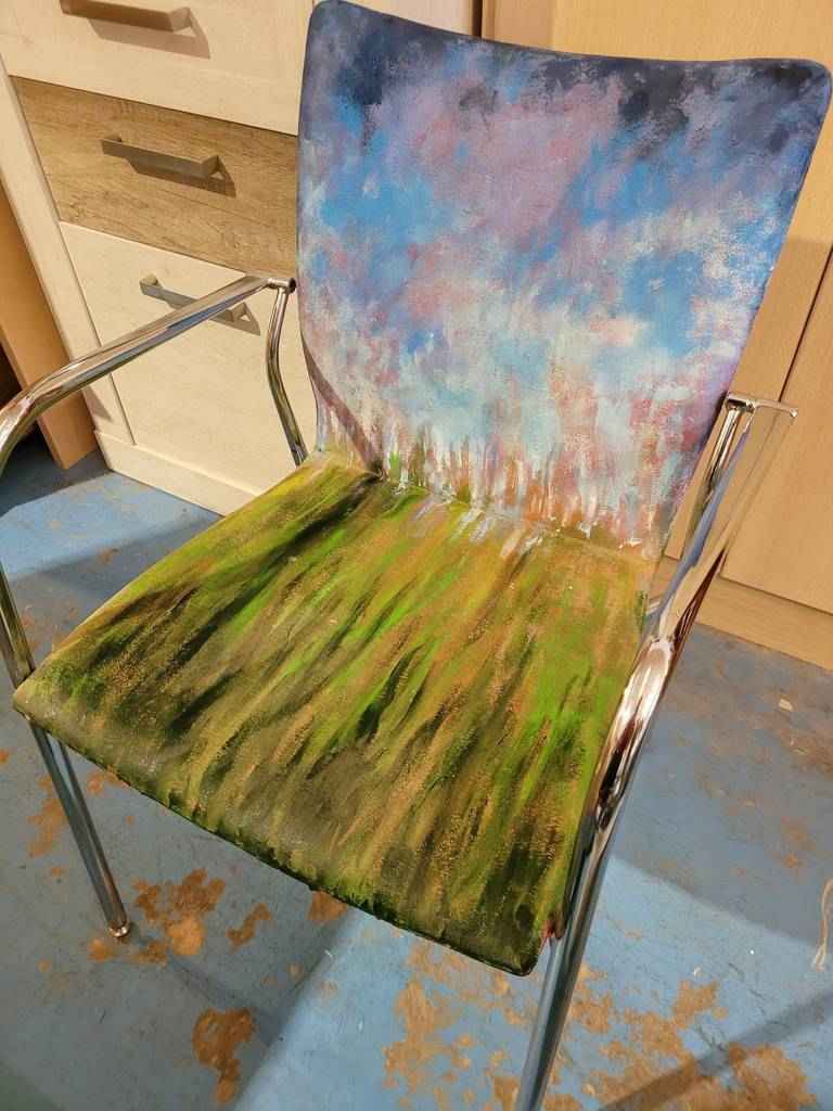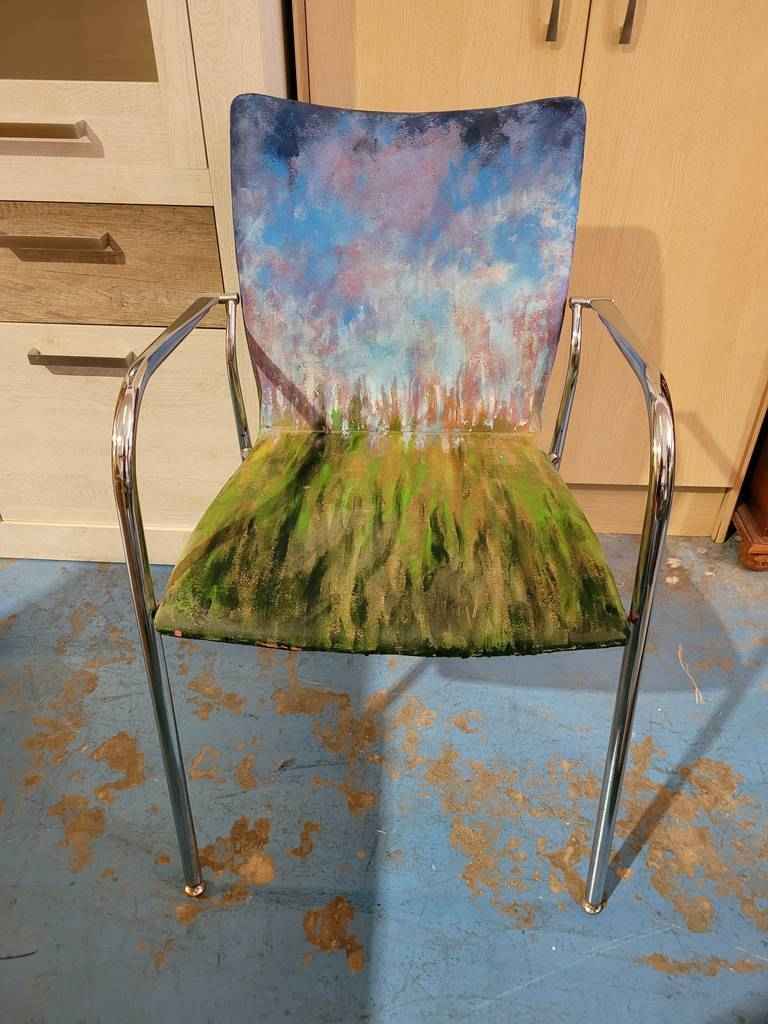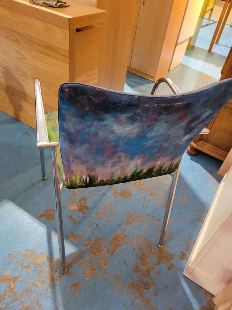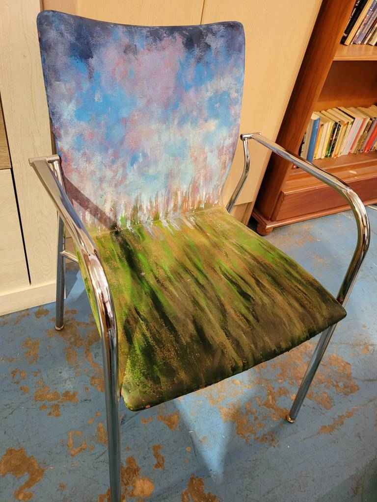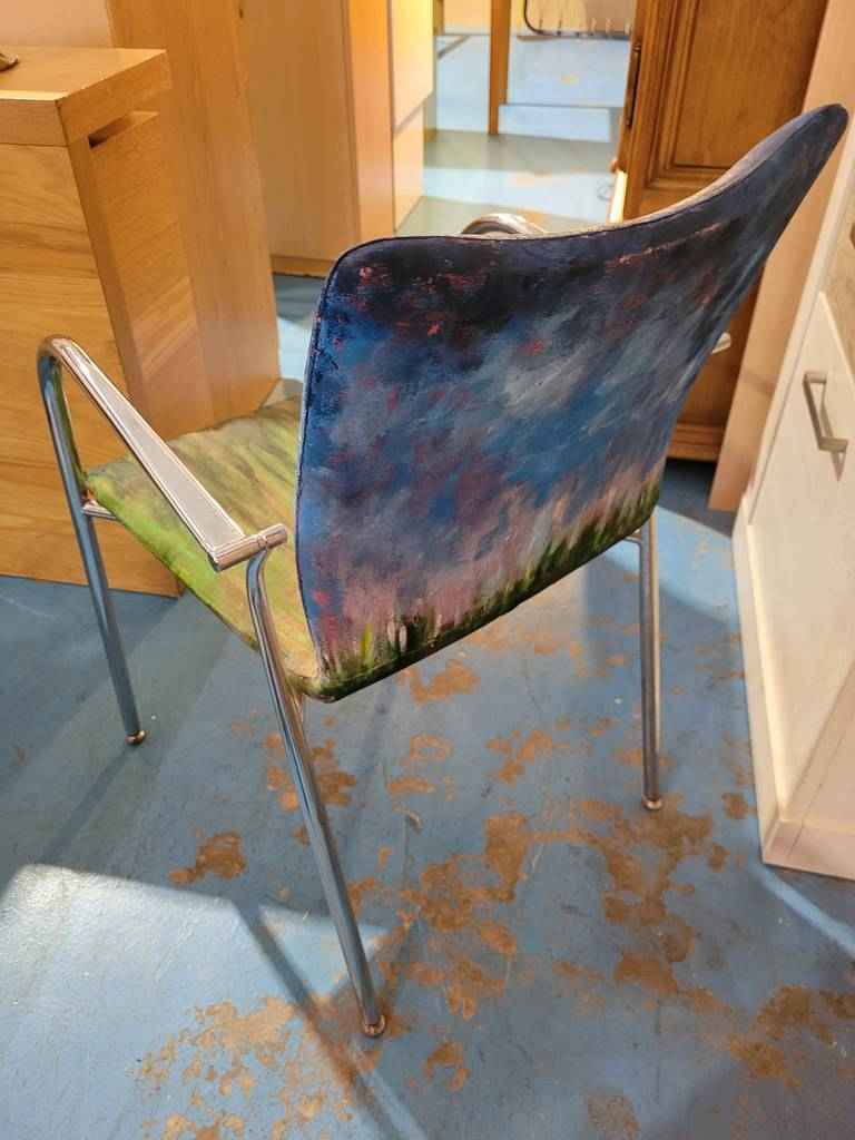 Silla de confidente muy bonita y original que ha sido pintada a mano en acrílico que la hace resaltar. Se trata de una silla única con un asiento y respaldo cómodos y con reposabrazos de metal en los laterales para relajarnos cómodamente. Es ideal para colocar en un salón comedor o también en un estudio. Como podemos observar en las fotografías se encuentra en buenas condiciones.