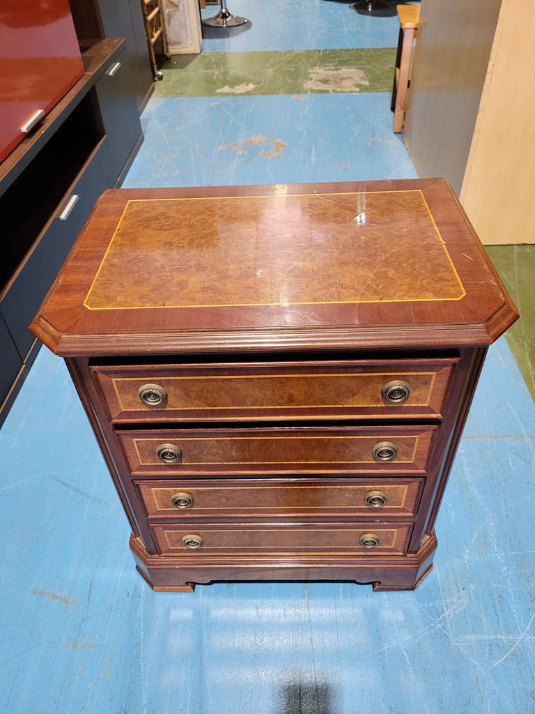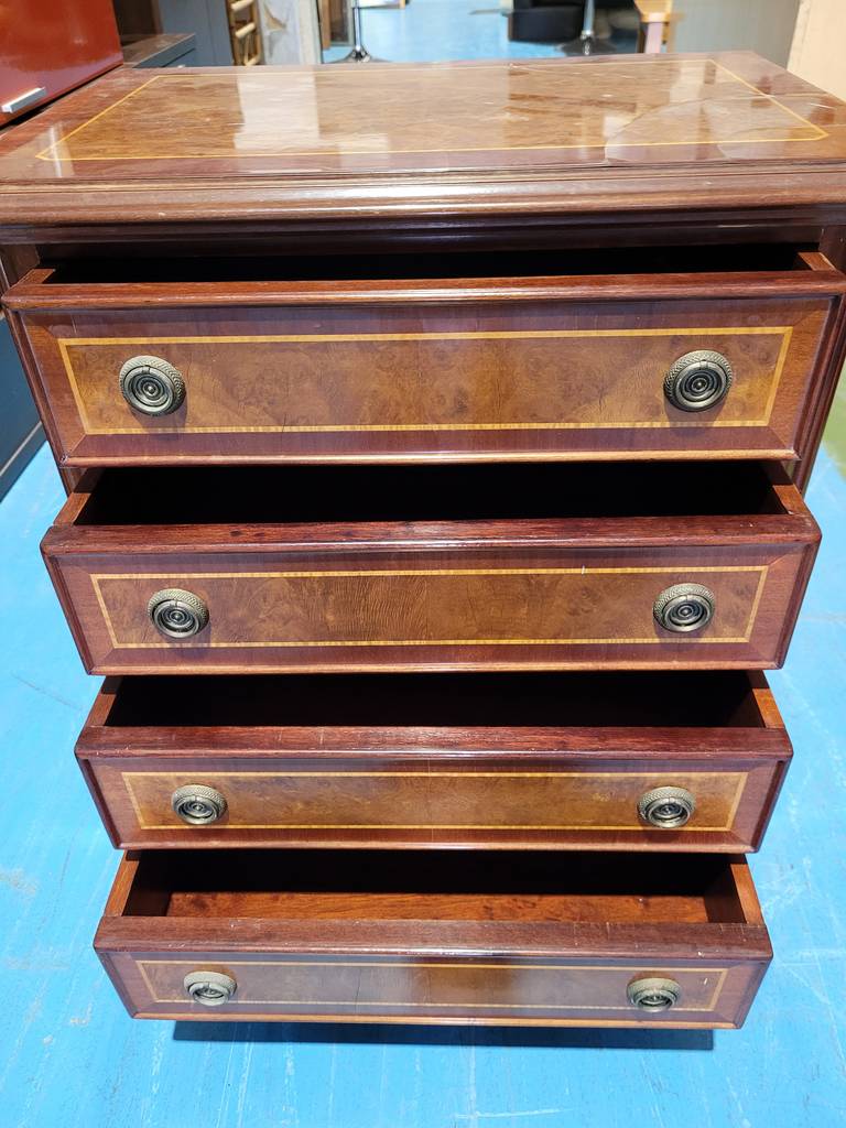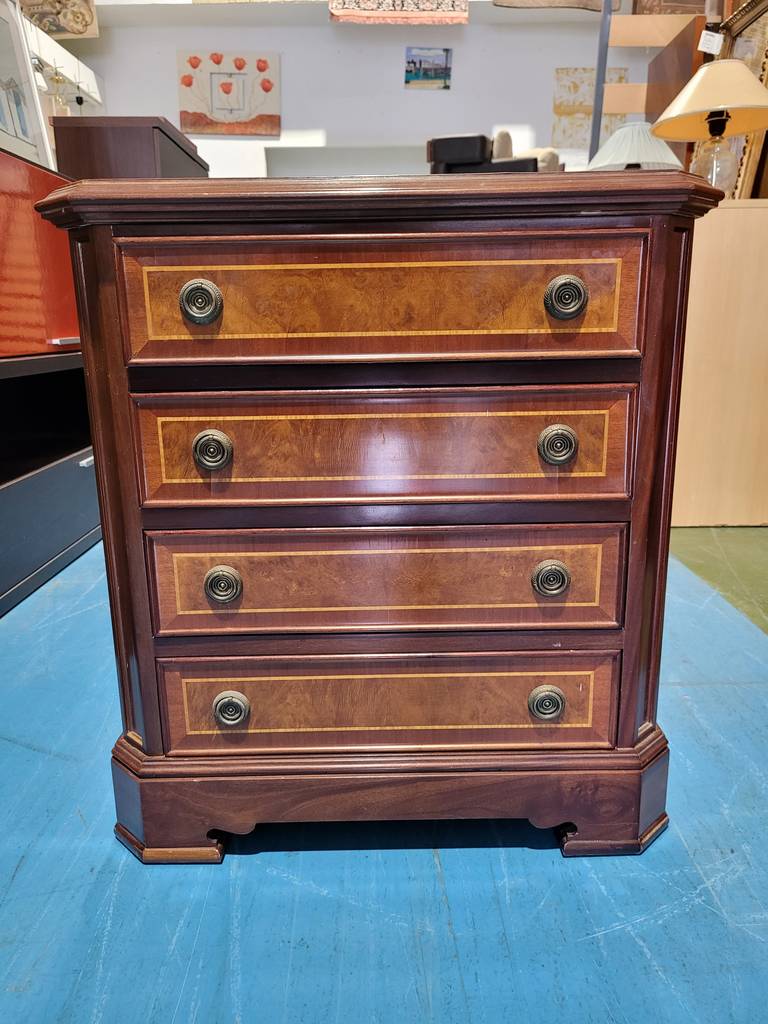 Sinfonier que ha sido realizado con madera de buena calidad y robusta. Se compone de una parte frontal con cuatro cajones que incorporan dobles tiradores para abrirlos fácilmente. Es ideal para colocar en un dormitorio o vestidor y almacenar gran cantidad de ropa interior, por ejemplo. Como podemos observar en las fotografías presenta desperfectos.