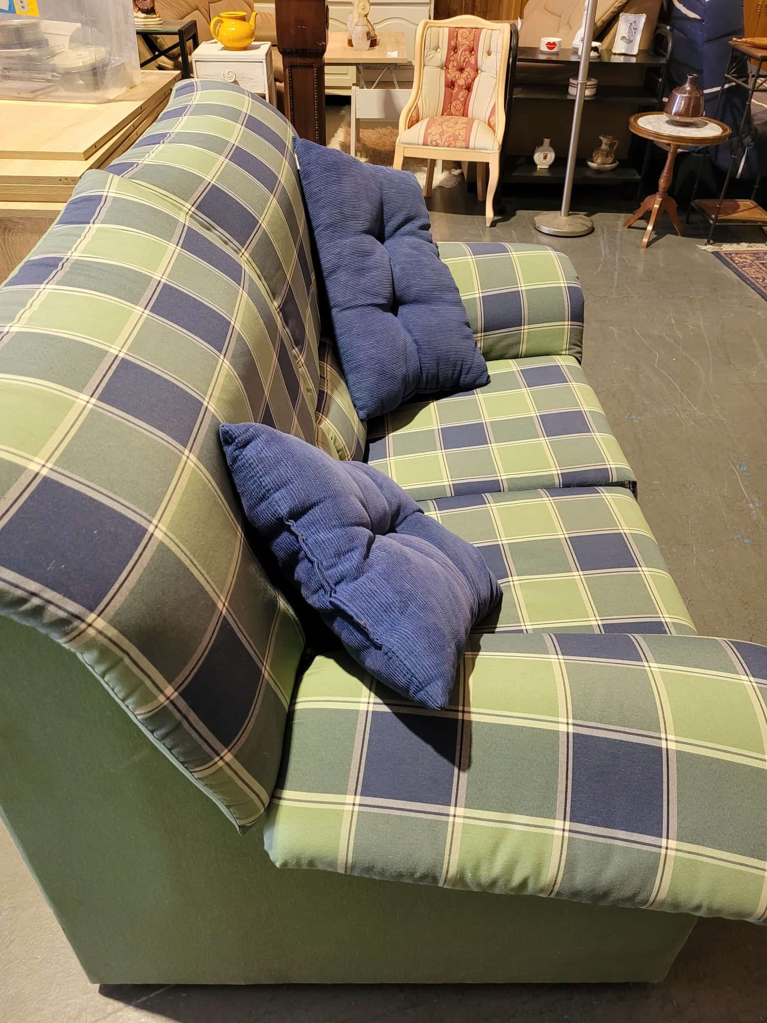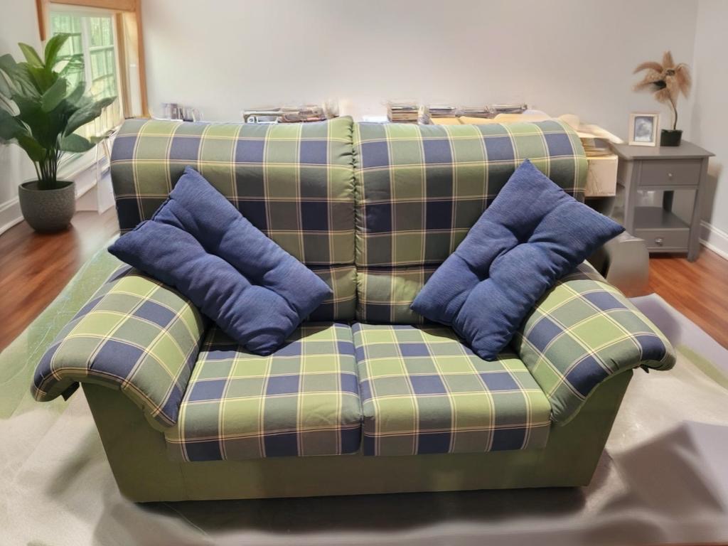 Ref. ✅ O8841 Este sofá de dos plazas de estilo rústico y clásico, tapizado en un llamativo patrón de cuadros escoceses (tartán) en tonos de verde musgo, azul marino y beige. Este mueble ofrece un aspecto acogedor y hogareño, ideal para añadir un toque de encanto campestre o tradicional a cualquier salón, cabaña o espacio de estar. Incluye dos cojines decorativos azules adicionales de asiento sueltos y respaldos acolchados para mayor comodidad. En buen estado y listo para darle una segunda oportunidad.