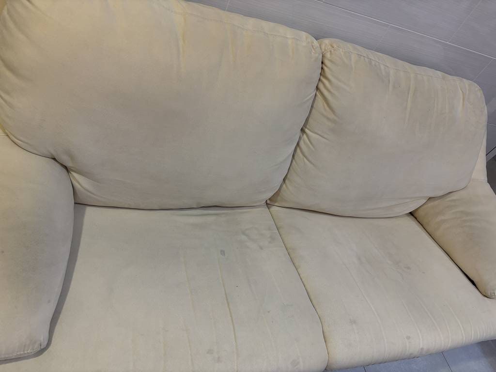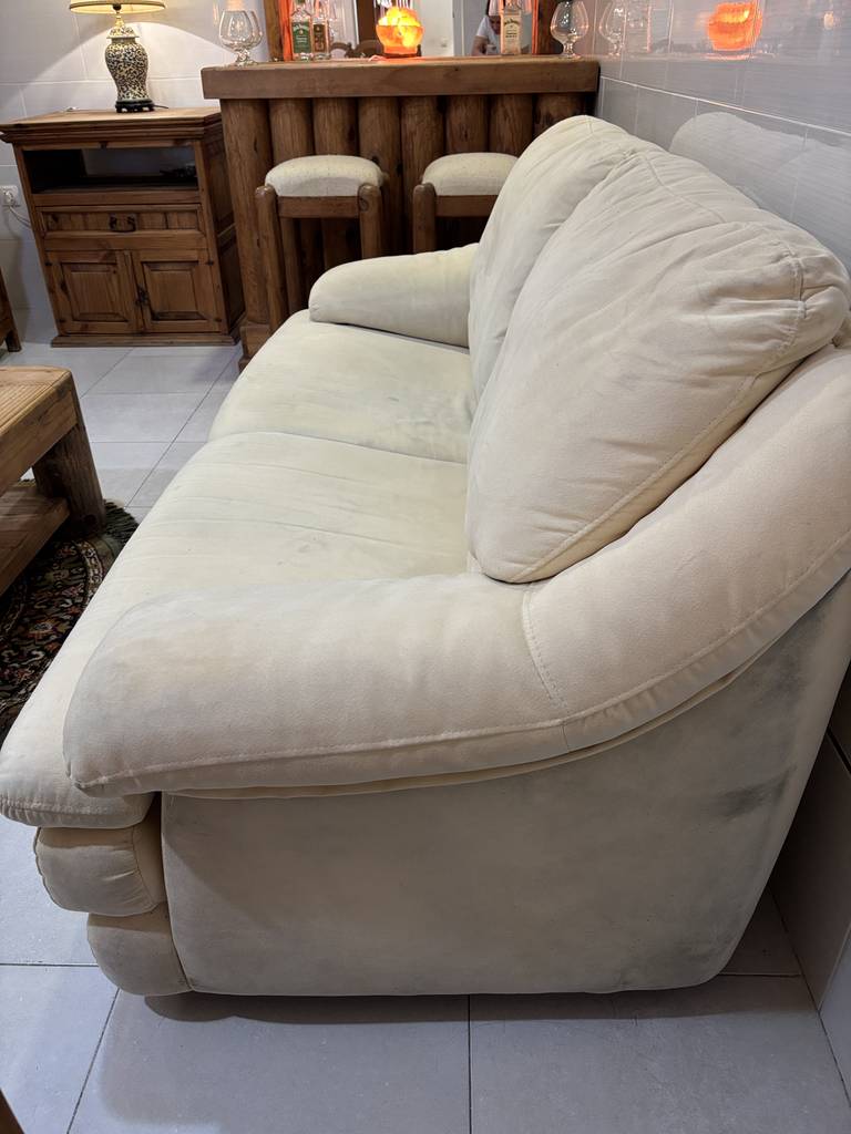 Ref. ✅ O8794 Sofá seccional o modular, compuesto por al menos dos partes (los cojines del asiento y del respaldo están separados). Es un artículo de segunda mano con desgaste general por el uso, lo que se aprecia en algunas marcas o manchas leves en la tela (visible en la imagen). Se recomienda una limpieza profesional para mejorar su aspecto general. La estructura parece robusta y los cojines están acolchados para mayor comodidad.