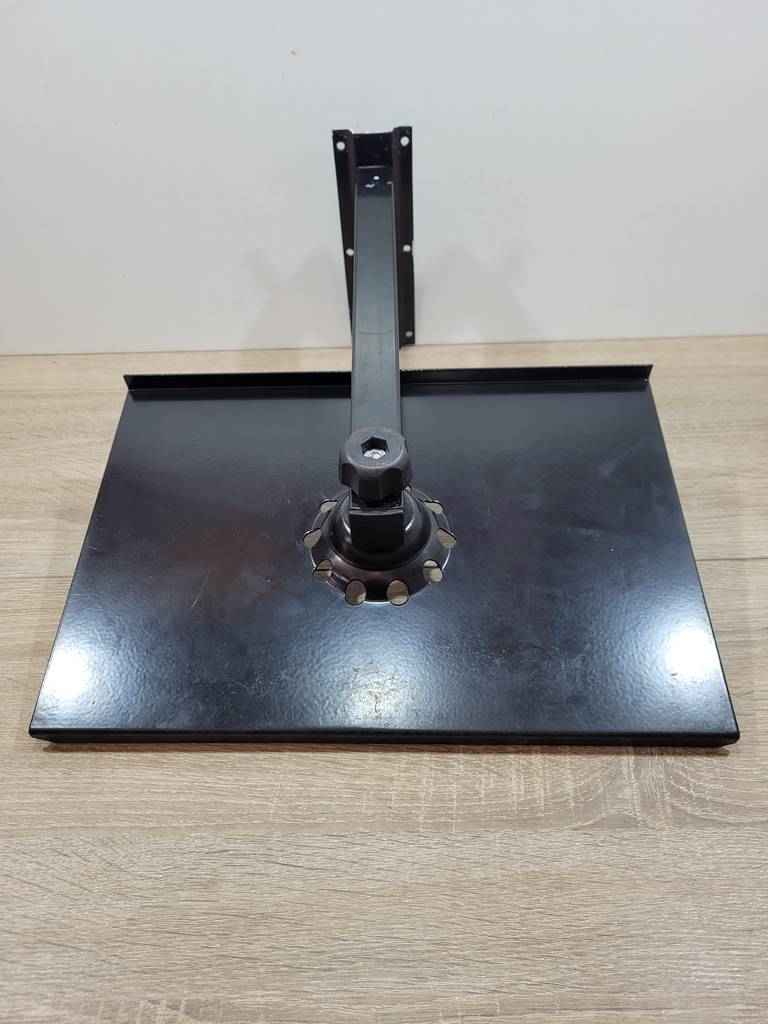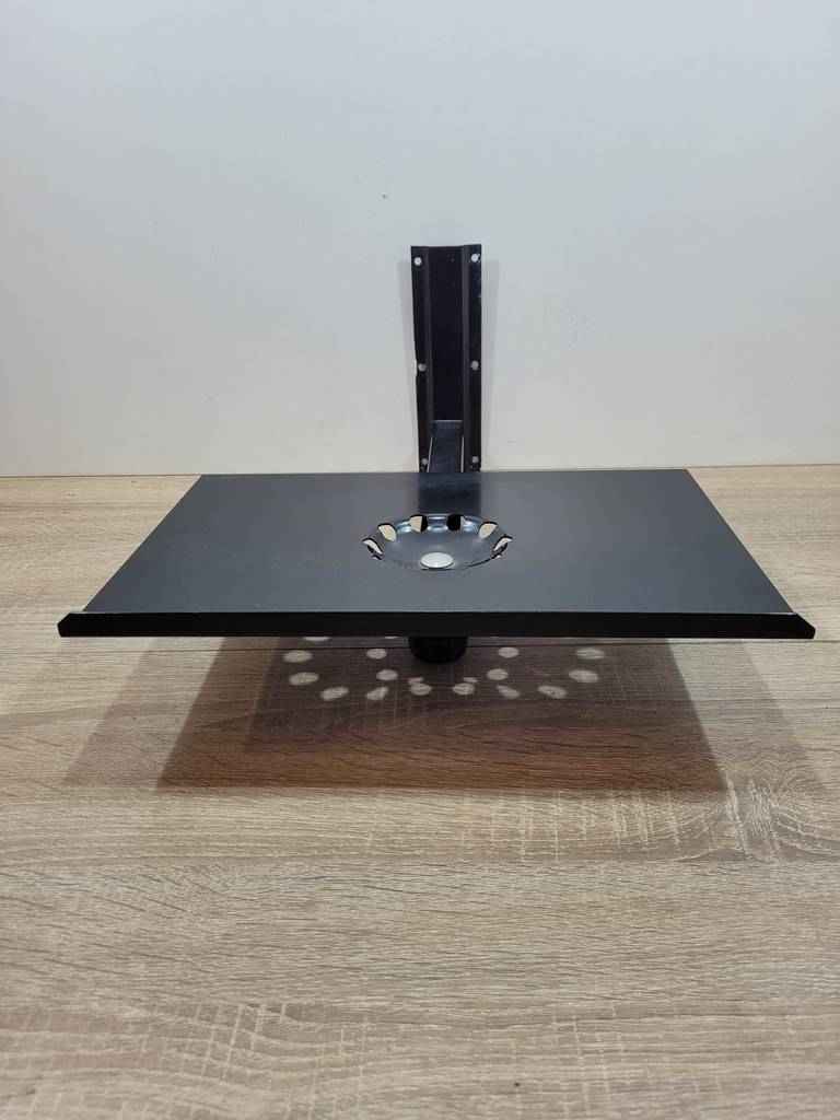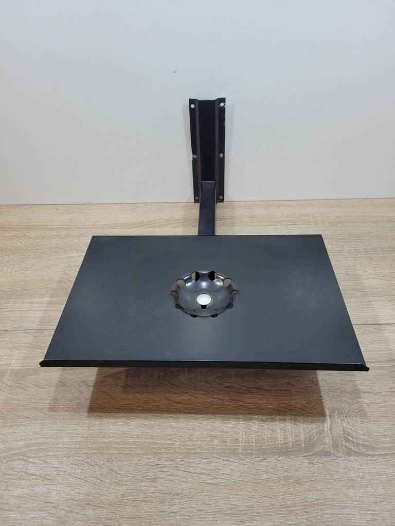 Soporte para televisor que ha sido fabricado con metal oscuro de buena calidad. Dispone de un buen tablón para poner el televisor encima. Le sobresale un brazo que dispone de agujeros para ser anclado o atornillado con la pared. Ideal para una habitación de tamaño medio o cocina. Como podemos observar en las fotografías se encuentra en buenas condiciones.