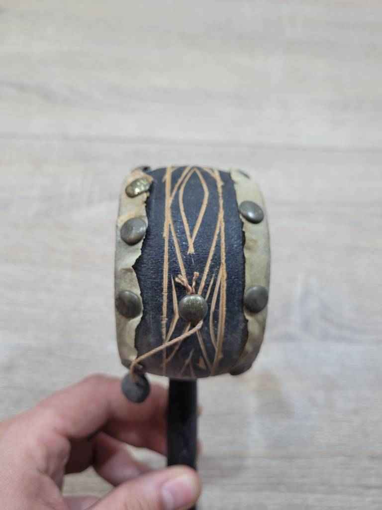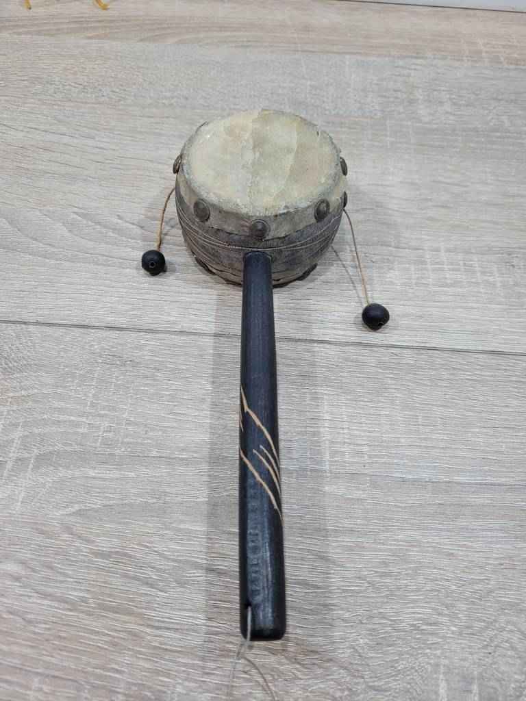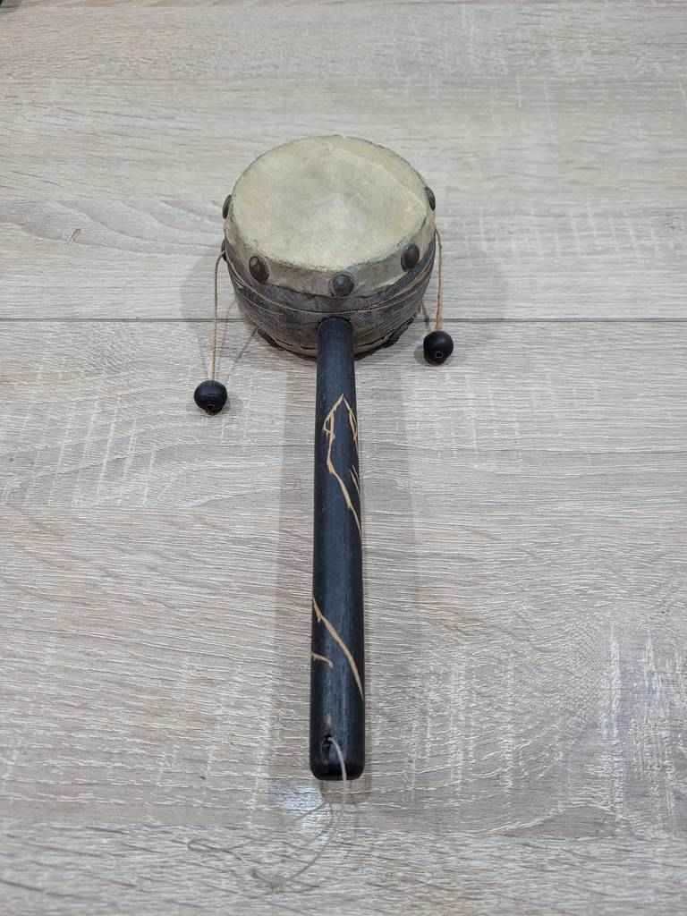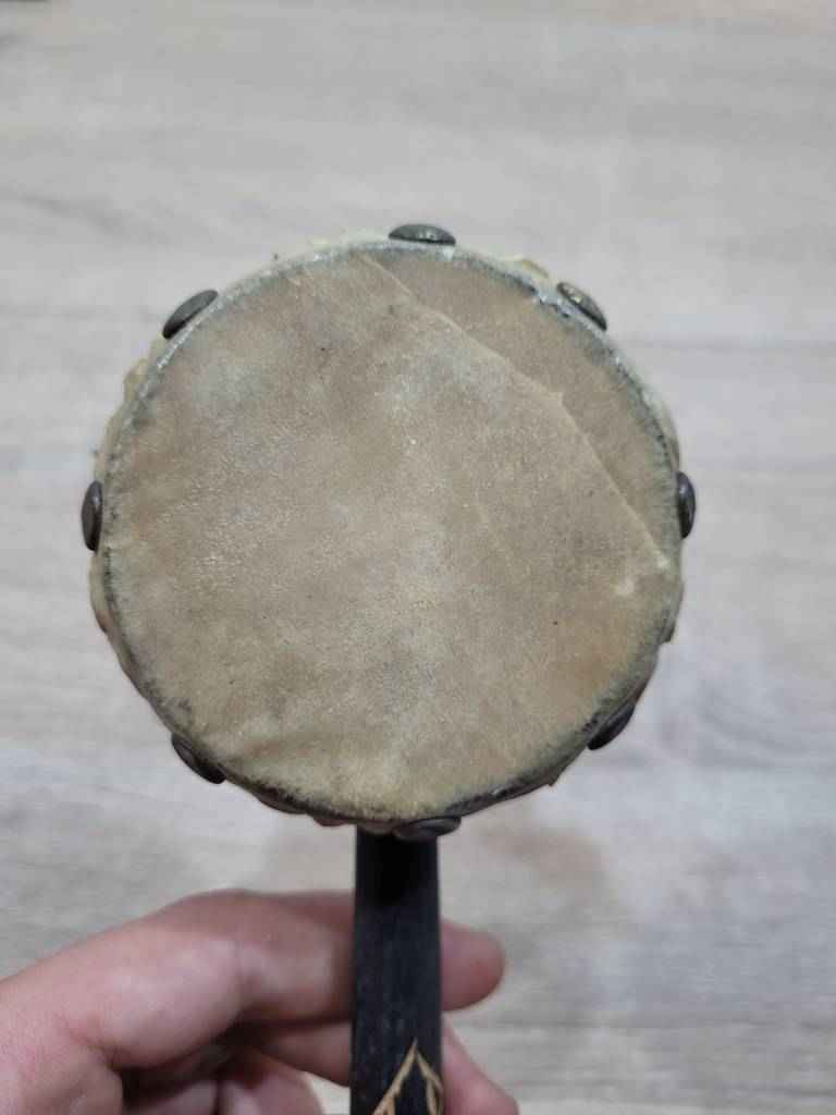 Tambor de mano fabricado de manera artesanal que cuenta con un pequeño mango de color negro para facilitar su agarre. Este instrumento musical de percusión es ideal para los coleccionistas de este tipo de elementos. Como se puede observar en las fotografías se encuentra en buenas condiciones y está en perfecto estado para ser tocado.