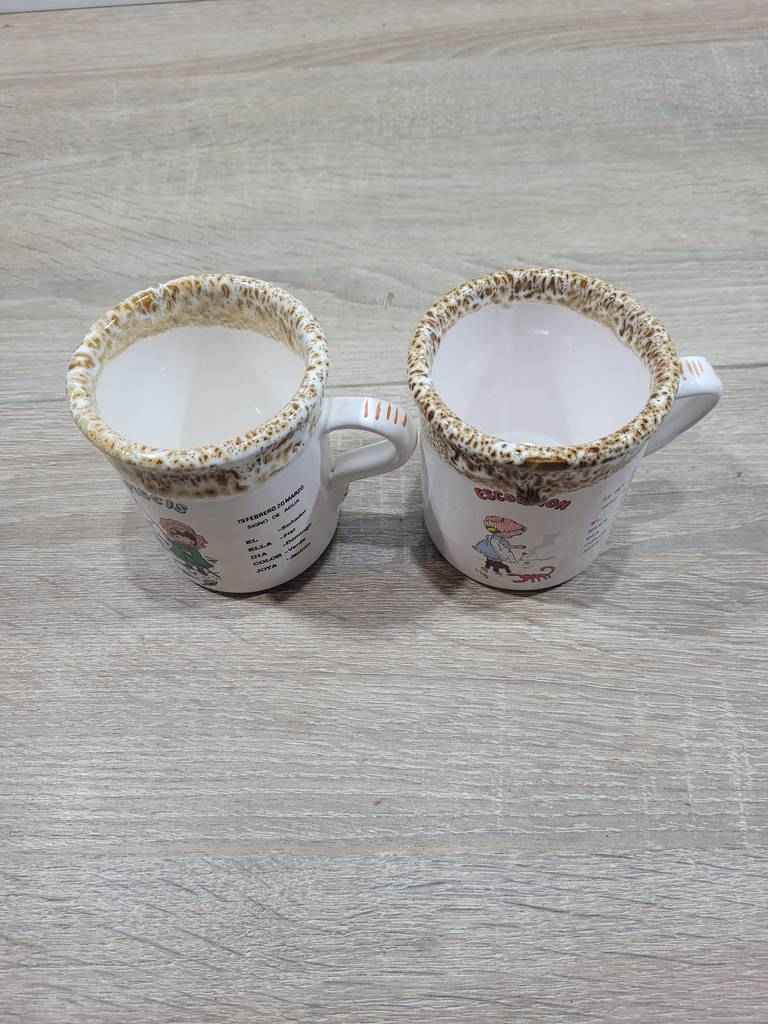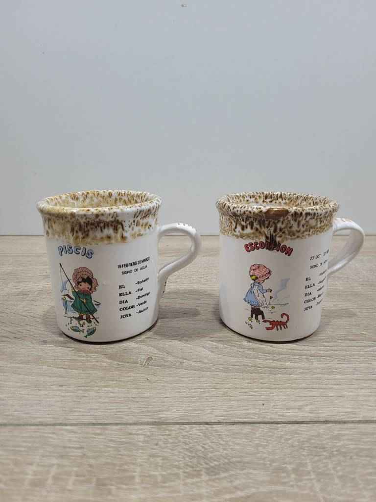 Pareja de dos tazas fabricadas en cerámica de buena calidad. Se trata de dos tazas que cuentan con un asa lateral y tienen dibujos y letras relacionadas con signos del horóscopo. Una de ellas tiene el signo de piscis y la otra el signo de escorpión. Son ideales para que los fanáticos del horóscopo puedan tomar su café de las mañanas. Como se puede observar en las fotografías se encuentran en buenas condiciones.