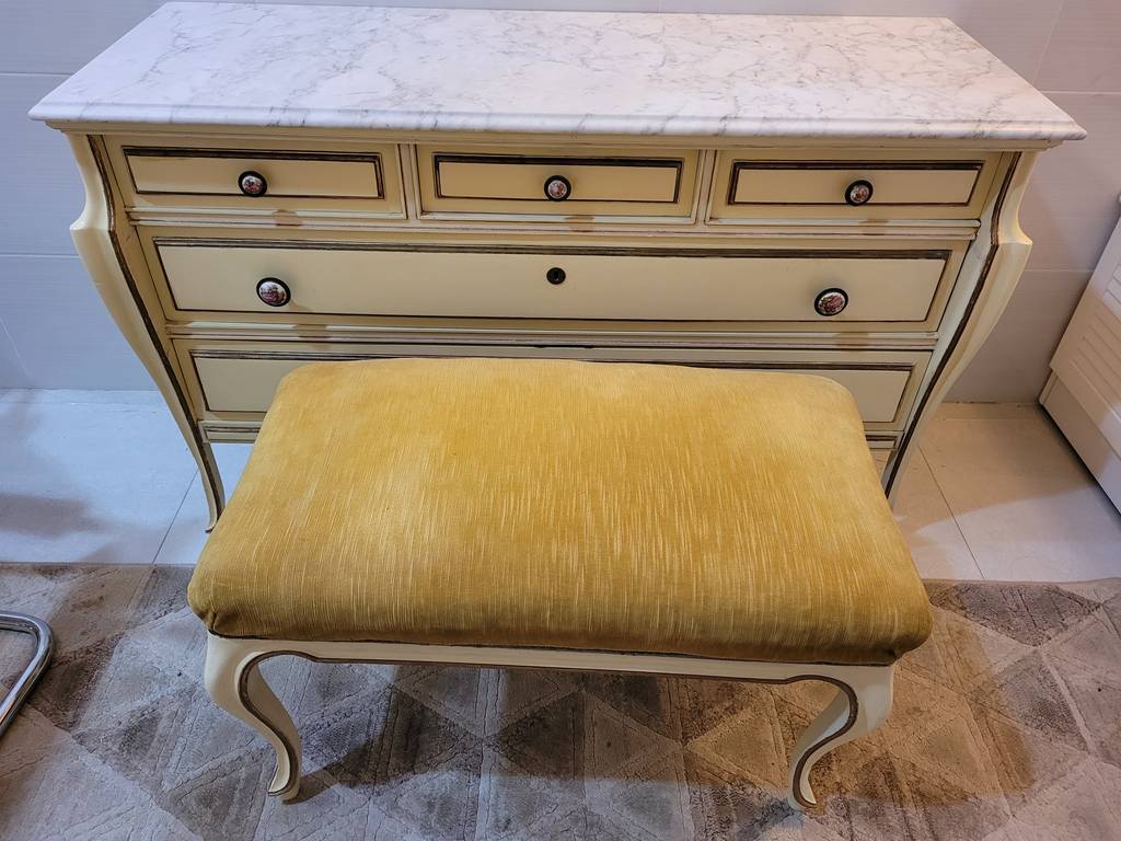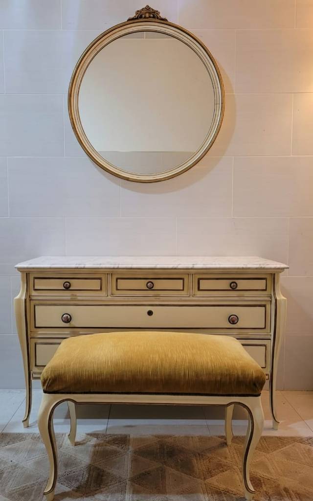 Ref. ✅ O8962 Este es un conjunto de tocador o aparador de estilo clásico, con patas cabriolé curvas y un acabado en color crema o blanco roto con detalles dorados, lo que le otorga un aire vintage y sofisticado. La cómoda cuenta con una elegante tapa de mármol, y la estructura de madera es sólida. Incluye un espejo redondo con marco a juego y una banqueta tapizada en un distintivo terciopelo color mostaza, creando un conjunto armonioso y completo. La cómoda tiene varios cajones (tres superiores y uno central inferior más ancho) con tiradores redondos, proporcionando un amplio almacenamiento. La banqueta es una cómoda descalzadora ideal para un dormitorio o vestidor.