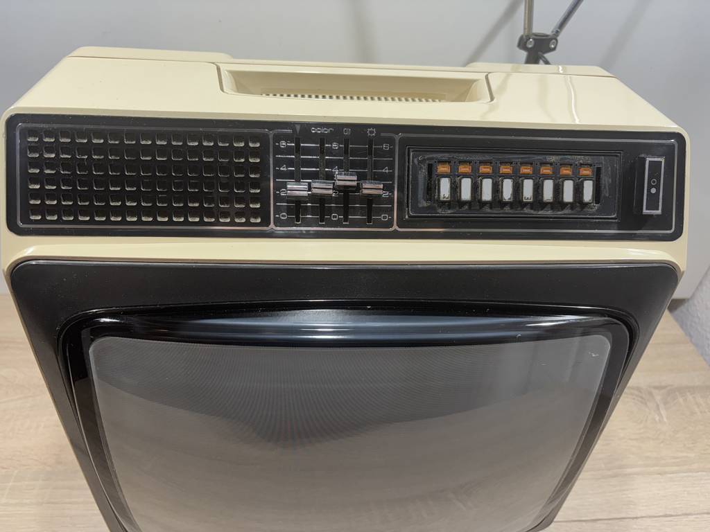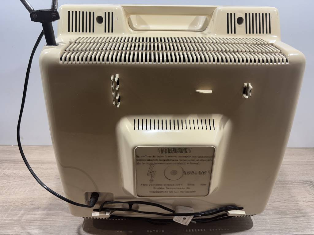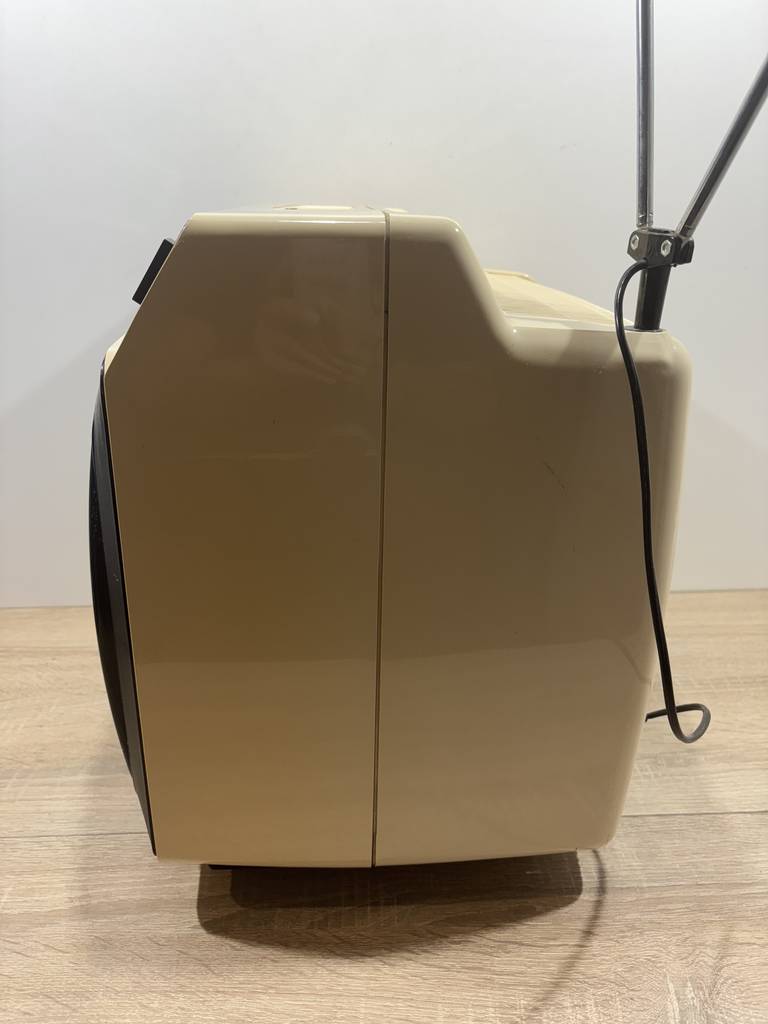 Ref. ✅ O8801 Este es un televisor portátil de la marca española Elbe, un artículo vintage clásico ideal para coleccionistas o para decoración retro. Presenta un diseño icónico de los años 70/80, con carcasa en colores crema y negro. Dispone de controles analógicos y botones pulsadores en el panel frontal para sintonización, volumen y brillo. Originalmente es una televisión analógica a color, pero debido a la transición a la TDT, necesitaría un sintonizador TDT externo para recibir la señal de televisión actual.