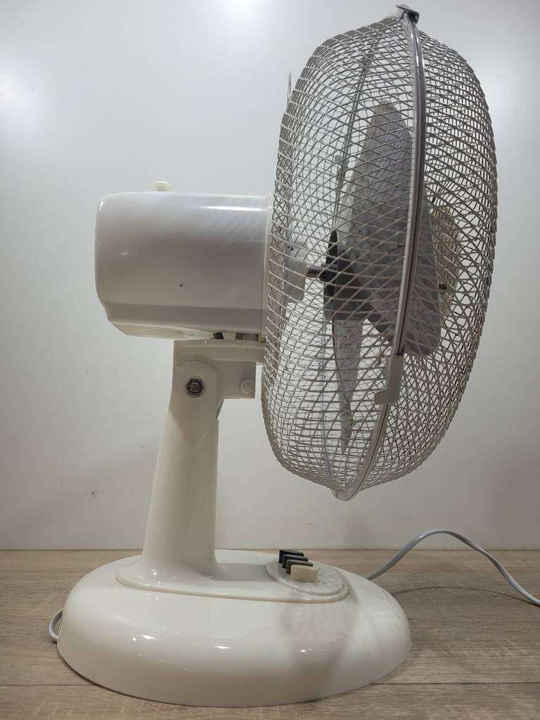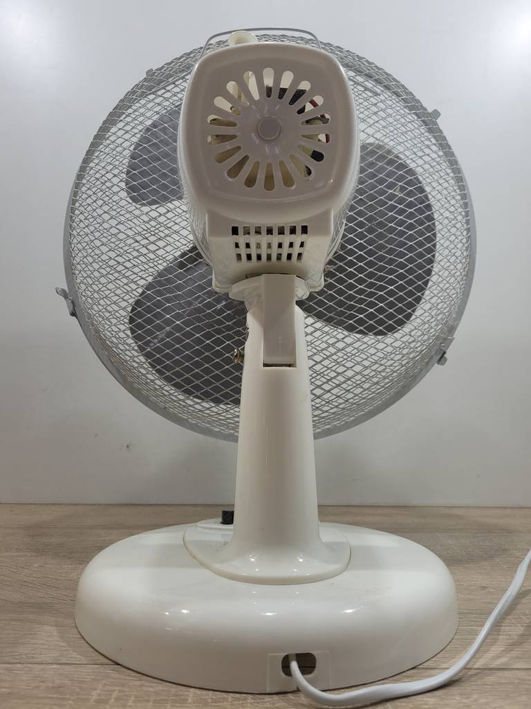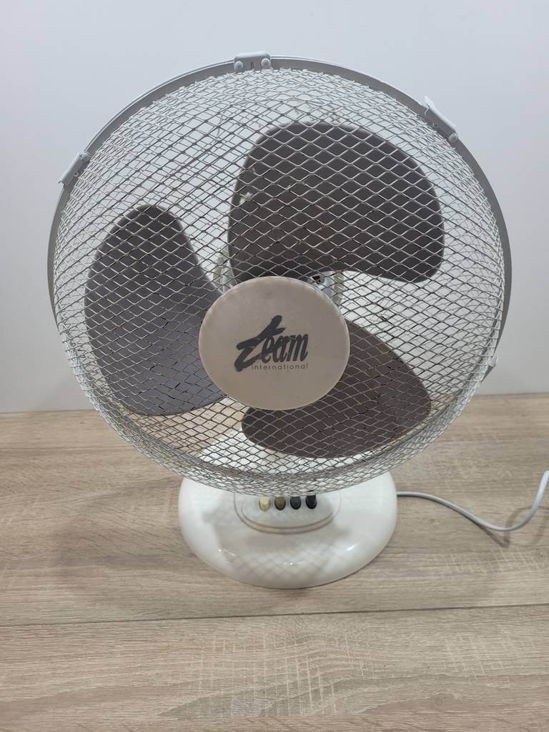 Ventilador de mesa en color blanco de la marca Team international. Se trata de un ventilador de pie. Dispone en la base de diferentes botones con colores del blanco al negro para regular su potencia. Es ideal para colocar encima de una mesa auxiliar en verano. Como podemos observar en las fotografías se encuentra en buenas condiciones.