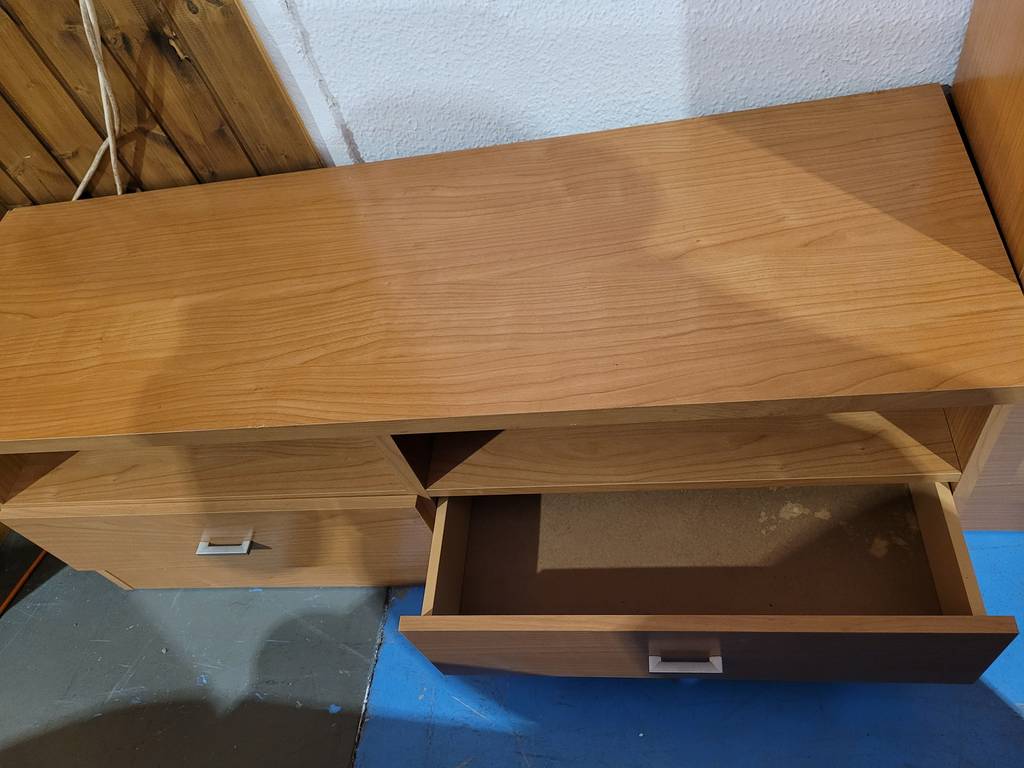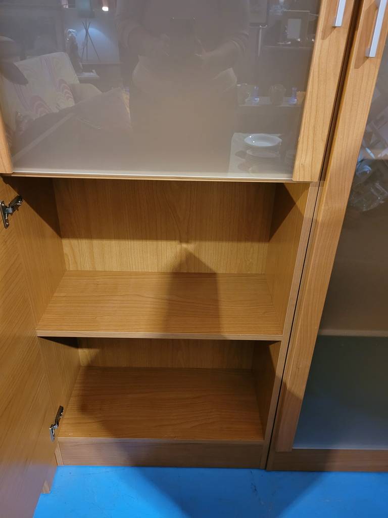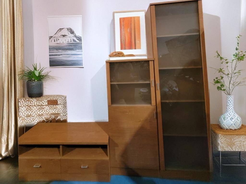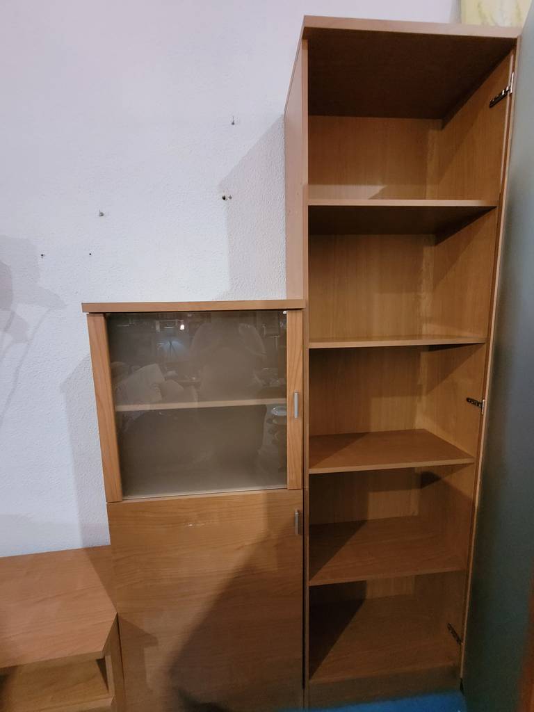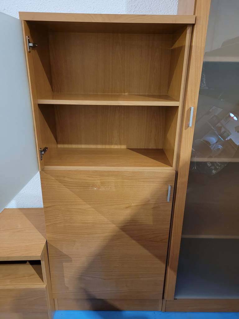 Ref. ✅ O8887 Este es un conjunto modular de muebles de madera que presenta un distintivo estilo moderno, el conjunto se compone de varias unidades separadas: un mueble bajo tipo aparador o mueble para TV con cajones, un módulo vitrina/librería de altura media con puerta de cristal, y una vitrina/armario alto con puerta de cristal corredera. Esto permite una gran versatilidad en la disposición del salón. Cuentan con una combinación práctica de cajones opacos y estantes visibles detrás de puertas de cristal, ideales para almacenamiento y exhibición.